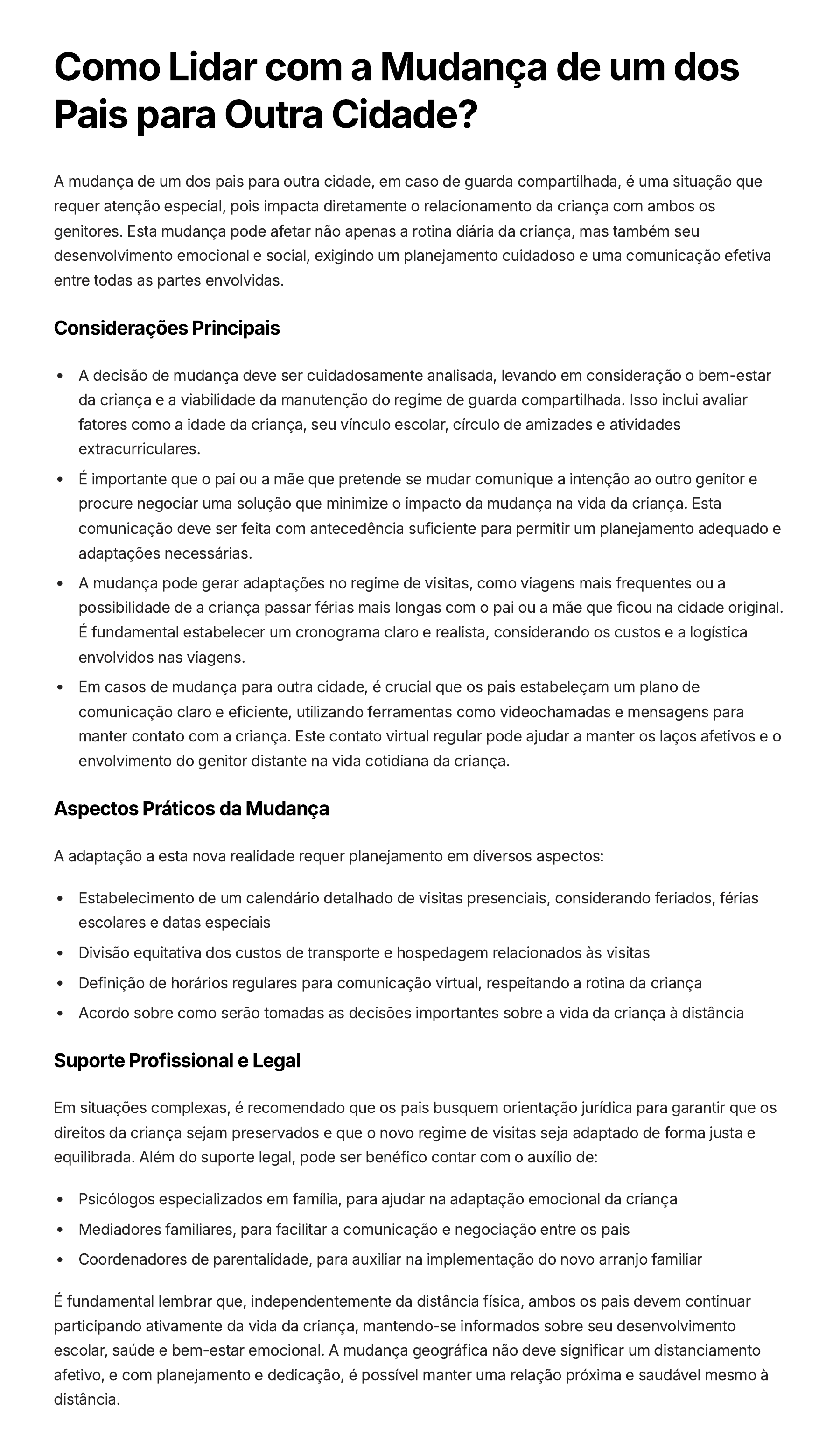 Como Lidar com a Mudança de um dos Pais para Outra Cidade? A mudança de um dos pais para outra cidade, em caso de guarda compartilhada, é uma situação que requer atenção especial, pois impacta diretamente o relacionamento da criança com ambos os genitores. Esta mudança pode afetar não apenas a rotina diária da criança, mas também seu desenvolvimento emocional e social, exigindo um planejamento cuidadoso e uma comunicação efetiva entre todas as partes envolvidas. Considerações Principais A decisão de mudança deve ser cuidadosamente analisada, levando em consideração o bem-estar da criança e a viabilidade da manutenção do regime de guarda compartilhada. Isso inclui avaliar fatores como a idade da criança, seu vínculo escolar, círculo de amizades e atividades extracurriculares. É importante que o pai ou a mãe que pretende se mudar comunique a intenção ao outro genitor e procure negociar uma solução que minimize o impacto da mudança na vida da criança. Esta comunicação deve ser feita com antecedência suficiente para permitir um planejamento adequado e adaptações necessárias. A mudança pode gerar adaptações no regime de visitas, como viagens mais frequentes ou a possibilidade de a criança passar férias mais longas com o pai ou a mãe que ficou na cidade original. É fundamental estabelecer um cronograma claro e realista, considerando os custos e a logística envolvidos nas viagens. Em casos de mudança para outra cidade, é crucial que os pais estabeleçam um plano de comunicação claro e eficiente, utilizando ferramentas como videochamadas e mensagens para manter contato com a criança. Este contato virtual regular pode ajudar a manter os laços afetivos e o envolvimento do genitor distante na vida cotidiana da criança. Aspectos Práticos da Mudança A adaptação a esta nova realidade requer planejamento em diversos aspectos: Estabelecimento de um calendário detalhado de visitas presenciais, considerando feriados, férias escolares e datas especiais Divisão equitativa dos custos de transporte e hospedagem relacionados às visitas Definição de horários regulares para comunicação virtual, respeitando a rotina da criança Acordo sobre como serão tomadas as decisões importantes sobre a vida da criança à distância Suporte Profissional e Legal Em situações complexas, é recomendado que os pais busquem orientação jurídica para garantir que os direitos da criança sejam preservados e que o novo regime de visitas seja adaptado de forma justa e equilibrada. Além do suporte legal, pode ser benéfico contar com o auxílio de: Psicólogos especializados em família, para ajudar na adaptação emocional da criança Mediadores familiares, para facilitar a comunicação e negociação entre os pais Coordenadores de parentalidade, para auxiliar na implementação do novo arranjo familiar É fundamental lembrar que, independentemente da distância física, ambos os pais devem continuar participando ativamente da vida da criança, mantendo-se informados sobre seu desenvolvimento escolar, saúde e bem-estar emocional. A mudança geográfica não deve significar um distanciamento afetivo, e com planejamento e dedicação, é possível manter uma relação próxima e saudável mesmo à distância.