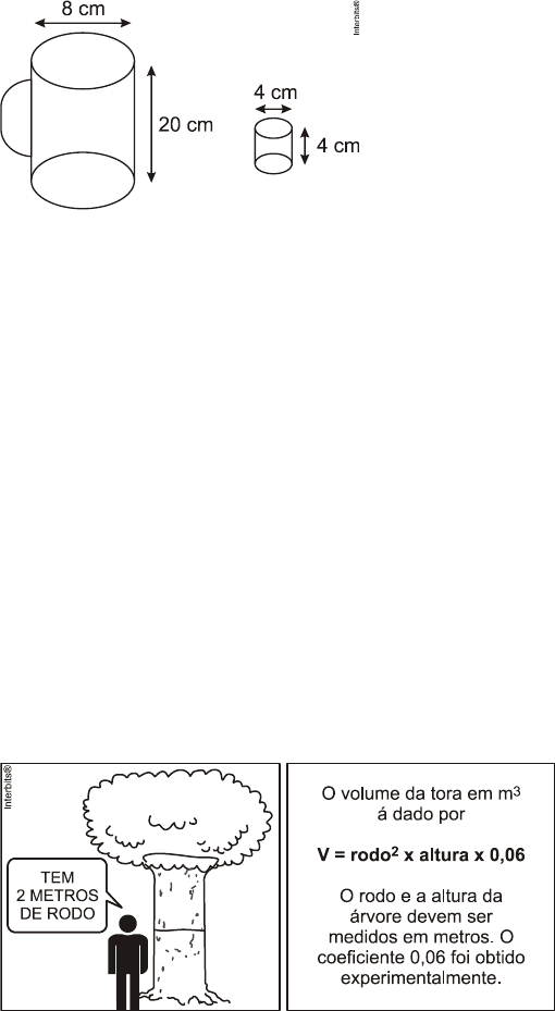 Matemática 02 Página 8 de 60 14. (Enem 2010) Para construir uma manilha de esgoto, um cilindro com 2 m de diâmetro e 4 m de altura (de espessura desprezível), foi envolvido homogeneamente por uma camada de concreto, contendo 20 cm de espessura. Supondo que cada metro cúbico de concreto custe R$ 10,00 e tomando 3,1 como valor aproximado de ð, então o preço dessa manilha é igual a a) R$ 230,40. b) R$ 124,00. c) R$ 104,16. d) R$ 54,56. e) R$ 49,60. 15. (Enem 2010) Dona Maria, diarista na casa da família Teixeira, precisa fazer café para servir as vinte pessoas que se encontram numa reunião na sala. Para fazer o café, Dona Maria dispõe de uma leiteira cilíndrica e copinhos plásticos, também cilíndricos. Com o objetivo de não desperdiçar café, a diarista deseja colocar a quantidade mínima de água na leiteira para encher os vinte copinhos pela metade. Para que isso ocorra, Dona Maria deverá a) encher a leiteira até a metade, pois ela tem um volume 20 vezes maior que o volume do copo. b) encher a leiteira toda de água, pois ela tem um volume 20 vezes maior que o volume do copo. c) encher a leiteira toda de água, pois ela tem um volume 10 vezes maior que o volume do copo. d) encher duas leiteiras de água, pois ela tem um volume 10 vezes maior que o volume do copo. e) encher cinco leiteiras de água, pois ela tem um volume 10 vezes maior que o volume do copo. 16. (Enem 2010) No manejo sustentável de florestas, é preciso muitas vezes obter o volume da tora que pode ser obtida a partir de uma árvore. Para isso, existe um método prático, em que se mede a circunferência da árvore à altura do peito de um homem (1,30 m), conforme indicado na figura. A essa medida denomina-se "rodo" da árvore. O quadro a seguir indica a fórmula para se cubar, ou seja, obter o volume da tora em m3 a partir da medida do rodo e da altura da árvore. Um técnico em manejo florestal recebeu a missão de cubar, abater e transportar cinco toras de madeira, de duas espécies diferentes, sendo Matemática 02 Página 9 de 60 • 3 toras da espécie I, com 3 m de rodo, 12 m de comprimento e densidade 0,77 toneladas/m3; • 2 toras da espécie II, com 4 m de rodo, 10 m de comprimento e densidade 0,78 toneladas/m3. Após realizar seus cálculos, o técnico solicitou que enviassem caminhões para transportar uma carga de, aproximadamente, a) 29,9 toneladas. b) 31,1 toneladas. c) 32,4 toneladas. d) 35,3 toneladas. e) 41,8 toneladas. 17. (Enem 2010) Em um casamento, os donos da festa serviam champanhe aos seus convidados em taças com formato de um hemisfério (Figura 1), porém um acidente na cozinha culminou na quebra de grande parte desses recipientes. Para substituir as taças quebradas, utilizou-se um outro tipo com formato de cone (Figura 2). No entanto, os noivos solicitaram que o volume de champanhe nos dois tipos de taças fosse igual. Considere: 3 2 esfera cone 4 1 V R e V R h 3 3 Sabendo que a taça com o formato de hemisfério e servida completamente cheia, a altura do volume de champanhe que deve ser colocado na outra taça, em centímetros, é de a) 1,33. b) 6,00. c) 12,00. d) 56,52. e) 113,04. 18. (Enem 2010) A figura a seguir é a representação de uma região por meio de curvas de nível, que são curvas fechadas representando a altitude da região, com relação ao nível do mar. As coordenadas estão expressas em graus de acordo com a longitude, no eixo horizontal, e a latitude, no eixo vertical. A escala em tons de cinza desenhada à direita está associada à altitude da região. Matemática 02 Página 10 de 60 Um pequeno helicóptero usado para reconhecimento sobrevoa a região a partir do ponto X = (20; 60). O helicóptero segue o percurso: 0,8°L 0,5°N 0,2° O 0,1° S 0,4° N 0,3 °L De acordo com as orientações, o helicóptero pousou em um local cuja altitude é a) menor ou igual a 200 m. b) maior que 200 m e menor ou igual a 400 m. c) maior que 400 m e menor ou igual a 600 m. d) maior que 600 m e menor ou igual a 800 m. e) maior que 800 m. 19. (Enem 2010) Uma escola recebeu do governo uma verba de R$ 1000,00 para enviar dois tipos de folhetos pelo correio. O diretor da escola pesquisou que tipos de selos deveriam ser utilizados. Concluiu que, para o primeiro tipo de folheto, bastava um selo de R$ 0,65 enquanto para folhetos do segundo tipo seriam necessários três selos, um de R$ 0,65, um de R$ 0,60 e um de R$ 0,20. O diretor solicitou que se comprassem selos de modo que fossem postados exatamente 500 folhetos do segundo tipo e uma quantidade restante de selos que permitisse o envio do máximo possível de folhetos do primeiro tipo. Quantos selos de R$ 0,65 foram comprados? a) 476 b) 675 c) 923 d) 965 e) 1 538 20. (Enem 2010) O Salto Triplo é uma modalidade do atletismo em que o atleta dá um salto em um só pé, uma passada e um salto, nessa ordem. Sendo que o salto com impulsão em um só pé será feito de modo que o atleta caia primeiro sobre o mesmo pé que deu a impulsão; na passada ele cairá com o outro pé, do qual o salto é realizado. Disponível em: www.cbat.org.br (adaptado). Um atleta da modalidade Salto Triplo, depois de estudar seus movimentos, percebeu que, do segundo para o primeiro salto, o alcance diminuía em 1,2 m, e, do terceiro para o segundo salto, o alcance diminuía 1,5 m. Querendo atingir a meta de 17,4 m nessa prova e considerando os seus estudos, a distância alcançada no primeiro salto teria de estar entre a) 4,0 m e 5,0 m. b) 5,0 m e 6,0 m. c) 6,0 m e 7,0 m. d) 7,0 m e 8,0 m. e) 8,0 m e 9,0 m. 21. (Enem 2010) Em canteiros de obras de construção civil é comum perceber trabalhadores realizando medidas de comprimento e de ângulos e fazendo demarcações por onde a obra deve começar ou se erguer. Em um desses canteiros foram feitas algumas marcas no chão plano. Foi possível perceber que, das seis estacas colocadas, três eram vértices de um triângulo retângulo e as outras três eram os pontos médios dos lados desse triângulo,
