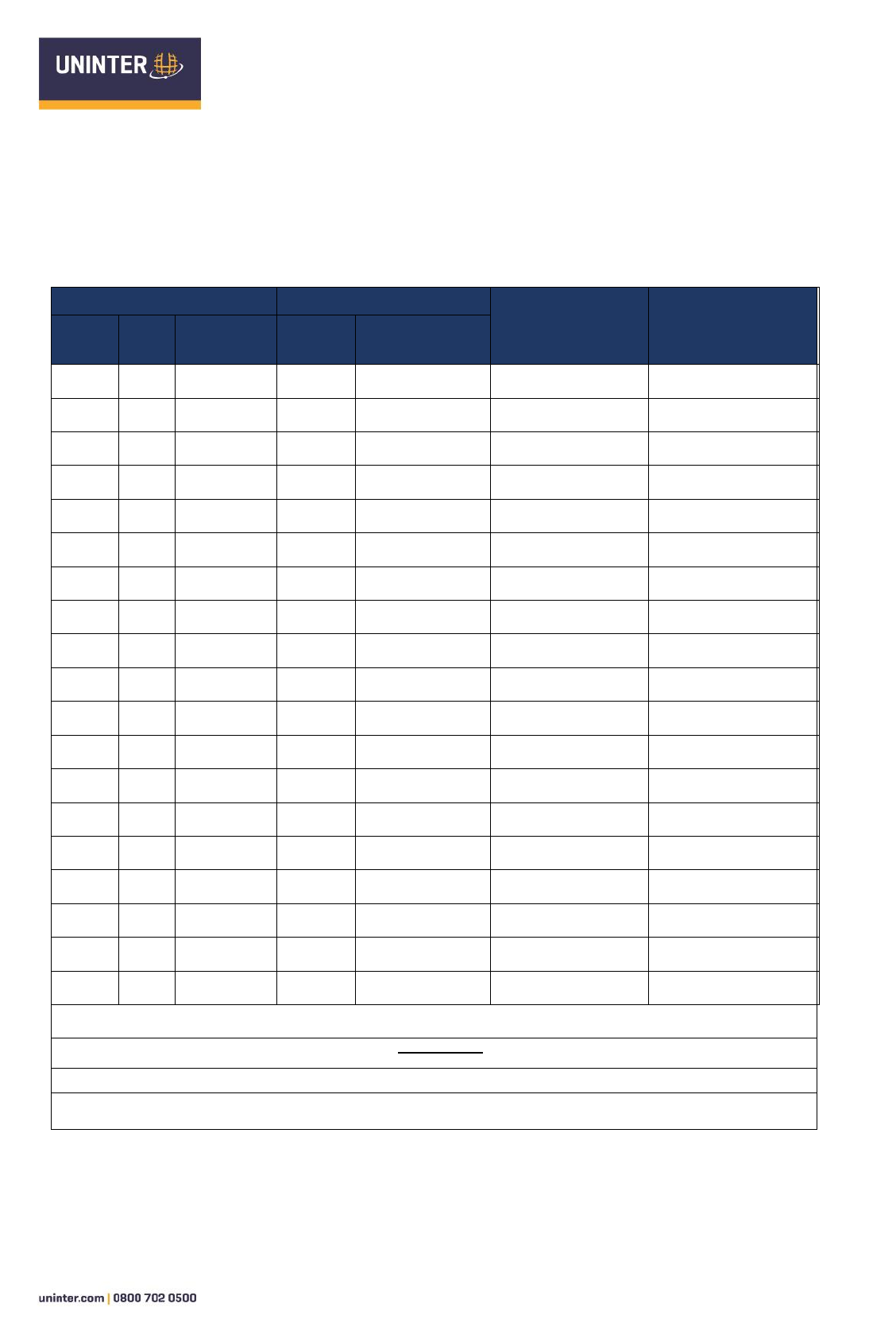 e-mail coordenação de estágio: elgison.s@uninter.com FICHA DE FREQUÊNCIA ESTÁGIO OBRIGATÓRIO SUPERVISIONADO CURSO DE BACHARELADO EM FISIOTERAPIA Nome do aluno:__________________________________________________RU:__________ Instituição Concedente:_________________________________________________________ Supervisor de Campo: __________________________________________________________ DATA / HORÁRIO ANO: ASSINATURA DO SUPERVISOR DE CAMPO ASSINATURA DO ALUNO DIA MÊS ENTRADA SAÍDA TOTAL HORAS POR DIA TOTAL DE HORAS: Esta Ficha de Frequência deve ser apresentada manuscrita e sem rasuras. Preencha corretamente o ano, as datas e os horários. Cada observação deverá conter as assinaturas nas linhas correspondentes. 1. O Supervisor de campo é responsável pelas assinaturas nas observações das atividades, fora do campo de pesquisa e no espaço – Assinatura do Supervisor de Campo ____/____/_______ _________________________________ Data Assinatura do Supervisor de Campo (Carimbo)