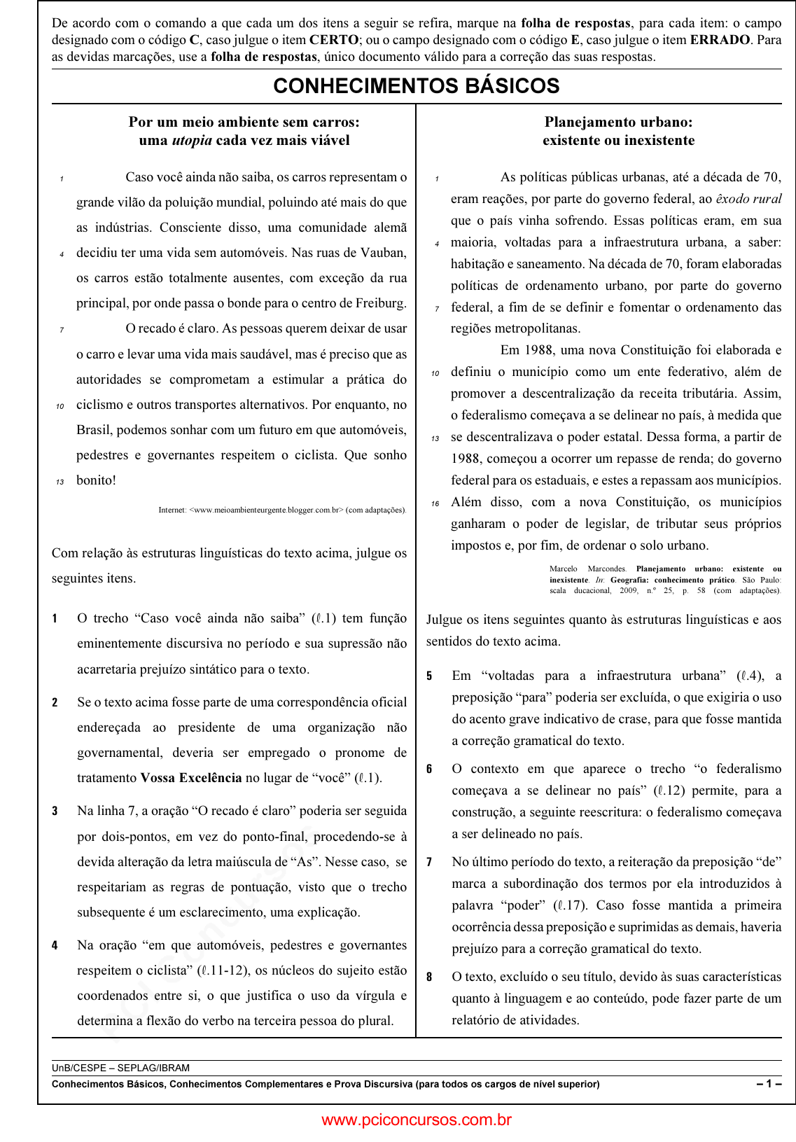 pcimarkpci MjgwNDowMDE4OjA4NDk6YzM3YzoxNDY1OjM3ZDI6ZDAzODpiNDVh:VHVlLCAyNiBOb3YgMjAyNCAyMzo1MTo0MiAtMDMwMA== www.pciconcursos.com.br UnB/CESPE – SEPLAG/IBRAM Conhecimentos Básicos, Conhecimentos Complementares e Prova Discursiva (para todos os cargos de nível superior) – 1 – De acordo com o comando a que cada um dos itens a seguir se refira, marque na folha de respostas, para cada item: o campo designado com o código C, caso julgue o item CERTO; ou o campo designado com o código E, caso julgue o item ERRADO. Para as devidas marcações, use a folha de respostas, único documento válido para a correção das suas respostas. CONHECIMENTOS BÁSICOS Por um meio ambiente sem carros: uma utopia cada vez mais viável Caso você ainda não saiba, os carros representam o1 grande vilão da poluição mundial, poluindo até mais do que as indústrias. Consciente disso, uma comunidade alemã decidiu ter uma vida sem automóveis. Nas ruas de Vauban,4 os carros estão totalmente ausentes, com exceção da rua principal, por onde passa o bonde para o centro de Freiburg. O recado é claro. As pessoas querem deixar de usar7 o carro e levar uma vida mais saudável, mas é preciso que as autoridades se comprometam a estimular a prática do ciclismo e outros transportes alternativos. Por enquanto, no10 Brasil, podemos sonhar com um futuro em que automóveis, pedestres e governantes respeitem o ciclista. Que sonho bonito!13 Internet: (com adaptações). Com relação às estruturas linguísticas do texto acima, julgue os seguintes itens. � O trecho “Caso você ainda não saiba” (R.1) tem função eminentemente discursiva no período e sua supressão não acarretaria prejuízo sintático para o texto. � Se o texto acima fosse parte de uma correspondência oficial endereçada ao presidente de uma organização não governamental, deveria ser empregado o pronome de tratamento Vossa Excelência no lugar de “você” (R.1). � Na linha 7, a oração “O recado é claro” poderia ser seguida por dois-pontos, em vez do ponto-final, procedendo-se à devida alteração da letra maiúscula de “As”. Nesse caso, se respeitariam as regras de pontuação, visto que o trecho subsequente é um esclarecimento, uma explicação. � Na oração “em que automóveis, pedestres e governantes respeitem o ciclista” (R.11-12), os núcleos do sujeito estão coordenados entre si, o que justifica o uso da vírgula e determina a flexão do verbo na terceira pessoa do plural. Planejamento urbano: existente ou inexistente As políticas públicas urbanas, até a década de 70,1 eram reações, por parte do governo federal, ao êxodo rural que o país vinha sofrendo. Essas políticas eram, em sua maioria, voltadas para a infraestrutura urbana, a saber:4 habitação e saneamento. Na década de 70, foram elaboradas políticas de ordenamento urbano, por parte do governo federal, a fim de se definir e fomentar o ordenamento das7 regiões metropolitanas. Em 1988, uma nova Constituição foi elaborada e definiu o município como um ente federativo, além de10 promover a descentralização da receita tributária. Assim, o federalismo começava a se delinear no país, à medida que se descentralizava o poder estatal. Dessa forma, a partir de13 1988, começou a ocorrer um repasse de renda; do governo federal para os estaduais, e estes a repassam aos municípios. Além disso, com a nova Constituição, os municípios16 ganharam o poder de legislar, de tributar seus próprios impostos e, por fim, de ordenar o solo urbano. Marcelo Marcondes. Planejamento urbano: existente ou inexistente. In: Geografia: conhecimento prático. São Paulo: scala ducacional, 2009, n.º 25, p. 58 (com adaptações). Julgue os itens seguintes quanto às estruturas linguísticas e aos sentidos do texto acima. � Em “voltadas para a infraestrutura urbana” (R.4), a preposição “para” poderia ser excluída, o que exigiria o uso do acento grave indicativo de crase, para que fosse mantida a correção gramatical do texto. � O contexto em que aparece o trecho “o federalismo começava a se delinear no país” (R.12) permite, para a construção, a seguinte reescritura: o federalismo começava a ser delineado no país. � No último período do texto, a reiteração da preposição “de” marca a subordinação dos termos por ela introduzidos à palavra “poder” (R.17). Caso fosse mantida a primeira ocorrência dessa preposição e suprimidas as demais, haveria prejuízo para a correção gramatical do texto. � O texto, excluído o seu título, devido às suas características quanto à linguagem e ao conteúdo, pode fazer parte de um relatório de atividades. www.pciconcursos.com.br pcimarkpci MjgwNDowMDE4OjA4NDk6YzM3YzoxNDY1OjM3ZDI6ZDAzODpiNDVh:VHVlLCAyNiBOb3YgMjAyNCAyMzo1MTo0MiAtMDMwMA== www.pciconcursos.com.br UnB/CESPE – SEPLAG/IBRAM Conhecimentos Básicos, Conhecimentos Complementares e Prova Discursiva (para todos os cargos de nível superior) – 2 – Considerando aspectos relativos à correspondência oficial, julgue os próximos itens. O correio eletrônico é um meio que pode e deve ser usado na comunicação oficial, desde que se utilize linguagem adequada à situação. � Tanto no memorando quanto na declaração, as informações relativas ao local e à data de expedição do documento devem ser expressas no canto superior direito da página. �� O ofício e o aviso, tipos de correspondência oficial muito semelhantes, diferenciam-se quanto ao destinatário: o aviso é expedido exclusivamente por ministros de Estado para seus subordinados, e o ofício é expedido para autoridades de mesma posição hierárquica do remetente. Enchentes nos centros urbanos As áreas urbanas são as que mais expressam1 intervenções humanas no meio natural. O desmatamento, as edificações, a canalização, a mudança do curso dos rios, a poluição da atmosfera, dos cursos de água e a produção de4 calor geram diversos efe