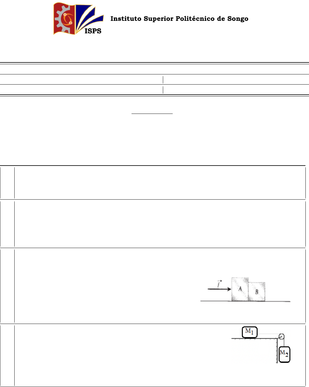 Comissão de Gestão de Exames de Admissão ANO 2023 Disciplina: Física Número de questões 40 Duração: 120 minutos Opções por questão: 4 INSTRUÇÕES • Preencha as suas respostas na FOLHA DE RESPOSTAS que lhe foi atribuída no inicio deste exame. Não será aceite qualquer outra folha adicional, incluindo este enunciado. • Na FOLHA DE RESPOSTAS, assinale a letra que corresponde a alternativa correta, colocando uma cruz "×" sobre a circunferência "⃝" correspondente. 1 O movimento de uma dada partícula é caracterizado pela função: x(t) = 2 + 2t+ 2t2, no SI. Pode-se afirmar que: A. v0 = 2 e a = 2 B. v0 = 2 e a = 4 C. x0 = 2 e a = 2 D. x0 = 4 e a = 4. 2 Um foguete sobe verticalmente. No instante t = 0 s em que ele passa pela altura de 100 m, em relação ao solo, subindo com velocidade constante de módulo 5 m/s escapa um pequeno parafuso.Considere g = 10 m/s2 e despreze o efeito do ar. O parafuso chegará no solo no instante t, em segundos igual a: A. 20 B. 5 C. 10 D. 15 3 A e B são dois blocos de massas 3 kg e 2 kg, respectivamente, que se movimentam juntos sobre uma superfície horizontal e perfeitamente lisa. F é uma força aplicada de módulo 30 N ao bloco A. A aceleração do sistema e a intensidade da força que B exerce sobre A são, respectivamente: A. 4 m/s2 e 12 N B. 5 m/s2 e 10 N C. 6 m/s2 e 18 N D. 6 m/s2 e 12 N 4 No sistema ao lado, M1 = 4 kg e M2 = 2 kg. Considere g = 10 m/s2 e despreze o atrito da roldana. Se o coeficiente de atrito entre M1 e o plano for 0, 2, a aceleração do sistema será de: A. 0, 2 m/s2 B. 2 m/s2 C. 0, 6 m/s2 D. 6 m/s2 1 5 A figura ao lado ilustra um bloco de 10 kg, em repouso, sobre um plano inclinado. Considerando g = 10 m/s2, a intensidade da força de atrito entre o bloco e o plano é : A. 30 N B. 50 N C. 70 N D. 100 N 6 No esquema do exercício anterior, se o atrito entre o bloco e o plano fosse nulo, com certeza o bloco iria deslizar. Nestas condições, a aceleração com que o bloco iria deslisar é: A. 2, 5 m/s2 B. 5 m/s2 C. 7, 5 m/s2 D. 10 m/s2 7 Uma viga uniforme de 450 kg sustenta uma carga, conforme ilustra a figura ao lado. Considerando g = 10 m/s2, a reacção dos apoios A e B respectivamente é: A. 3000 N e 3500 N B. 3500 N e 3000 N C. 5000 N e 3000 N D. 4500 N e 2000 N 8 O gráfico ao lado representa a variação da intensidade da força que actua sobre um corpo, em função do seu deslocamento. O trabalho realizado pela força, para deslocar o corpo até 7 m é: A. 300 J B. 475 J C. 525 J D. 1700 J 9 Numa das encostas da montanha M´bonga, uma pedra de duas toneladas desliza ao longo do trilho ABC como mostra a figura ao lado. Desprezando o atrito, sabendo que a energia cinética da pedra em A é nula enquanto que sua energia potencial é 4 kJ , A. a velocidade da pedra em A vale 4 m/s; B. a energia potencial da pedra em B vale 4 kJ; C. a energia mecânica total da pedra em B vale 4 kJ; D. a energia cinética da pedra em C vale 8 kJ. 10 Um carro de 1500 kg trafega a 10 m/s subitamente, fica sem gasolina próximo do início da descida do vale mostrado na figura ao lado. Considerando g = 9, 8 m/s2, o valor da veloci- dade do carro no SI quando ele estiver chegando, rolando em ponto-morto, no posto de gasolina do outro lado do vale será: A. 2, 0 B. 3, 15 C. 4, 0 D. 1, 41 2 11 Uma bolinha de 50 g, movendo-se a 2 m/s, colide com outra bolinha de 20 g que está parada. O módulo da velocidade de cada bolinha imediatamente após uma colisão elástica é: A. 1, 6 m/s e 2, 1 m/s; B. 0, 73 m/s e 1, 0 m/s C. 0, 86 m/s e 2, 9 m/s D. 3, 2 m/s e 2, 0 m/s 12 Quando a elongação de um ponto em movimento harmônico simples (MHS) é máxima, a velocidade: A. e aceleração são máximas; B. e aceleração são mínimas; C. é nula e a aceleração é máxima; D. é nula e a aceleração é mínima. 13 Um pêndulo de mola oscila verticalmente, de acordo com o gráfico. A pulsação das oscilações em rad/s A. π B. 3π C. 10π D. −10π 14 A função de propagação de uma onda mecânica é dada por: y(x, t) = 2sen(4πt − 8πx) , no SI. Neste caso, a amplitude, o período e o comprimento de onda são respectivamente: A. 4m, 4s e 8m B. 4m, 2s e 4m C. 2m, 2s e 4m D. 2m, 0, 5s e 0, 25m 15 Um mergulhador encontra-se a uma profundidade de 10 m, em um lago cuja água apresenta uma massa específica de 103 kg/m3. Sabendo que aceleração de gravidade no local é de g = 10 m/s2, e a pressão atmosférica de 1, 0 · 105 Pa, a pressão total exercida sobre o mergulhador é de: A. 2 · 105 Pa B. 2 · 103 Pa C. 1 · 105 Pa D. 1 · 103 Pa 16 O elevador hidráulico de um posto de automóveis é accionado mediante um cilindro de área 3 · 10−5 m2. O automóvel a ser elevado tem massa 3 · 103 kg e esta sobre o êmbolo de área 6 · 10−3 m2. Sendo a aceleração da gravidade g = 10 m/s2, nisto, o valor mínimo da força em Newtons, que deve ser aplicado ao êmbolo menor para elevar o automóvel é: A. 1, 7 · 102 B. 1, 5 · 102 C. 2, 3 · 102 D. 0, 7 · 102 17 Um tubo em U contém dois líquidos A e B imiscíveis de densidades diferentes. Sabendo que hA = 40 cm e hB = 80 cm e que a densidade do fluído B é de 900 kg/m3, a densidade do fluído A é : A. 1800 kg/m3 B. 1200 kg/m3 C. 800 kg/m3 D. 320 kg/m3 3 18 A água cuja massa específica é 103 kg/m3, escoa através de um tubo horizontal representado na figura ao lado. Se a pressão manométrica no ponto 1 for de 4 kPa, e a velocidade neste mesmo ponto for de 1 m/s , é certo afirmar que: A. no ponto 1 tal como no ponto 2 , a vazão da água será 10−3 m3/s; B. a velocidade no ponto 2 também será de 1m/s; C. a velocidade no ponto 2 cairá para a metade; D. a velocidade no ponto 2 será de 0, 15m/s. 19 Um gás ideal, contido num recipiente, inicialmente a 400K e 4000 Pa sofre uma transformação isocórica. Por essa via, a sua pressão passa para 2000Pa. Assim sendo, a sua temperatura final vale: A. 200 K B. 400 K C. 800 K D. 8000 K 20 O gráfico ao lado representa um isoprocesso de