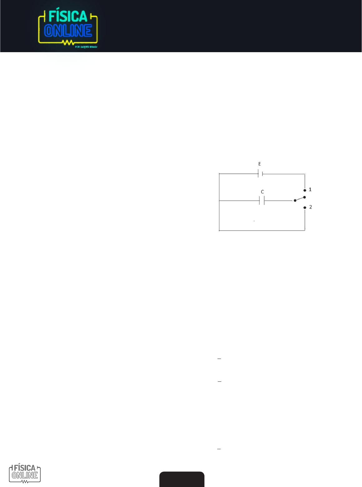 228 Fí si ca - 1. 00 0 Q ue st õe s A) CAPACITORES 1. Um capacitor pode ser formado por duas placas conduto- ras (eletrodos) separadas por um meio isolante. Quando se aplica uma tensão elétrica entre os eletrodos, cargas elétricas de sinais opostos irão se acumular nas superfí- cies das placas. Caso venha a ser aplicada uma tensão elétrica elevada, pode-se romper a rigidez dielétrica do meio isolante e este passa a conduzir cargas elétricas. Em relação a capacitores e dielétricos, avalie as seguintes sentenças e assinale a CORRETA: A) O Cobre é um excelente condutor. Por isso, é muito utilizado como meio dielétrico em capacitores. B) O acúmulo de cargas na superfície do dielétrico não depende da permissividade do meio. Apenas a tensão aplicada nos terminais irá determinar a densidade de carga acumulada. C) A capacitância de um capacitor é diretamente propor- cional à razão entre a tensão aplicada e a permissi- vidade do meio. D) Em um capacitor ideal, toda carga flui pelo dielétrico sem que a corrente sofra alterações. E) As densidades de cargas em ambas as placas do capacitor são iguais, em módulo, mas de sinais contrários. 2. Durante um infarto cardíaco, o coração produz padrões irregulares de batimento rápidos e irregulares, uma con- dição conhecida como fibrilação cardíaca, que pode ser interrompida frequentemente enviando-se uma descarga muito rápida de energia elétrica passando pelo coração. Paramédicos usam desfibriladores [...]. Uma espécie de chapa com a forma de uma raquete é conectada a cada placa de um grande capacitor, carregado com uma dife- rença de potencial de aproximadamente mil volts. Ele é, então, descarregado em alguns milésimos de se- gundos, passando uma corrente pelo coração do paciente e os batimentos retornam ao seu padrão normal. Adaptado de: CUTNELL, J. D.; JOHNSON, K.W. Físi- ca. 6a ed. Rio de Janeiro: LTC, 2006.p.55 A partir da análise do texto, pode-se afirmar que o capa- citor é um dispositivo que A) armazena cargas elétricas. B) não pode armazenar energia elétrica. C) gera energia elétrica. D) não pode viabilizar corrente elétrica. E) viola o princípio da conservação de energia, ou seja, a energia é destruída. 3. Um desfibrilador, utilizado para reverter fibrilação ventri- cular, tem um gerador (V = 6.000 V) ligado a um capa- citor (C = 50,00 µF) carregado com a chave 1 fechada e a chave 2 aberta. Para a descarga, as chaves são invertidas. Calcule a potência liberada em 0,002 s, se um quarto da energia é liberada em uma descarga e marque a alternativa correta. Circuito de carga e descarga de um capacitor A) Potência =112.500,00 W. B) Potência = 225.000,00 W. C) Potência = 0,45 W. D) Potência = 0,90 W. 4. O funcionamento de um desfibrilador se baseia no pro- cesso de carga e descarga de um capacitor. Digamos que um desfibrilador de capacitância C foi carregado e submetido a uma DDP U, adquirindo uma carga Q. Assim, a energia E armazenada no desfibrilador pode ser representada pela seguinte relação: A) E CQ E CU E CU E CQ E QC= = = = = 1 2 1 2 1 2 2 2 2 B) E CQ E CU E CU E CQ E QC= = = = = 1 2 1 2 1 2 2 2 2 C) E CQ E CU E CU E CQ E QC= = = = = 1 2 1 2 1 2 2 2 2 D) E CQ E CU E CU E CQ E QC= = = = = 1 2 1 2 1 2 2 2 2 E) E CQ E CU E CU E CQ E QC= = = = = 1 2 1 2 1 2 2 2 2 229 Fí si ca - 1. 00 0 Q ue st õe s 5. Um capacitor de capacitância igual a 2 µF está comple- tamente carregado e possui uma diferença de potencial entre suas armaduras de 3 V. Em seguida, este capacitor é ligado a um resistor ôhmico por meio de fios condutores ideais, conforme representado no circuito abaixo, sendo completamente descarregado através do resistor. resistor capacitor Nesta situação, a energia elétrica total transformada em calor pelo resistor é de A) 1,5·10–6 J B) 6,0·10–6 J C) 9,0·10–6 J D) 12,0·10–6 J E) 18,0·10–6 J 6. Na área de Eletrodinâmica, em circuitos elétricos, são comuns associações entre capacitores e entre resistores. A respeito do assunto, considere as seguintes afirmativas: 1. Numa associação de resistores em série, o resistor equivalente sempre tem resistência maior que qual- quer uma das resistências dos resistores que formam a associação. 2. Numa associação de capacitores em paralelo, a ten- são aplicada ao capacitor equivalente é dada pela soma das tensões em cada capacitor que forma a associação. 3. Numa associação de capacitores em série, a carga em cada capacitor é a mesma, e o capacitor equi- valente tem uma carga igual à de cada capacitor da associação. Assinale a alternativa correta. A) Somente a afirmativa 1 é verdadeira. B) Somente a afirmativa 2 é verdadeira. C) Somente a afirmativa 3 é verdadeira. D) Somente as afirmativas 1 e 2 são verdadeiras. E) Somente as afirmativas 1 e 3 são verdadeiras. 7. Nos teclados de computador e de instrumentos mu- sicais eletrônicos, as teclas funcionam acopladas a pequenos capacitores de placas móveis com dielétricos compressíveis. Quando a tecla é acionada, a distância entre as placas diminui, e, com isso, aumenta a ca- pacitância.Essa alteração é detectada por um circuito eletrônico, que envia ao processador um pulso com uma informação digital e o processador entende que determinada tecla foi acionada. Disponível em: https://www.passeidireto.com. Acesso em: 6 de março de 2016. Sendo a distância entre as placas de um capacitor pre- sas a uma tecla do teclado igual a 0,150 mm quando pressionada e a área de cada placa de valor 0,95 cm2, a alternativa que determina a capacitância do capacitor que possui entre as placas um isolante de constante dieléletrica K = 3,5 é Dado: Permissividade no vácuo = ε0 = 8,85.10–12 Farad . m–1 A) 7,2 . 10–12 Farad. B) 11,2 . 10–12 Farad. C) 19,6 . 10–12 Farad. D) 21,4 . 10–12 Farad. E) 25,6 . 10–12 Farad. 8. A integridade da membrana plasmática é vital para que as células executem de forma eficiente suas fu
