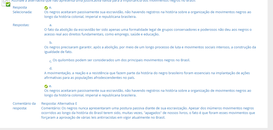 que apresenta uma para a importancia no Resposta e. Selecionada: Os negros aceitaram passivamente sua escravidão, não havendo registros na história sobre a organização de movimentos negros ao longo da história colonial, imperial e republicana brasileira. Respostas: a. fato da abolição da escravidão ter sido apenas uma formalidade legal de grupos conservadores e poderosos não deu aos negros acesso real aos direitos como emprego, saúde e educação. b. Os negros precisaram após a abolição, por meio de um longo processo de luta e movimentos sociais intensos, a construção da igualdade de fato. Os quilombos podem ser considerados um dos principais movimentos negros no Brasil. d. A movimentação, a reação e a resistência que fazem parte da história do negro brasileiro foram essenciais na implantação de ações afirmativas para as populações afrodescendentes no país. e. Os negros aceitaram passivamente sua escravidão, não havendo registros na história sobre a organização de movimentos negros ao longo da história colonial, imperial e republicana brasileira. Comentário da Resposta: Alternativa E resposta: Comentário: Os negros nunca apresentaram uma postura passiva diante de sua escravização. Apesar dos inúmeros movimentos negros ocorridos ao longo da história do Brasil terem sido, muitas vezes, "apagados" de nossos livros, fato é que foram esses movimentos que forçaram a aprovação de várias leis antirracistas em vigor atualmente no Brasil.