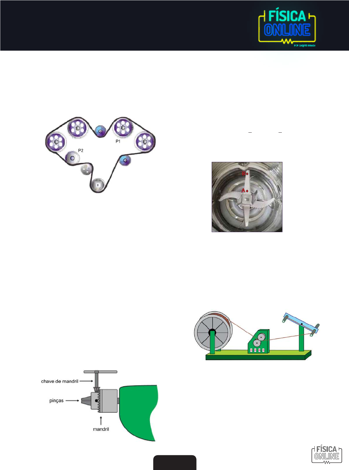 23 Fí si ca - 1. 00 0 Q ue st õe s TRANSMISSÃO DE MOVIMENTOS 1. A figura representa o diagrama da correia dentada de um a utomóvel. http://blogspot.com.br. (Adaptado.) Considere que a correia passa por todas as polias sem deslizar e que o raio da polia P1 é maior que o raio da polia P2. Quando a polia P1 gira no sentido horário, a polia P2 gira no sentido A) horário, com velocidade angular igual à velocidade a ngular de P1. B) anti-horário, com velocidade angular maior que a velocidade angular de P1. C) horário, com velocidade angular maior que a veloci- dade angular de P1. D) anti-horário, com velocidade angular menor que a velocidade angular de P1. E) horário, com velocidade angular menor que a veloci- dade angular de P1. 2. Para prender uma broca ao mandril de uma furadeira, utiliza-se uma ferramenta especialmente desenhada para esse fim. A chave de mandril, como é denominada, consiste em uma pequena engrenagem que se acopla à engrenagem do cilindro do mandril e que, ao ser girada, fecha as pinças que seguram a broca. Sabendo que a engrenagem da chave de mandril tem 10 dentes e que a engrenagem do cilindro do mandril tem 40 dentes, se a chave de mandril é girada com velocidade angular de 2 rad/s, o cilindro do mandril é girado com velocidade angular, em rad/s, igual a A) 2 B) 4 C) 1 2 1 4 D) 1 2 1 4 E) 1 3. Um liquidificador, para seu perfeito funcionamento,possui no fundo do copo lâminas simétricas presas ao eixo de rotação. www.afolhadobosque.typepad.com No momento em que o motor do liquidificador é colocado em funcionamento, o ponto A, relativamente ao ponto B, tem A) deslocamento linear maior. B) velocidade linear igual. C) velocidade angular maior. D) frequência de rotação igual. E) período menor. 4. Uma loja de materiais para construção possui um aparelho específico para medir o comprimento de fios elétricos. A bobina contendo o fio é colocada em um eixo e o extremo do fio dessa bobina é passado entre dois roletes idênticos de borracha que, associados a um mecanismo de contagem, registra o comprimento do fio que por ali passa. Considere que π seja igual a 3, que o raio da bobina (na fiada em que se encontra enrolado o extremo do fio) seja de 30 cm e que o raio de cada rolete seja de 6 cm. Quando a bobina dá uma volta completa no tempo de 1 s, liberando o fio com velo- cidade constante, a velocidade angular de cada um dos roletes de borracha do mecanismo contador é, em rad/s, A) 10 B) 60 C) 30 D) 50 E) 15 24 Fí si ca - 1. 00 0 Q ue st õe s 5. As marchas de bicicletas têm como princípio a combina- ção de discos dentados de diferentes diâmetros, que são ligados por meio de uma corrente, sem que haja desli- zamento entre a corrente e os discos. E sses discos são divididos em coroas e catracas, conforme mostra a figura. Na configuração mostrada na figura, a maior razão entre as velocidades angulares da catraca e da coroa ϖ ϖ catraca coroa ocorre quando da combinação da catraca A) Q com a coroa A. B) P com a coroa A. C) R com a coroa A. D) R com a coroa B. E) P com a coroa B. 6. O mecanismo apresentado na figura é utilizado para enrolar mangueiras após terem sido usadas no combate a incêndios. A mangueira é enrolada sobre si mesma, ca- mada sobre camada, formando um carretel cada vez mais espesso. Considerando ser o diâmetro da polia A maior que o diâmetro da polia B, quando giramos a manivela M com velocidade constante, verificamos que a polia B gira que a polia A, enquanto a extremidade P da mangueira sobe com movimento . Preenche corretamente as lacunas acima a opção: A) mais rapidamente – aceleração. B) mais rapidamente – uniforme. C) com a mesma velocidade – uniforme. D) mais lentamente – uniforme. E) mais lentamente – acelerado. 7. Uma criança montada em um velocípede se desloca em trajetória retilínea, com velocidade constante em relação ao chão. A roda dianteira descreve uma volta completa em um segundo. O raio da roda dianteira vale 24 cm e o das traseiras 16 cm. Podemos afirmar que as rodas traseiras do velocípede completam uma volta em, aproximadamente: A) 1 2 2 3 3 2 s s s B) 1 2 2 3 3 2 s s s C) 1 s D) 1 2 2 3 3 2 s s s E) 2 s 8. A figura a seguir representa um sistema de coroas dentadas de uma bicicleta, que está se movendo com velocidade constante. As coroas dentadas giram sem atrito em torno de seus eixos. A coroa dentada dianteira de raio RD é movimentada pelos pedais e está ligada à coroa traseira de raio RE pela correia de massa desprezível. FP é a força aplicada no pedal cujo comprimento é RP a partir do centro da coroa. Nessa situação, o módulo do torque transmitido à roda traseira, através da coroa de raio RE, é A) RE RP FP / RD B) RE RD FP / Rp C) RD RP FP / RE D) RPFP/ (RERD) E) RE FP / (RPRD) 9. Na montagem de determinado mecanismo, foi neces- sário acoplar duas engrenagens dentadas, A e B, de modo que elas girassem em sentidos contrários, como representado na figura. As engrenagens A e B têm, em suas periferias, 15 e 60 dentes, respectivamente. Sabendo que o período de rotação da engrenagem A é de 0,5 s, a frequência de rotação da engrenagem B é de A) 2,0 Hz B) 0,2 Hz C) 1,5 Hz D) 1,0 Hz E) 0,5 Hz 25 Fí si ca - 1. 00 0 Q ue st õe s GABARITO TRANSMISSÃO DE MOVIMENTOS 1 2 3 4 5 6 7 8 9 10 C C D C C B B A B C 10. Numa bicicleta, os pedais estão unidos a uma roda dentada chamada coroa, como mostra a imagem. http://mtbculturaeliberdade.blogspot.com Sabendo que os pedais e os dentes da coroa completam uma volta ao mesmo tempo, pode-se afirmar que as velocidades lineares, as velocidades angulares e as frequências de ambos são, nesta ordem, A) guais, iguais e diferentes. B) iguais, diferentes e iguais. C) iguais, diferentes e diferentes. D) diferentes, diferentes e iguais. E) diferentes, iguais e iguais.