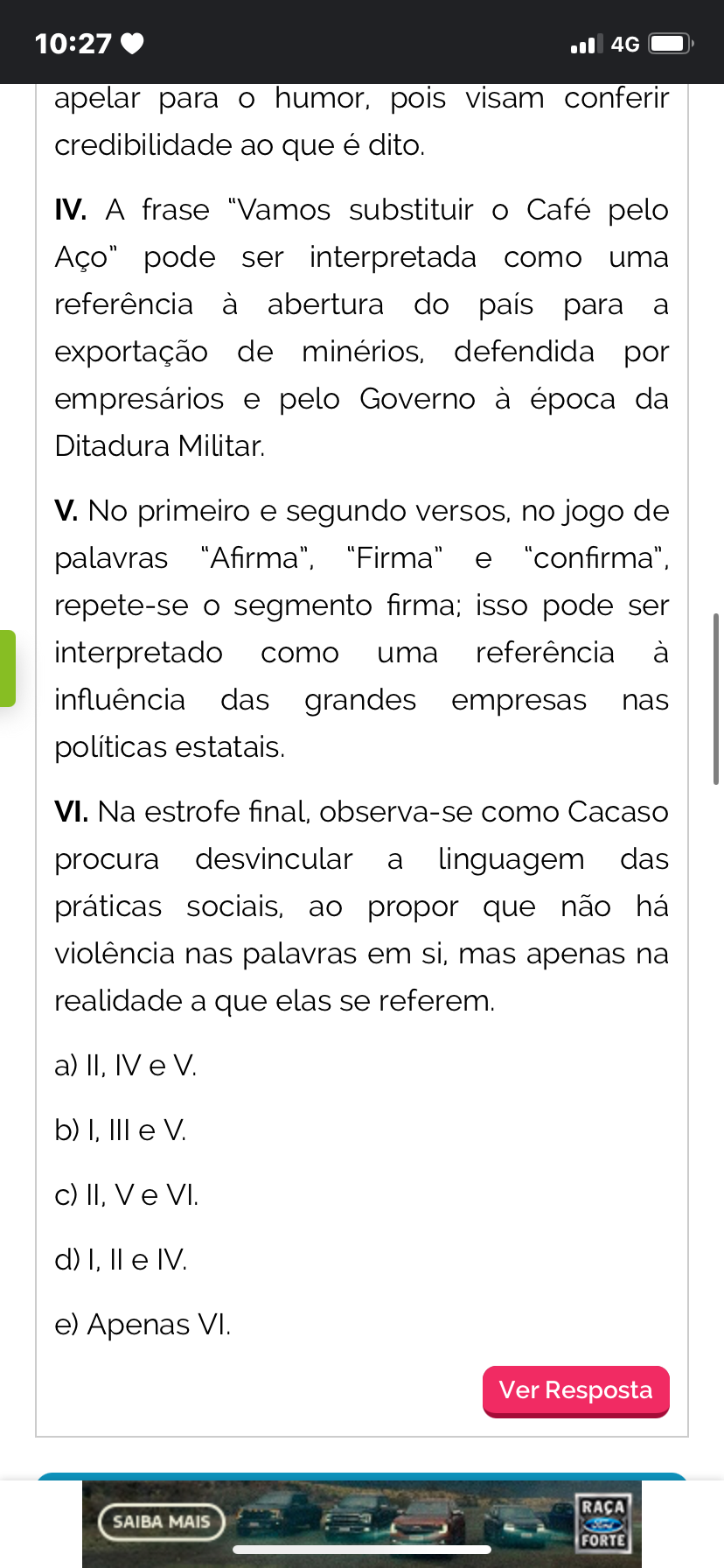 10:27 4G apelar para humor, pois visam conferir credibilidade ao que é dito. IV. A frase "Vamos substituir Café pelo Aço" pode ser interpretada como uma referência à abertura do país para a exportação de minérios, defendida por empresários e pelo Governo à época da Ditadura Militar. V. No primeiro e segundo versos, no jogo de palavras "Afirma", "Firma" e "confirma", repete-se segmento firma; isso pode ser interpretado como uma referência à influência das grandes empresas nas políticas estatais. VI. Na estrofe final, observa-se como Cacaso procura desvincular a linguagem das práticas sociais, ao propor que não há violência nas palavras em si, mas apenas na realidade a que elas se referem. a) II, IV e V. b) I, III e V. c) II, Ve VI. d) I, Il e IV. e) Apenas VI. Ver Resposta SAIBA MAIS FORTE