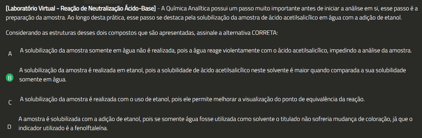 [Laboratório Virtual - Reação de Neutralização Ácido-Base] - A Química Analítica possui um passo muito importante antes de iniciar a análise em si, esse passo é a preparação da amostra. Ao longo desta prática, esse passo se destaca pela solubilização da amostra de ácido acetilsalicílico em água com a adição de etanol. Considerando as estruturas desses dois compostos que são apresentadas, assinale a alternativa CORRETA: A A solubilização da amostra somente em água não é realizada, pois a água reage violentamente com ácido acetilsalicílico, impedindo a análise da amostra. A solubilização da amostra é realizada em etanol, pois a solubilidade de ácido acetilsalicílico neste solvente é maior quando comparada a sua solubilidade B somente em água. C A solubilização da amostra é realizada com uso de etanol, pois ele permite melhorar a visualização do ponto de equivalência da reação. A amostra é solubilizada com a adição de etanol, pois se somente água fosse utilizada como solvente titulado não sofreria mudança de coloração, já que D indicador utilizado é a fenolftaleína.