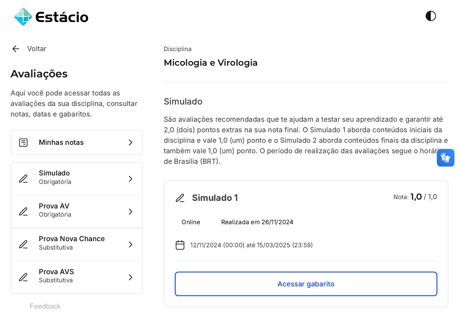 26/11/2024, 15:30 estacio.saladeavaliacoes.com.br/avaliacoes/DGT0947/ https://estacio.saladeavaliacoes.com.br/avaliacoes/DGT0947/ 1/2 Voltar Avaliações Aqui você pode acessar todas as avaliações da sua disciplina, consultar notas, datas e gabaritos. Minhas notas Simulado Obrigatória Prova AV Obrigatória Prova Nova Chance Substitutiva Prova AVS Substitutiva Disciplina Micologia e Virologia Simulado São avaliações recomendadas que te ajudam a testar seu aprendizado e garantir até 2,0 (dois) pontos extras na sua nota final. O Simulado 1 aborda conteúdos iniciais da disciplina e vale 1,0 (um) ponto e o Simulado 2 aborda conteúdos finais da disciplina e também vale 1,0 (um) ponto. O período de realização das avaliações segue o horário de Brasília �BRT�. Simulado 1 Nota: 1,0 / 1,0 Online Realizada em 26/11/2024 12/11/2024 �00�00) até 15/03/2025 �23�59� Acessar gabarito Feedback 26/11/2024, 15:30 estacio.saladeavaliacoes.com.br/avaliacoes/DGT0947/ https://estacio.saladeavaliacoes.com.br/avaliacoes/DGT0947/ 2/2 Ajuda Simulado 2 Nota: -- / 1,0 Online Realizada em 26/11/2024 12/11/2024 �00�00) até 15/03/2025 �23�59� Acessar gabarito