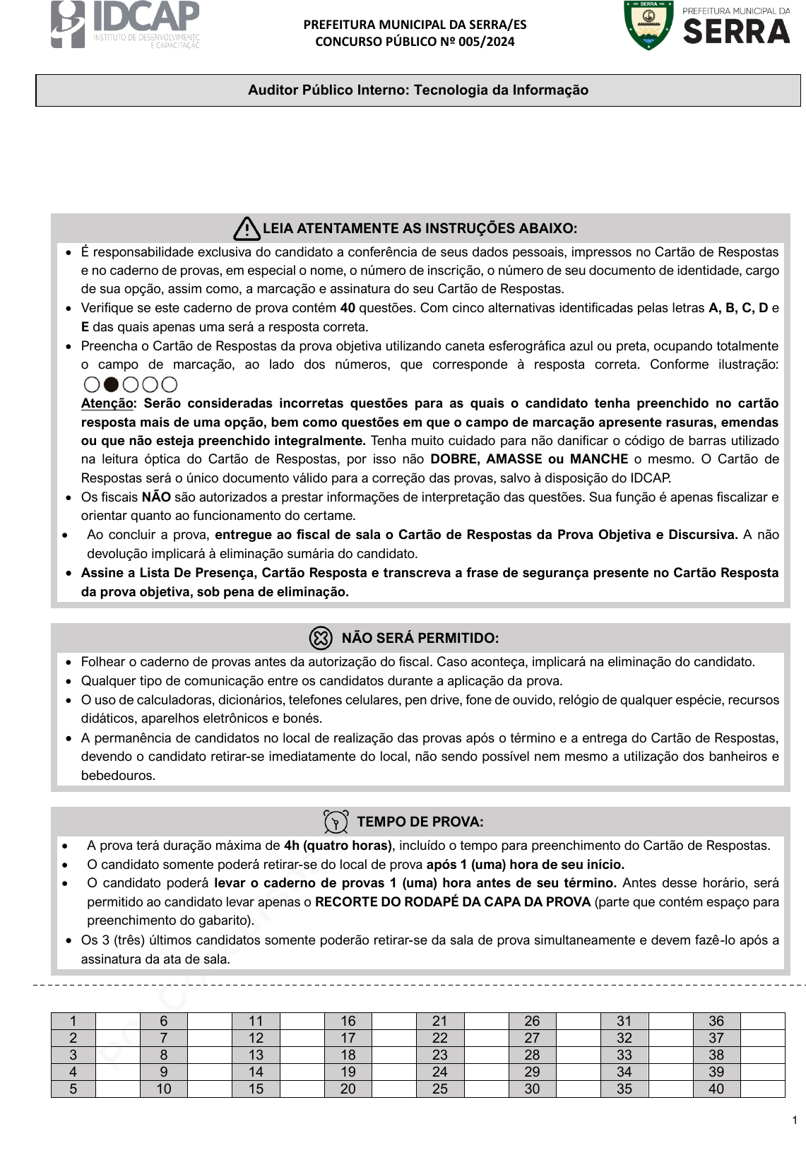 pcimarkpci MDAwMDowMDAwOjAwMDA6MDAwMDowMDAwOmZmZmY6MmQ4YzpjMGQ3:V2VkLCAyNyBOb3YgMjAyNCAwMToyNzo0MyAtMDMwMA== www.pciconcursos.com.br PREFEITURA MUNICIPAL DA SERRA/ES CONCURSO PÚBLICO Nº 005/2024 LEIA ATENTAMENTE AS INSTRUÇÕES ABAIXO: • É responsabilidade exclusiva do candidato a conferência de seus dados pessoais, impressos no Cartão de Respostas e no caderno de provas, em especial o nome, o número de inscrição, o número de seu documento de identidade, cargo de sua opção, assim como, a marcação e assinatura do seu Cartão de Respostas. • Verifique se este caderno de prova contém 40 questões. Com cinco alternativas identificadas pelas letras A, B, C, D e E das quais apenas uma será a resposta correta. • Preencha o Cartão de Respostas da prova objetiva utilizando caneta esferográfica azul ou preta, ocupando totalmente o campo de marcação, ao lado dos números, que corresponde à resposta correta. Conforme ilustração: Atenção: Serão consideradas incorretas questões para as quais o candidato tenha preenchido no cartão resposta mais de uma opção, bem como questões em que o campo de marcação apresente rasuras, emendas ou que não esteja preenchido integralmente. Tenha muito cuidado para não danificar o código de barras utilizado na leitura óptica do Cartão de Respostas, por isso não DOBRE, AMASSE ou MANCHE o mesmo. O Cartão de Respostas será o único documento válido para a correção das provas, salvo à disposição do IDCAP. • Os fiscais NÃO são autorizados a prestar informações de interpretação das questões. Sua função é apenas fiscalizar e orientar quanto ao funcionamento do certame. • Ao concluir a prova, entregue ao fiscal de sala o Cartão de Respostas da Prova Objetiva e Discursiva. A não devolução implicará à eliminação sumária do candidato. • Assine a Lista De Presença, Cartão Resposta e transcreva a frase de segurança presente no Cartão Resposta da prova objetiva, sob pena de eliminação. NÃO SERÁ PERMITIDO: • Folhear o caderno de provas antes da autorização do fiscal. Caso aconteça, implicará na eliminação do candidato. • Qualquer tipo de comunicação entre os candidatos durante a aplicação da prova. • O uso de calculadoras, dicionários, telefones celulares, pen drive, fone de ouvido, relógio de qualquer espécie, recursos didáticos, aparelhos eletrônicos e bonés. • A permanência de candidatos no local de realização das provas após o término e a entrega do Cartão de Respostas, devendo o candidato retirar-se imediatamente do local, não sendo possível nem mesmo a utilização dos banheiros e bebedouros. TEMPO DE PROVA: • A prova terá duração máxima de 4h (quatro horas), incluído o tempo para preenchimento do Cartão de Respostas. • O candidato somente poderá́ retirar-se do local de prova após 1 (uma) hora de seu início. • O candidato poderá́ levar o caderno de provas 1 (uma) hora antes de seu término. Antes desse horário, será permitido ao candidato levar apenas o RECORTE DO RODAPÉ DA CAPA DA PROVA (parte que contém espaço para preenchimento do gabarito). • Os 3 (três) últimos candidatos somente poderão retirar-se da sala de prova simultaneamente e devem fazê-lo após a assinatura da ata de sala. 1 6 11 16 21 26 31 36 2 7 12 17 22 27 32 37 3 8 13 18 23 28 33 38 4 9 14 19 24 29 34 39 5 10 15 20 25 30 35 40 Auditor Público Interno: Tecnologia da Informação 1 pcimarkpci MDAwMDowMDAwOjAwMDA6MDAwMDowMDAwOmZmZmY6MmQ4YzpjMGQ3:V2VkLCAyNyBOb3YgMjAyNCAwMToyNzo0MyAtMDMwMA== www.pciconcursos.com.br PREFEITURA MUNICIPAL DA SERRA/ES CONCURSO PÚBLICO Nº 005/2024 RASCUNHO 2 pcimarkpci MDAwMDowMDAwOjAwMDA6MDAwMDowMDAwOmZmZmY6MmQ4YzpjMGQ3:V2VkLCAyNyBOb3YgMjAyNCAwMToyNzo0MyAtMDMwMA== www.pciconcursos.com.br Língua Portuguesa O texto seguinte servirá de base para responder às questões de 1 a 2. Estudo aponta que abelhas podem detectar câncer com precisão Em um experimento inovador realizado por pesquisadores da Universidade Estadual de Michigan, abelhas foram capazes de detectar instantaneamente o câncer de pulmão e de distinguir os dois tipos da doença. A descoberta pode contribuir para um mecanismo não invasivo de reconhecimento de tumores em estágios iniciais. O estudo revelou que as pequenas produtoras de mel podem usar suas super antenas sensoriais, que atuam no diagnóstico de diferentes misturas de gases ou cheiros no ar, para discernir o material orgânico de um paciente saudável e de um paciente com câncer. Como o câncer de pulmão está entre os tipos mais comuns da doença, a aplicação de um biossensor preciso no início do tratamento tem potencial de salvar vidas em larga escala. Embora o conceito seja simples e o design experimental direto, a execução foi complicada. Os estudiosos obtiveram as abelhas da Universidade Estadual do Arizona e cuidaram delas por mais de quatro semanas. Para imobilizá-las, eles projetaram um minúsculo arreio para segurar os pescoços, enquanto elas eram expostas às amostras de gás. Sob as antenas da abelha viva, os pesquisadores passaram misturas de gases e compostos orgânicos voláteis (VOCs), projetados em laboratório para representar o hálito de pacientes saudáveis e com câncer. Pesquisas anteriores mostraram que culturas de células cancerígenas — câncer de mama, câncer de fígado, câncer de próstata, câncer de pulmão e outros — emitem misturas únicas de VOCs ou gases. Outros seres também demonstraram capacidade olfativa avançada com possibilidades para aplicações empolgantes. Em um estudo publicado em 2023, pesquisadores treinaram formigas para identificar ratos saudáveis e ratos com câncer de mama humano xenotransplantados em aproximadamente 10 minutos. Cães também podem perceber mudanças na saúde de uma pessoa, como Covid-19 no suor, câncer em amostras de urina ou um melanoma na pele.e mental. Terra. Disponível em: https://www.terra.com.br/vida-e-estilo/saude/olimp