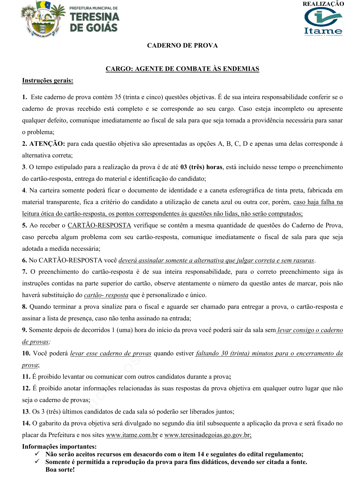 pcimarkpci MDAwMDowMDAwOjAwMDA6MDAwMDowMDAwOmZmZmY6MmQ4YzpjMGQ3:V2VkLCAyNyBOb3YgMjAyNCAwMToyMTowMyAtMDMwMA== www.pciconcursos.com.br REALIZAÇÃO CADERNO DE PROVA CARGO: AGENTE DE COMBATE ÀS ENDEMIAS Instruções gerais: 1. Este caderno de prova contém 35 (trinta e cinco) questões objetivas. É de sua inteira responsabilidade conferir se o caderno de provas recebido está completo e se corresponde ao seu cargo. Caso esteja incompleto ou apresente qualquer defeito, comunique imediatamente ao fiscal de sala para que seja tomada a providência necessária para sanar o problema; 2. ATENÇÃO: para cada questão objetiva são apresentadas as opções A, B, C, D e apenas uma delas corresponde à alternativa correta; 3. O tempo estipulado para a realização da prova é de até 03 (três) horas, está incluído nesse tempo o preenchimento do cartão-resposta, entrega do material e identificação do candidato; 4. Na carteira somente poderá ficar o documento de identidade e a caneta esferográfica de tinta preta, fabricada em material transparente, fica a critério do candidato a utilização de caneta azul ou outra cor, porém, caso haja falha na leitura ótica do cartão-resposta, os pontos correspondentes às questões não lidas, não serão computados; 5. Ao receber o CARTÃO-RESPOSTA verifique se contêm a mesma quantidade de questões do Caderno de Prova, caso perceba algum problema com seu cartão-resposta, comunique imediatamente o fiscal de sala para que seja adotada a medida necessária; 6. No CARTÃO-RESPOSTA você deverá assinalar somente a alternativa que julgar correta e sem rasuras. 7. O preenchimento do cartão-resposta é de sua inteira responsabilidade, para o correto preenchimento siga às instruções contidas na parte superior do cartão, observe atentamente o número da questão antes de marcar, pois não haverá substituição do cartão- resposta que é personalizado e único. 8. Quando terminar a prova sinalize para o fiscal e aguarde ser chamado para entregar a prova, o cartão-resposta e assinar a lista de presença, caso não tenha assinado na entrada; 9. Somente depois de decorridos 1 (uma) hora do início da prova você poderá sair da sala sem levar consigo o caderno de provas; 10. Você poderá levar esse caderno de provas quando estiver faltando 30 (trinta) minutos para o encerramento da prova; 11. É proibido levantar ou comunicar com outros candidatos durante a prova; 12. É proibido anotar informações relacionadas às suas respostas da prova objetiva em qualquer outro lugar que não seja o caderno de provas; 13. Os 3 (três) últimos candidatos de cada sala só poderão ser liberados juntos; 14. O gabarito da prova objetiva será divulgado no segundo dia útil subsequente a aplicação da prova e será fixado no placar da Prefeitura e nos sites www.itame.com.br e www.teresinadegoias.go.gov.br; Informações importantes: ✓ Não serão aceitos recursos em desacordo com o item 14 e seguintes do edital regulamento; ✓ Somente é permitida a reprodução da prova para fins didáticos, devendo ser citada a fonte. Boa sorte! pcimarkpci MDAwMDowMDAwOjAwMDA6MDAwMDowMDAwOmZmZmY6MmQ4YzpjMGQ3:V2VkLCAyNyBOb3YgMjAyNCAwMToyMTowMyAtMDMwMA== www.pciconcursos.com.brTeresina de Goiás - GO / Agente de Combate às Endemias 1 Leia o texto a seguir e responda o que se pede: O Galo O Dr. Marcolino apeou-se, entrou na palhoça, examinou o enfermo, auscultou-o, martelou-lhe o corpo inteiro com o nó do dedo grande e explicou a moléstia com palavras difíceis que aquela pobre gente não entendeu. Depois, abriu o saco de viagem que levava à garupa do animal, tirou alguns vidros, de cujo conteúdo derramou algumas gotas num copo d'água, e disse doutoralmente: - Aqui fica esta poção para ser tomada de três em três horas. - Ah! seu doutor, nós aqui não podemos contar as horas, porque não temos relógio! - Regulem-se pelo sol. O sol é um excelente relógio quando não chove e o tempo está seguro. - Não sei disso, seu doutor, não entendo do relógio do sol... - Nesse caso não sei como... Ah!... Este ah!, com que o doutor interrompeu o que ia dizendo, foi produzido pela presença de um galo que passava no terreiro, majestosamente. - Ali está um relógio, continuou o doutor: aquele galo. Todas as vezes que ele cantar, dê-lhe uma colher do remédio. E adeus! Não será nada: Depois de amanhã voltarei para ver o doente. Foi-se o médico, e daí a dois dias voltou ao trote do seu jumento. Quem o recebeu foi o marido: - Que é isto?... já de pé... - Sim, senhor: estou completamente bom, não tenho mais nada. E não sei como agradecer... Mas a mulher interveio com ar magoado: - Sim, ele não tem mais nada, mas o pobre galo morreu. - Morreu? Por quê?. - Não sei, doutor... ele bebeu todo o remédio. - Quem?... o galo?... - Sim, senhor; todas as vezes que ele cantava, eu, segundo a recomendação do doutor, abria-lhe o bico, e derramava-lhe uma colher da droga pela goela abaixo! Que pena! Era um galo tão bonito! Texto adaptado da obra de: AZEVEDO, Artur. O Galo. Disponível em: Biblioteca Virtual de Literatura. Acesso em: 28 jun. 2024. 1. Na oração: A roceira agradeceu a Providência que enviava o doutor”, a palavra Providência é escrita com inicial maiúscula porque: (A) Trata-se de um substantivo próprio, que remete ao nome de um personagem da narrativa. (B) Trata-se de um substantivo abstrato que deve, segundo a regra gramatical, ser escrito com letra maiúscula. (C) Trata-se de uma referência a uma divindade, por isso o substantivo deve ser escrito com inicial maiúscula. (D) Trata-se de um substantivo próprio, que remete ao nome de um lugar na narrativa. 2. Pode-se dizer que a confusão da mulher quanto à maneira de dar o remédio ao marido surge a partir de um problema de coesão referencial: anáfora, produzido pela colocação incorreta de um pronome, cujo uso deixa a esposa confusa e ela não consegue saber que referente o pronome retoma. Esse uso i