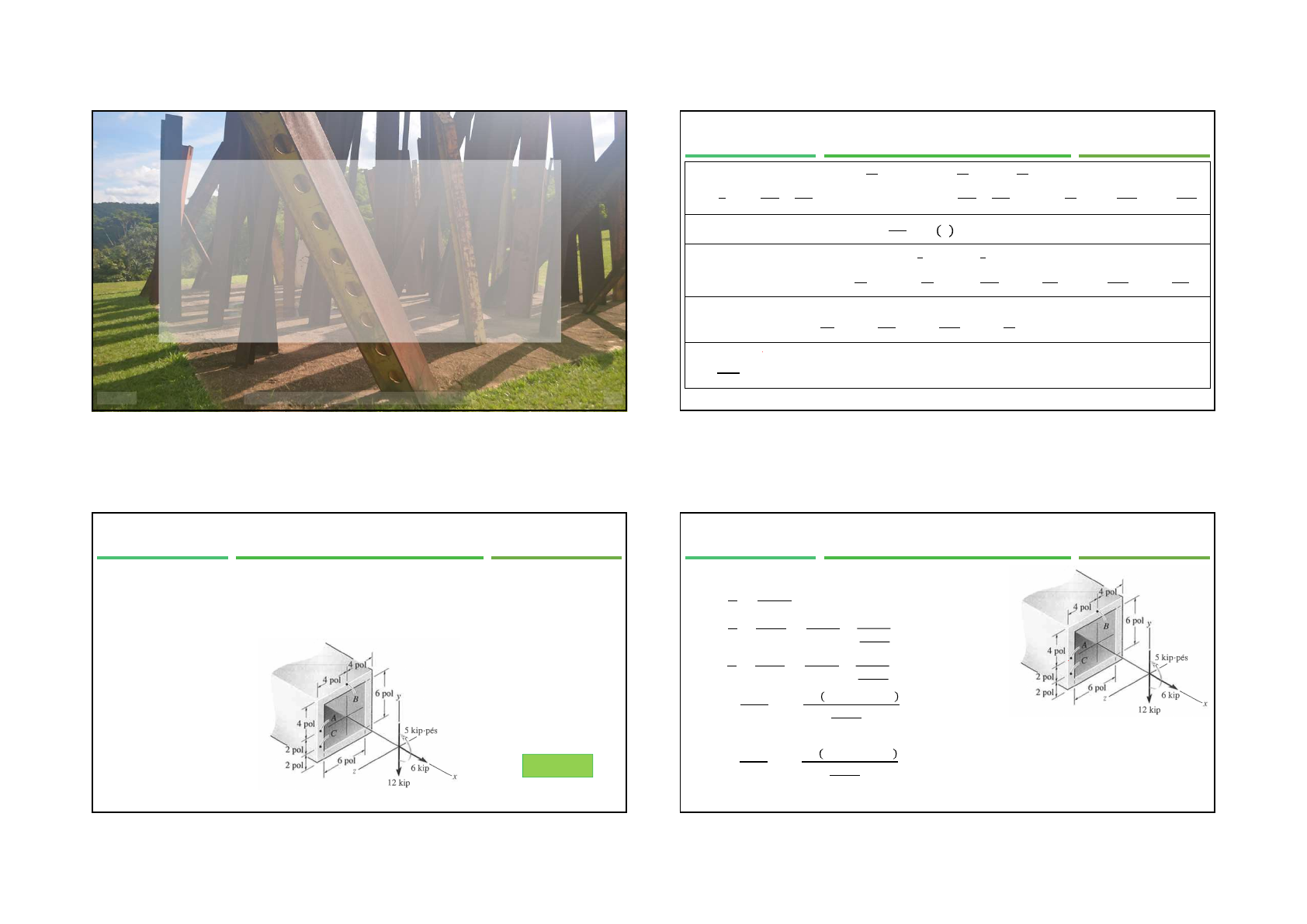 17/06/2024 1 Resistência dos Materiais III Prof.ª Fernanda Lins Gonçalves Pereira 17/06/2024 Resistência dos Materiais III - Prof.ª Fernanda Lins G. Pereira (UERJ - Eng. Civil) 1 Formulário de equações 17/06/2024 Resistência dos Materiais III - Prof.ª Fernanda Lins G. Pereira (UERJ - Eng. Civil) 2 Cargas combinadas 𝜎 = , 𝜎 = , 𝜎 = 𝜎 = , 𝜎 = + (regra da mão direita) ou 𝜎 = − + (livro), 𝜏 = , 𝜏 = , 𝜏 = Integração direta da linha elástica 𝐸𝐼 = 𝑀 𝑥 Princípio da conservação de energia 𝑈 = 𝑃Δ, 𝑈 = 𝑀𝜃 𝑈 = ∫ 𝑑𝑉 + ∫ 𝑑𝑉 = ∫ 𝑑𝑥 + ∫ 𝑑𝑥 + ∫ 𝑑𝑥 + ∫ 𝑑𝑥 Método dos trabalhos virtuais ∑ 𝑃 ⋅ Δ = ∑ 𝑢 ⋅ 𝑑𝐿 = ∫ 𝑑𝑥 + ∫ 𝑑𝑥 + ∫ 𝑑𝑥 + ∫ 𝑑𝑥 + ∫ 𝑛𝛼Δ𝑇𝑑𝑥 Propriedades geométricas de uma área 𝑦 = ∑ ∑ , 𝐼 = 𝐼 ̅ + 𝐴𝑑 , 𝐼 = 𝐼 ̅ + 𝐴𝑑 𝑑 , 𝑄 = 𝑦 𝐴 Exercício 1 • As cargas internas na seção da viga consistem de uma carga axial de 6 kip, uma força cortante de 12 kip e um momento fletor de 5 kip⋅pés. Determinar as tensões principais nos pontos A, B e C. Calcular também a tensão de cisalhamento máxima no plano nesses pontos. 17/06/2024 Resistência dos Materiais III - Prof.ª Fernanda Lins G. Pereira (UERJ - Eng. Civil) 3 Rascunho Exercício 1 • 𝜎 , , =?, 𝜎 , , =?, 𝜏 á , , =? 𝜎 = = = 0,214𝑘𝑠𝑖 𝜎 = − = − ⋅ = −0,814𝑘𝑠𝑖 𝜎 = + = + ⋅ = 0,729𝑘𝑠𝑖 𝜏 = − = − ⋅ ⋅ ⋅ , ⋅ ⋅ ⋅ = −0,951𝑘𝑠𝑖 𝜏 = 0 𝜏 = − = − ⋅ ⋅ ⋅ , ⋅ ⋅ ⋅ = −0,849𝑘𝑠𝑖 17/06/2024 Resistência dos Materiais III - Prof.ª Fernanda Lins G. Pereira (UERJ - Eng. Civil) 4 17/06/2024 2 Exercício 1 𝜎 = 0,214𝑘𝑠𝑖 e 𝜏 = −0,951𝑘𝑠𝑖 𝑐𝑒𝑛𝑡𝑟𝑜 = 0,107 e 𝑟𝑎𝑖𝑜 = 0,957 𝜎 = 1,065𝑘𝑠𝑖, 𝜎 = −0,850𝑘𝑠𝑖 e 𝜏 á = 0,957𝑘𝑠𝑖 𝜎 = −0,814𝑘𝑠𝑖 e 𝜏 = 0 𝑐𝑒𝑛𝑡𝑟𝑜 = −0,407 e 𝑟𝑎𝑖𝑜 = 0,407 𝜎 = 0𝑘𝑠𝑖, 𝜎 = −0,814𝑘𝑠𝑖 e 𝜏 á = 0,407𝑘𝑠𝑖 𝜎 = 0,729𝑘𝑠𝑖 e 𝜏 = −0,849𝑘𝑠𝑖 𝑐𝑒𝑛𝑡𝑟𝑜 = 0,364 e 𝑟𝑎𝑖𝑜 = 0,923 𝜎 = 1,288𝑘𝑠𝑖, 𝜎 = −0,559𝑘𝑠𝑖 e 𝜏 á = 0,923𝑘𝑠𝑖 17/06/2024 Resistência dos Materiais III - Prof.ª Fernanda Lins G. Pereira (UERJ - Eng. Civil) 5 Exercício 2 • A treliça da figura possui cada elemento com área da seção transversal de 2 pol2 e módulo de elasticidade de 29103 ksi. a) Determinar o deslocamento horizontal do ponto B por meio do método da Conservação da Energia. b) Determinar o deslocamento vertical do ponto B por meio do Princípio do Trabalho Virtual. 17/06/2024 Resistência dos Materiais III - Prof.ª Fernanda Lins G. Pereira (UERJ - Eng. Civil) 6 Rascunho Exercício 2 • 𝐴 = 2𝑝𝑜𝑙2 e 𝐸 = 29 × 10 𝑘𝑠𝑖, 𝛿 =? (Conservação da Energia) e 𝛿 =? (Trabalho Virtual) ∑ 𝑁 𝐿 = 𝐴𝐵 → −200 ⋅ ⋅ 10 ⋅ 12 𝐵𝐶 → 200 ⋅ ⋅ 10 ⋅ 12 𝐶𝐴 → ⋅ 12 ⋅ 12 12 ⋅ 200 ⋅ 16,89 200 ⋅ 𝛿 = ⋅ ⋅ , × ⋅ → 𝛿 = 6,99 ⋅ 10 𝑝𝑜𝑙 17/06/2024 Resistência dos Materiais III - Prof.ª Fernanda Lins G. Pereira (UERJ - Eng. Civil) 7 Exercício 2 • 𝐴 = 2𝑝𝑜𝑙2 e 𝐸 = 29 × 10 𝑘𝑠𝑖, 𝛿 =? (Conservação da Energia) e 𝛿 =? (Trabalho Virtual) ∑ 𝑁𝑛𝐿 = 𝐴𝐵 → −200 ⋅ − ⋅ 10 ⋅ 12 𝐵𝐶 → 200 ⋅ − ⋅ 10 ⋅ 12 𝐶𝐴 → ⋅ ⋅ 12 ⋅ 12 12 ⋅ 𝛿 = ⋅ × ⋅ ⋅ = 9,31 ⋅ 10 𝑝𝑜𝑙 17/06/2024 Resistência dos Materiais III - Prof.ª Fernanda Lins G. Pereira (UERJ - Eng. Civil) 8