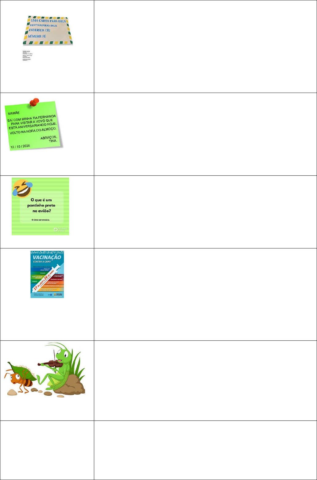 CARTA PESSOAL 2. Este gênero possui um destinatário específico. Sua estrutura é fixa, apresentando primeiramente a saudação, em seguida o corpo da mensagem e por último a despedida. Escrito na primeira pessoa do singular, pode conter linguagem formal ou informal. BILHETE 1. Texto cotidiano utilizado em contextos informais, geralmente escrito entre pessoas que possuem certo grau de afetividade. É uma mensagem simples, escrita na maioria das vezes em pequenos pedaços de papel enviada para colegas, amigos ou familiares. PIADA 3. Texto curto que narra uma situação cômica. Utilizado geralmente em ambientes informais, com linguagem simples e coloquial. Cheia de humor, com a finalidade de fazer rir. CARTAZ DE CAMPANHA 4. Tem por objetivo esclarecer e atentar os interlocutores de uma comunidade sobre determinado assunto, geralmente alguma demanda da sociedade, como doenças, vacinações,cuidados com o meio ambiente, etc. Utiliza-se linguagem verbal e não verbal para chamar a atenção do leitor. FÁBULA 5. Gênero narrativo no qual os personagens são, geralmente, animais com características humanas, principalmente a fala. O título geralmente conta com o nome de animais e, ao final, é apresentada uma moral. CONTO 6. Gênero narrativo curto que apresenta um conflito central. São delimitados enredo, tempo e espaço. Tem o foco em determinado acontecimento, geralmente ficcional que apresenta poucos personagens. DIÁRIO ÍNTIMO 7. É escrito em linguagem informal, apresenta data e geralmente o destinatário é a própria pessoa que está escrevendo. São narrados fatos e sentimentos relacionados ao autor como forma de desabafo. BIOGRAFIA 8. Gênero em que o autor narra a história de vida e realizações de determinada pessoa. Escrito em terceira pessoa, utiliza marcos temporais e linguagem formal. Os fatos são narrados, geralmente, no tempo pretérito. RECEITA 9. É um texto instrucional permeado de descrições. O objetivo é instruir o leitor para preparar algo, geralmente uma comida. BULA 10. Gênero informativo que apresenta características de medicamentos, além de informações como indicação, posologia e modo de uso. NOTÍCIA 11. Apresenta linguagem narrativa e descritiva e o objetivo é informar algo que aconteceu. É um texto relativamente curto, que utiliza linguagem formal, clara e objetiva. É impessoal, escrito na terceira pessoa, apresenta título e é veiculado em meios de comunicação. PROPAGANDA 12. Possui como característica marcante a linguagem argumentativa e expositiva, podendo também haver pequenas descrições. O objetivo é sempre o mesmo: divulgar o produto/serviço e influenciar a opinião do leitor para que ele “compre” a ideia. E.MAIL 13. Gênero que se caracteriza pela correspondência entre pessoas realizada de forma virtual. É necessário haver um vocativo como saudação, a mensagem e por fim a despedida. CORDEL 14. Manifestação da cultura regional brasileira, principalmente do nordeste. Sua apresentação geralmente é em forma de folhetos. Utilizam-se rimas, com linguagem informal e temas diversos, como folclore e contos populares. CRÔNICA 16. Texto narrativo curto, conta acontecimentos corriqueiros do cotidiano. Contém linguagem direta, simples. Conta com poucos personagens, quando há. É um gênero produzido para jornais e revistas. CONVITE 17. Texto geralmente direcionado a pessoas conhecidas, como parentes e familiares. Constam informações sobre determinado evento, como data, horário e local de sua realização. CONTOS DE FADAS 18. Narrativa em que aparecem seres encantados e elementos mágicos pertencentes a um mundo imaginário, maravilhoso. Geralmente é uma história antiga, contada por gerações. Tem uma característica bem marcante como na sua fórmula inicial: “Era uma vez...’’ e final: “...foram felizes para sempre’’. CARTUM 19. Gênero jornalístico que satiriza e expõe situações cotidianas. Utiliza principalmente imagens, com personagens genéricos, aliadas a pequenos textos. O humor e a ironia são sempre presentes. INFOGRÁFICO 20. Gênero que a une texto e elementos visuais para transmitir informações. Seu principal objetivo é mostrar dados de forma visualmente atraente e clara. É muito usado em campanhas de publicidade e no jornalismo. Atualmente, é muito frequente nas redes sociais." LENDA é uma narrativa transmitida oralmente pelas pessoas, visando explicar acontecimentos misteriosos ou sobrenaturais, misturando fatos reais, com imaginários ou fantasiosos, e que vão se modificando através do imaginário popular. CARTA DE RECLAMAÇÃO é um gênero de texto usado em situações de comunicação, nas quais o cidadão deseja externar alguma injustiça, insatisfação, algo que julgue ser impróprio ou errado; e, ainda, solicitar uma resolução para seu problema. POEMA 15. Gênero textual dividido em estrofes e versos. Os temas geralmente são subjetivos, ligados a sentimentos e emoções POR: SONIA A. GIORDANI