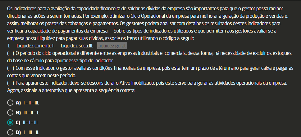 Os indicadores para a avaliação da capacidade financeira de saldar as dívidas da empresa são importantes para que possa melhor direcionar as ações a serem tomadas. Por exemplo, otimizar Ciclo Operacional da empresa para melhorar a geração da produção e vendas e, assim, melhorar prazos das cobranças e pagamentos. Os gestores podem analisar com detalhes os resultados destes indicadores para verificar a capacidade de pagamentos da empresa. Sobre tipos de indicadores utilizados e que permitem aos gestores avaliar se a empresa possui liquidez para pagar suas dívidas, associe itens utilizando código a seguir: I. Liquidez corrente.II. Liquidez seca.III. Liquidez geral. ( ) 0 período do ciclo operacional é diferente entre as empresas industriais e comerciais, dessa forma, há necessidade de excluir os estoques da base de cálculo para apurar esse tipo de indicador. ( ) Com esse indicador, gestor avalia as condições financeiras da empresa, pois esta tem um prazo de até um ano para gerar caixa e pagar as contas que vencem neste período. ( ) Para apurar este indicador, deve-se desconsiderar Ativo Imobilizado, pois este serve para gerar as atividades operacionais da empresa. Agora, assinale a alternativa que apresenta a correta: A) I II - III. B) III II I. C) - - III. D) I-III - II.