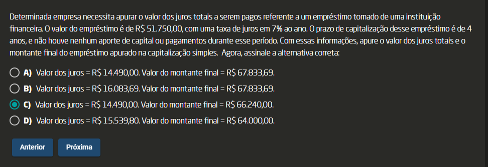 Determinada empresa necessita apurar valor dos juros totais a serem pagos referente a um empréstimo tomado de uma instituição financeira. 0 valor do empréstimo é de R$ com empréstimo é de 4 anos, e não houve nenhum aporte de capital pagamentos durante esse período. Com essas informações, apure valor dos juros totais e montante final do empréstimo apurado na capitalização simples. Agora, assinale a alternativa correta: A) Valor dos juros = Valor do montante final = R$ 67.833,69. B) Valor dos juros = R$ 16.083,69. Valor do montante final = R$ 67.833,69. C) Valor dos juros = Valor do montante final = R$ 66.240,00. D) Valor dos juros = Valor do montante final = Anterior Próxima