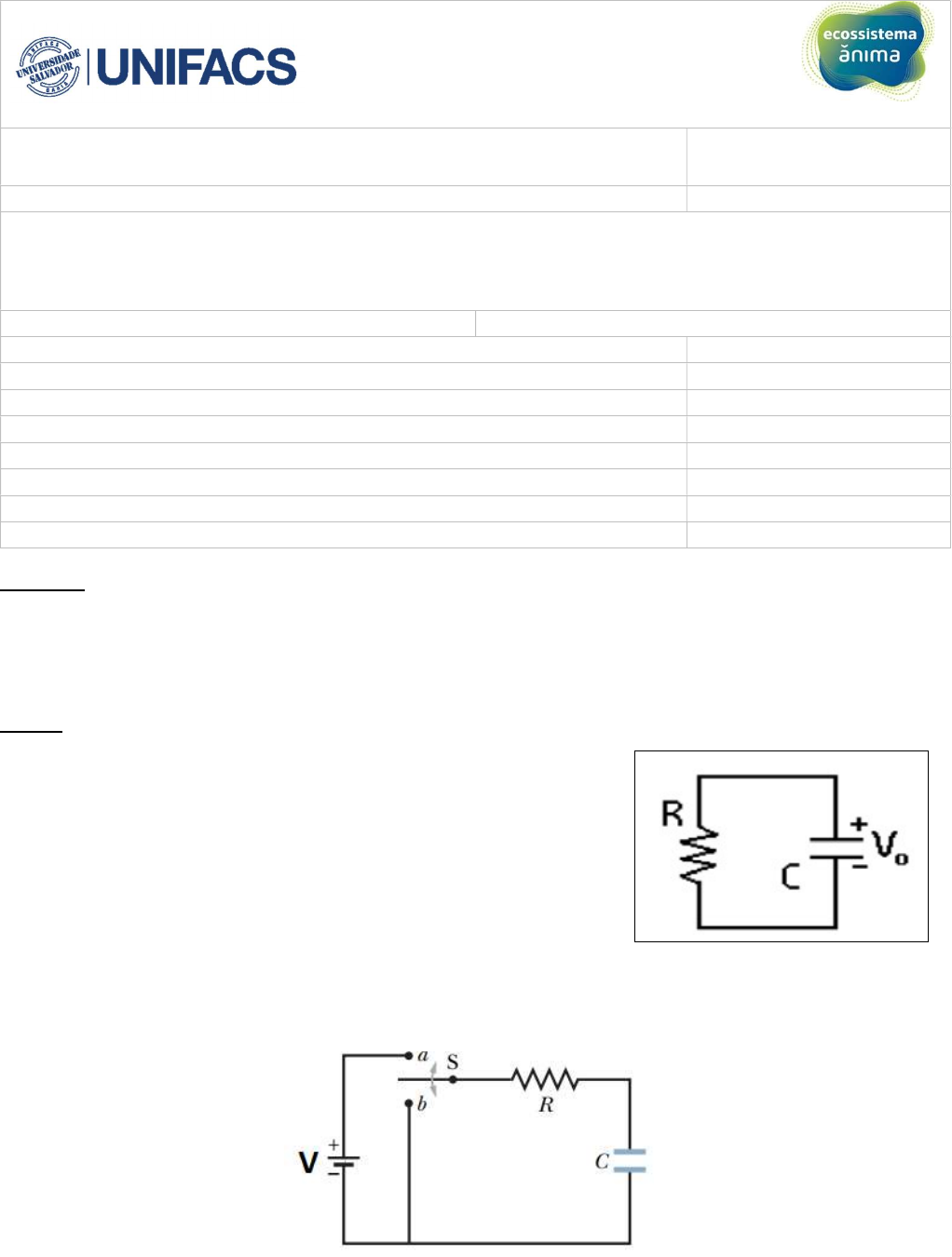 Objetivos: Estudar os processos de carga e descarga de um capacitor Determinar a constante de tempo de um circuito RC série nas situações de carga e descarga do capacitor; Teoria: O circuito RC mais simples é aquele constituído por um capacitor inicialmente carregado com uma tensão V0 descarregando sobre um resistor, conforme esquema ao lado. Carga de um capacitor Considere o circuito abaixo. O processo de carga ocorre quando a chave é ligada em a, completando o circuito série. No momento que o circuito é completado, cargas começam a se mover (surge uma corrente no circuito). Essa corrente acumula uma carga q cada vez maior nas placas do capacitor e estabelece uma diferença de potencial VC = q/C cada vez maior entre as placas do capacitor. Quando a diferença de potencial é igual à diferença de potencial entre os terminais da fonte (que é igual, por sua vez, à força eletromotriz), a corrente deixa de circular. AVALIAÇÃO A3 – ATIVIDADE 4 - LABORATÓRIO VIRTUAL Unidade Curricular Modelagem e Simulação de Sistemas Elétricos e Magnéticos DATA ENTREGA Profas.: Ivana Matos e Kelly Abreu ____/____/____ Observação: 1. A atividade deve ser entregue na sala de aula profa. Ivana Matos na data de entrega. 2. Os cálculos do item devem ser realizados de forma manuscritas com todos os detalhes. 3. Esse material foi cedido pelos professores da Universidade São Judas (Ânima Educação) e adaptado. TEMA: Carga e Descarga de um Capacitor Grupo: NOME COMPONENTES RA Começamos por aplicar a regra das malhas ao circuito, percorrendo-o no sentido horário a partir do terminal negativo da fonte. Temos: 𝑉 − 𝑅𝑖 − 𝑞 𝐶 = 0 Lembrando que 𝑖 = 𝑑𝑞 𝑑𝑡 Pode-se chegar à equação diferencial que descreve o comportamento desse circuito. 𝑅 𝑑𝑞 𝑑𝑡 + 𝑞 𝐶 = 𝑉 A solução dessa equação nos fornece 𝑞 = 𝐶𝑉(1 − 𝑒 ) e 𝑉 = 𝑞 𝐶 = 𝑉(1 − 𝑒 ) Constante de tempo O produto RC que aparece nas expressões acima tem dimensão de tempo (tanto porque o argumento de uma exponencial deve ser adimensional como porque 1,0 Ω × 1,0 F = 1,0 s). O produto RC é chamado de CONSTANTE DE TEMPO CAPACITIVA do circuito e representado pela letra grega 𝝉. No instante t= RC a carga do capacitor inicialmente descarregado aumentou de zero para 𝑞 = 𝐶𝑉(1 − 𝑒 ) = 0,63𝐶𝑉 Descarga do capacitor Suponha agora que o capacitor da figura esteja totalmente carregado, ou seja, com um potencial V0 igual à força eletromotriz da fonte. Em um novo instante t = 0, a chave S é deslocada da posição a para a posição b, fazendo com que o capacitor comece a se descarregar através da resistência R. Nesse caso, como variam com o tempo a carga q do capacitor e a corrente i no circuito? A equação diferencial que descreve a variação de q com o tempo é dada por: 𝑅 𝑑𝑞 𝑑𝑡 + 𝑞 𝐶 = 0 Resolvendo esta equação, temos: 𝑞 = 𝑞 𝑒 / e 𝑉 = 𝑉 𝑒 ⁄ De acordo com a expressão acima, a carga q diminui exponencialmente com o tempo, a uma taxa que depende da constante de tempo capacitiva 𝝉 = RC. No instante t = RC, a carga do capacitor diminuiu para, aproximadamente, 37% do valor inicial. Resumindo carga descarga Equação diferencial: 𝑉 = 𝑅 𝑑𝑄 𝑑𝑡 + 𝑄 𝐶 𝑅 𝑑𝑄 𝑑𝑡 + 𝑄 𝐶 = 0 Solução 𝑄(𝑡) = 𝐶𝑉(1 − 𝑒 ) 𝑉 (𝑡) = 𝑉(1 − 𝑒 ) 𝑄(𝑡) = 𝐶𝑉𝑒 𝑉 (𝑡) = 𝑉𝑒 t = RC → 𝑉 (𝑅𝐶) = 0,63𝑉 𝑉 (𝑅𝐶) = 0,37𝑉 Procedimento: Acesse o link abaixo para realizar as suas atividades: https://phet.colorado.edu/sims/html/circuit-construction-kit-ac/latest/circuit-construction-kit-ac_en.html ou https://phet.colorado.edu/pt_BR/simulation/legacy/circuit-construction-kit-ac Para rodar o simulador, é necessário que a sua máquina tenha instalada a última versão do JAVA. Caso não tenha, acesse o link abaixo para fazer a instalação: https://tecnoblog.net/58424/instalar-java-maquina-virtual-imposto-de-renda/ 1. Monte o circuito abaixo no simulador. Use uma bateria (CC) de 30 V, e um capacitor com capacitância C = 0,12F. Os valores de R serão variados. Obtenha os gráficos para a tensão no capacitor em função do tempo, para CARGA E DESCARGA, para os seguintes valores de R. Insira os gráficos abaixo e anote os tempos de carga e descarga. R = 10 Carga Descarga Tempo de carga = Tempo de descarga = R = 50 Carga Descarga Tempo de carga = Tempo de descarga = R= 100 Carga Descarga Tempo de carga = Tempo de descarga = 2. Para o circuito montado, use uma bateria (CC) de 30 V, um capacitor com capacitância C = 0,12F e um resistor de 10 . Com a chave em a, use o voltímetro e o cronômetro para medir a tensão em função do tempo durante a carga do capacitor. Anote os valores na tabela 1. t(s) V(V) t(s) V(V) t(s) V(V) t(s) V(V) 0 0 1,44 3,24 5,88 0,24 1,92 3,96 6,96 0,48 2,16 4,32 7,98 0,72 2,4 4,68 8,97 0,96 2,64 5,04 9,96 1,2 2,88 5,4 10,98 Quanto tempo demorou a carga completa do capacitor? Pare a simulação sem descarregar o capacitor (em 30V). Ligue a chave em b e meça os valores de tensão em função do tempo. Anote os valores na tabela 2 abaixo. t(s) V(V) t(s) V(V) t(s) V(V) t(s) V(V) 0 30 1,44 3,24 5,88 0,24 1,92 3,96 6,96 0,48 2,16 4,32 7,98 0,72 2,4 4,68 8,97 0,96 2,64 5,04 9,96 1,2 2,88 5,4 10,98 Quanto tempo demorou a descarga completa do capacitor? Com os dados das tabelas, faça no Excel, em um mesmo sistema de eixos coordenados, o gráfico de V em função de t, tanto da CARGA quanto da DESCARGA do capacitor. Adicione legenda. Faça um print do gráfico, imprima e cole o gráfico no abaixo. A partir dos gráficos, obtenha a constante de tempo, tanto para a carga, quanto para a descarga. (Os cálculos devem ser manuscritos no espaço abaixo)