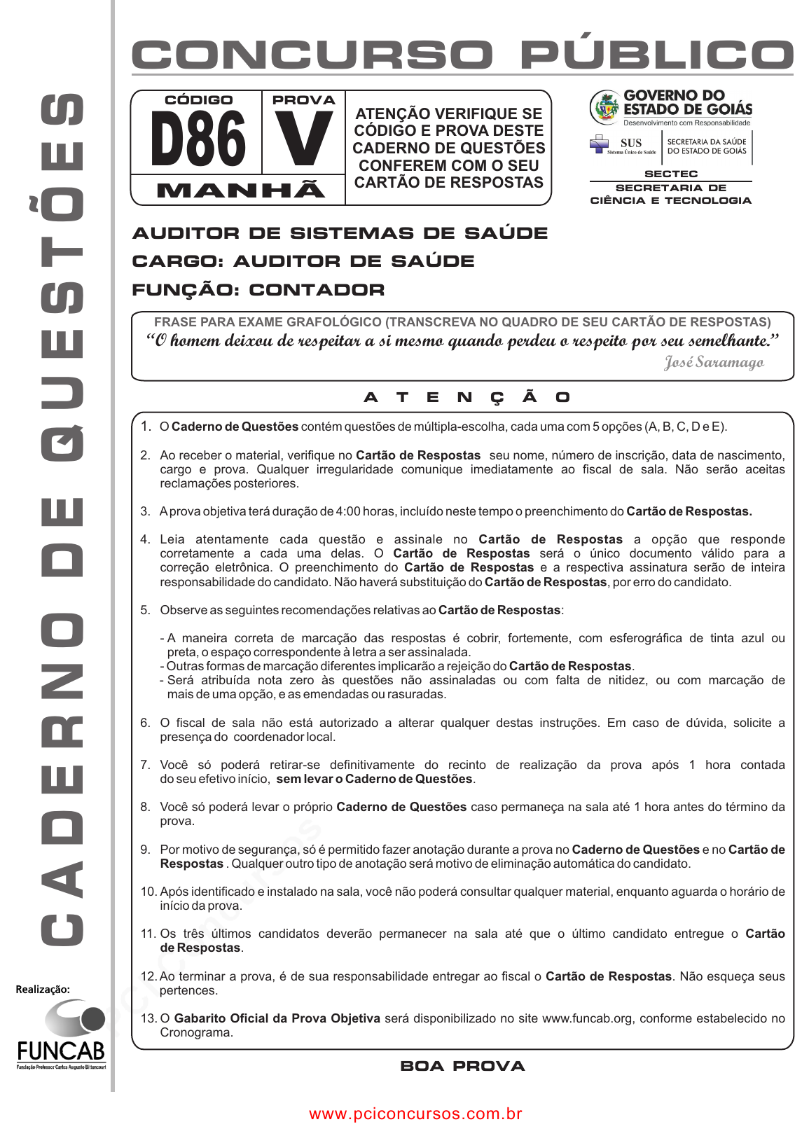 pcimarkpci MDAwMDowMDAwOjAwMDA6MDAwMDowMDAwOmZmZmY6MmQ4YzpjMGQ3:V2VkLCAyNyBOb3YgMjAyNCAwMDo1NzoxOCAtMDMwMA== www.pciconcursos.com.br BOA PROVA AUDITOR DE SISTEMAS DE SAÚDE CARGO: AUDITOR DE SAÚDE FUNÇÃO: CONTADOR FRASE PARA EXAME GRAFOLÓGICO (TRANSCREVA NO QUADRO DE SEU CARTÃO DE RESPOSTAS) “O homem deixou de respeitar a si mesmo quando perdeu o respeito por seu semelhante.” José Saramago C A D E R N O D E Q U E S T Õ E S CONCURSO PÚBLICO VD86 ATENÇÃO VERIFIQUE SE CÓDIGO E PROVA DESTE CADERNO DE QUESTÕES CONFEREM COM O SEU CARTÃO DE RESPOSTAS PROVACÓDIGO MANHÃ A T E N Ç Ã O SECTEC SECRETARIA DE CIÊNCIA E TECNOLOGIA 1. O contém questões de múltipla-escolha, cada uma com 5 opções (A, B, C, D e E). 2. Ao receber o material, verifique no seu nome, número de inscrição, data de nascimento, cargo e prova. Qualquer irregularidade comunique imediatamente ao fiscal de sala. Não serão aceitas reclamações posteriores. 3. Aprova objetiva terá duração de 4:00 horas, incluído neste tempo o preenchimento do 4. Leia atentamente cada questão e assinale no a opção que responde corretamente a cada uma delas. O será o único documento válido para a correção eletrônica. O preenchimento do e a respectiva assinatura serão de inteira responsabilidade do candidato. Não haverá substituição do , por erro do candidato. 5. Observe as seguintes recomendações relativas ao : - A maneira correta de marcação das respostas é cobrir, fortemente, com esferográfica de tinta azul ou preta, o espaço correspondente à letra a ser assinalada. - Outras formas de marcação diferentes implicarão a rejeição do . - Será atribuída nota zero às questões não assinaladas ou com falta de nitidez, ou com marcação de mais de uma opção, e as emendadas ou rasuradas. 6. O fiscal de sala não está autorizado a alterar qualquer destas instruções. Em caso de dúvida, solicite a presença do coordenador local. 7. Você só poderá retirar-se definitivamente do recinto de realização da prova após 1 hora contada do seu efetivo início, . 8. Você só poderá levar o próprio caso permaneça na sala até 1 hora antes do término da prova. 9. Por motivo de segurança, só é permitido fazer anotação durante a prova no e no . Qualquer outro tipo de anotação será motivo de eliminação automática do candidato. 10. Após identificado e instalado na sala, você não poderá consultar qualquer material, enquanto aguarda o horário de início da prova. 11. Os três últimos candidatos deverão permanecer na sala até que o último candidato entregue o . 12. Ao terminar a prova, é de sua responsabilidade entregar ao fiscal o . Não esqueça seus pertences. 13. O será disponibilizado no site www.funcab.org, conforme estabelecido no Cronograma. Caderno de Questões Cartão de Respostas Cartão de Respostas. Cartão de Respostas Cartão de Respostas Cartão de Respostas Cartão de Respostas Cartão de Respostas Cartão de Respostas sem levar o Caderno de Questões Caderno de Questões Caderno de Questões Cartão de Respostas Cartão de Respostas Cartão de Respostas Gabarito Oficial da Prova Objetiva www.pciconcursos.com.br pcimarkpci MDAwMDowMDAwOjAwMDA6MDAwMDowMDAwOmZmZmY6MmQ4YzpjMGQ3:V2VkLCAyNyBOb3YgMjAyNCAwMDo1NzoxOCAtMDMwMA== www.pciconcursos.com.br 02 CONHECIMENTOS GERAIS Leia o texto abaixo e responda às questões propostas. Duas vezes por dia, pela manhã e pela tarde, o aparelho de videogame era instalado no quarto de Lucas Savaris Morcelli, 14 anos, na unidade de terapia intensiva do Hospital Vita, em Curitiba. Durante as sessões de meia hora cada uma, o garoto jogava beisebol ao mesmo tempo em que fazia exercícios sob orientação do fisioterapeuta. Ele precisava sincronizar a respiração com o movimento de rebater a bola virtual. A gameterapia se estendeu pelas duas semanas que Lucas permaneceu na UTI. O adolescente sofre de fibrose cística, doença genética crônica que causa excesso de secreção nos pulmões. O jogo ajudou Lucas a ampliar sua capacidade pulmonar e também lhe fortaleceu os músculos e a autoestima. “Melhorei muito no beisebol. Agora, faço mais de 10 pontos. Meu pai não joga comigo porque sabe que vai perder”, diz. Hoje, uma dezena de pacientes da UTI do hospital paranaense frequenta sessões de gameterapia. Quando surgiram, nos anos 80, os videogames eram acusados de incentivar o sedentarismo. Essa visão sofreu uma reviravolta nos últimos três anos, com o lançamento de jogos equipados com sensores de movimento, que transformam o corpo do jogador em joystick. Como eles transferem os movimentos do jogador para a ação do game na tela, é preciso deixar o sofá para dar raquetadas em bolas de tênis ou chutar bolas virtuais. Por isso o console Wii, da Nintendo, e o jogo Eye Toy do PlayStation 2, da Sony, são bons exercícios físicos. A utilização terapêutica desses games começou dois anos atrás no Canadá. Hoje ocorre em pelo menos cinco outros países como complemento na reabilitação de pacientes com sequelas de derrames cerebrais ou vítimas de doenças degenerativas, como Parkinson. O pioneiro no Brasil foi o Hospital Vita, em março. A reação dos pacientes foi entusiástica. “Nunca tinha visto pacientes tão afoitos para fazer exercícios”, diz Esperidião Elias Aquim, chefe do serviço de fisioterapia do hospital. As primeiras experiências, por sinal, foram realizadas com o console de Wii que o fisioterapeuta trouxe de casa. Depois de dez meses de uso, Aquim não tem dúvida sobre os benefícios da gameterapia para pacientes internados na UTI. Ele descobriu igualmente alguns riscos. “O esforço físico, somado à empolgação dos pacientes, pode fazer a pressão sanguínea subir perigosamente”, diz Aquim. Um dos jogos mais usados nos hospitais de todo o mundo é o Wii Fit. Ele tem 48 exercícios, orientados por um treinador virtual, para a tonificação de músculos, atividades aeróbicas, ioga e treinos de