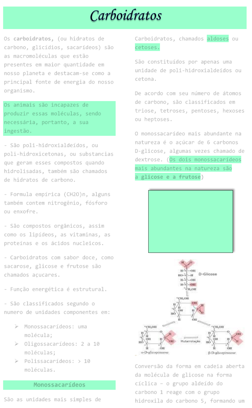Os carboidratos, (ou hidratos de carbono, glicídios, sacarídeos) são as macromoléculas que estão presentes em maior quantidade em nosso planeta e destacam-se como a principal fonte de energia do nosso organismo. Os animais são incapazes de produzir essas moléculas, sendo necessária, portanto, a sua ingestão. - São poli-hidroxialdeídos, ou poli-hidroxicetonas, ou substancias que geram esses compostos quando hidrolisadas, também são chamados de hidratos de carbono. - Formula empírica (CH2O)n, alguns também contem nitrogênio, fósforo ou enxofre. - São compostos orgânicos, assim como os lipídeos, as vitaminas, as proteínas e os ácidos nucleicos. - Carboidratos com sabor doce, como sacarose, glicose e frutose são chamados açucares. - Função energética é estrutural. - São classificados segundo o numero de unidades componentes em: Monossacarídeos: uma molécula; Oligossacarídeos: 2 a 10 moléculas; Polissacarídeos: > 10 moléculas. Monossacarídeos São as unidades mais simples de Carboidratos, chamados aldoses ou cetoses. São constituídos por apenas uma unidade de poli-hidroxialdeídos ou cetona. De acordo com seu número de átomos de carbono, são classificados em triose, tetroses, pentoses, hexoses ou heptoses. O monossacarídeo mais abundante na natureza é o açúcar de 6 carbonos D-glicose, algumas vezes chamado de dextrose. (Os dois monossacarídeos mais abundantes na natureza são a glicose e a frutose) Conversão da forma em cadeia aberta da molécula de glicose na forma cíclica – o grupo aldeído do carbono 1 reage com o grupo hidroxila do carbono 5, formando um Pentose – C5H10O5 - Ribose (DNA) - Desoxirribose (RNA) Hexose - C6H12O6 - Glicose - Frutose - Galactose hemicetal cíclico hexagonal, que pode existir como dois isômeros, α e β. Na realidade, os átomos que compõe o anel das formas cíclicas dos monossacarídeos não se situam no mesmo plano, como mostrado na figura anterior. As moléculas tendem a assumir outras conformações de menor conteúdo energético – a conformação mais frequente da glicose é chamada “cadeira”. Oligossacarídeos São monossacarídeos unidos por ligações glicosídicas e destacam-se por serem cadeias curtas. Como exemplo de oligossacarídeos, podemos citar a sacarose (formada por glicose e frutose, unidas por ligação α-1,2) e a lactose (constituída de glicose e galactose, unidas por ligação β- 1,4). Estas ligações são formadas entre duas hidroxilas de duas moléculas de monossacarídeos, pela exclusão de uma molécula de água. Maltose: glicose + glicose Polissacarídeos São monossacarídeos também unidos por ligação glicosídica, mas, diferentemente dos oligossacarídeos, apresentam milhares de monossacarídeos unidos mais comumente a glicose. Podem formar cadeias lineares, como na celulose e na quitina, ou cadeias ramificadas, como no amido e no glicogênio. - Amidos: união de glicoses, reserva energética de plantas e algas; - Glicogênio: união de glicoses, reserva energética em animais e fungos; - Celulose: parede celular (plantas); - Quitina: exoesqueleto (artrópodes), parede celular (fungos). Cada polímero está classificado como um homopolissacarideo (homo) ou hetopolissacarideo (hetero). Glicoconjugados As glicoproteínas e glicolipidios são marcadores responsáveis pela determinação dos grupos sanguíneos. Funções do carboidrato Os carboidratos apresentam diferentes funções nos organismos vivos. Destacam-se: - Função energética: Os carboidratos são utilizados pelas células para a produção de ATP, fornecendo, portanto, energia para a realização das atividades celulares. A glicose é o principal carboidrato utilizado pelas células para produzir energia; - Função estrutural: Alguns carboidratos destacam-se por seu carácter estrutural. Esse é o caso da celulose, que é o principal componente da parede celular dos vegetais, e a quitina, um carboidrato encontrado no exoesqueleto de artrópodes; - Função de reserva energética: Além de fornecer energia de maneira imediata, os carboidratos podem ser armazenados de diferentes formas. Nos vegetais, o carboidrato de reserva é o amido; nos animais, o carboidrato de reserva é o glicogênio. Fontes de carboidrato Quando falamos em fontes de carboidratos, logo pensamos em pães, massas, arroz e cereais. Entretanto, apesar de serem ricos nessas macromoléculas, não são os únicos que as contêm. Todos os produtos de origem vegetal possuem carboidratos, sendo assim, frutas, verduras e legumes são fontes desse nutriente. Vale destacar também que o mel, apesar de ter origem animal, é um exemplo de carboidrato. Nucleotídeos e metabolismo energético NAD, FAD, NADP E ATP Nucleotídeos são compostos de pentose ligada a fosfato e a uma base nitrogenada e representam os monômeros dos ácidos nucleicos. Além de participarem da informação da célula (DNA e RNA),os nucleotídeos são fundamentais para o metabolismo energético, em especial o ADP/ATP,NAD,NADP e FAD, todos nucleotídeos que apresentam o nucleosídeo adenosina. Nucleosideos = são formados de uma pentose e uma base nitrogenada. Nucleotídeo = São nucleosideos fosfatados. Fosforilando uma adenosina (ou seja, transferindo um fosfato a ela) tem se o AMP, Adenosina monofosfato: Fosforilando o AMP, forma se o ADP, adenosina difosfato: O ATP é resultado da fosforilação do ADP: Nicotinamida Adenosina Dinucleotídeo NAD NAD+ e FAD+ são antioxidantes que participam da respiração celular, recebendo hidrogênio e se tornando NADH e FADH2. NAD é formado por uma adenosina ligada por dois fosfatos a uma ribose, ligada a uma nicotinamida (vitamina B3): O NAD+ é a forma oxidada que, ao receber hidrogênio, produz a forma reduzida NADH. Observe as diferenças entre NAD+ e NADH o grupo nicotinamida do NAD+(no retângulo vermelho) que apresenta um carbono insaturado que faz ligação dupla) esse carbono se torna saturado (apenas com ligações simples), se