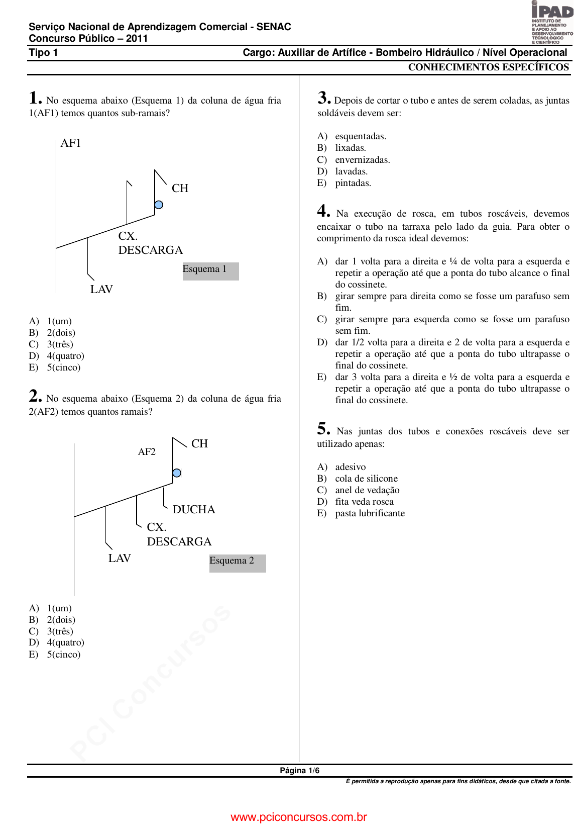 pcimarkpci MDAwMDowMDAwOjAwMDA6MDAwMDowMDAwOmZmZmY6MmQ4YzpjMGQ3:V2VkLCAyNyBOb3YgMjAyNCAwMDo0Mzo0NyAtMDMwMA== www.pciconcursos.com.br Serviço Nacional de Aprendizagem Comercial - SENAC Concurso Público – 2011 Tipo 1 Cargo: Auxiliar de Artífice - Bombeiro Hidráulico / Nível Operacional Página 1/6 É permitida a reprodução apenas para fins didáticos, desde que citada a fonte. CONHECIMENTOS ESPECÍFICOS 1. No esquema abaixo (Esquema 1) da coluna de água fria 1(AF1) temos quantos sub-ramais? A) 1(um) B) 2(dois) C) 3(três) D) 4(quatro) E) 5(cinco) 2. No esquema abaixo (Esquema 2) da coluna de água fria 2(AF2) temos quantos ramais? A) 1(um) B) 2(dois) C) 3(três) D) 4(quatro) E) 5(cinco) 3. Depois de cortar o tubo e antes de serem coladas, as juntas soldáveis devem ser: A) esquentadas. B) lixadas. C) envernizadas. D) lavadas. E) pintadas. 4. Na execução de rosca, em tubos roscáveis, devemos encaixar o tubo na tarraxa pelo lado da guia. Para obter o comprimento da rosca ideal devemos: A) dar 1 volta para a direita e ¼ de volta para a esquerda e repetir a operação até que a ponta do tubo alcance o final do cossinete. B) girar sempre para direita como se fosse um parafuso sem fim. C) girar sempre para esquerda como se fosse um parafuso sem fim. D) dar 1/2 volta para a direita e 2 de volta para a esquerda e repetir a operação até que a ponta do tubo ultrapasse o final do cossinete. E) dar 3 volta para a direita e ½ de volta para a esquerda e repetir a operação até que a ponta do tubo ultrapasse o final do cossinete. 5. Nas juntas dos tubos e conexões roscáveis deve ser utilizado apenas: A) adesivo B) cola de silicone C) anel de vedação D) fita veda rosca E) pasta lubrificante AF2 AF1 LAV CX. DESCARGA CH Esquema 1 LAV CX. DESCARGA CH DUCHA Esquema 2 www.pciconcursos.com.br pcimarkpci MDAwMDowMDAwOjAwMDA6MDAwMDowMDAwOmZmZmY6MmQ4YzpjMGQ3:V2VkLCAyNyBOb3YgMjAyNCAwMDo0Mzo0NyAtMDMwMA== www.pciconcursos.com.br Serviço Nacional de Aprendizagem Comercial - SENAC Concurso Público – 2011 Tipo 1 Cargo: Auxiliar de Artífice - Bombeiro Hidráulico / Nível Operacional Página 2/6 É permitida a reprodução apenas para fins didáticos, desde que citada a fonte. 6. As virolas dos tubos utilizados nas instalações prediais de esgotos ficam na (o): A) Ponta do tubo. B) Bolsa do tubo. C) Anel de borracha de vedação. D) Flange da caixa sifonada. E) Nipel do joelho. 7. As figuras I, II e III representam ferramentas utilizadas na execução de instalações prediais de água e de esgoto sanitário. (I) (II) (III) Assinale a alternativa que corresponde respectivamente à nomenclatura das figuras: A) I-martelos de borrachas; II – morsa; III – chave de boca. B) I-chaves de boca; II – furadeira; III – alicate. C) I-serras; II – morsa; III – chave inglesa. D) I-rosqueador; II – pressurizador; III – chave de fenda. E) I-rosqueador; II – furadeira; III – chave de boca. 8. A figura abaixo representa uma conexão utilizada nos ramais de descarga e de esgoto e é de um (a): A) Recipiente de lixo. B) Caixa de despejos. C) Caixa sifonada. D) Ralo seco. E) Ralo sifonado. 9. Os tubos de PVC rígido, em relação aos tubos de ferro e cobre utilizados nas instalações prediais de água fria, apresentam como vantagem a seguinte característica: A) Alta resistência ao calor. B) Resistência à degradação por exposição prolongada aos raios solares. C) Não produz fumaça e gás tóxico quando em combustão. D) Pode ser usado imediatamente após a execução de junta soldável. E) Resistência à corrosão. www.pciconcursos.com.br pcimarkpci MDAwMDowMDAwOjAwMDA6MDAwMDowMDAwOmZmZmY6MmQ4YzpjMGQ3:V2VkLCAyNyBOb3YgMjAyNCAwMDo0Mzo0NyAtMDMwMA== www.pciconcursos.com.br Serviço Nacional de Aprendizagem Comercial - SENAC Concurso Público – 2011 Tipo 1 Cargo: Auxiliar de Artífice - Bombeiro Hidráulico / Nível Operacional Página 3/6 É permitida a reprodução apenas para fins didáticos, desde que citada a fonte. 10. As figuras I, II e III representam conexões utilizadas em uma instalação predial de esgoto sanitário. (I) (II) (III) Assinale a alternativa que corresponde respectivamente à nomenclatura das figuras: A) I-junção; II – anel de borracha; III – terminal de ventilação. B) I-tê; II – caixas de gorduras; III – anel de borracha. C) I-joelho; II – terminal de ventilação; III – engate. D) I-junção; II – anel de borracha; III – engate. E) I-joelho; II – engate; III – tê com visita. 11. As instalações de cobre são de custo alto. Podemos afirmar que é uma desvantagem dos tubos e conexões de cobre: A) Maior deformação ao calor. B) Entram em combustão nas temperaturas usuais de incêndios nas edificações. C) Menor resistência às pressões. D) Não podem ser utilizados imediatamente após a execução das juntas. E) Maior dificuldade nas montagens dos tubos e conexões. 12. Em uma planta de instalação predial de esgoto a figura abaixo é a representação de um (a) A) vaso sanitário com caixa acoplada B) bidê C) lavatório D) cuba de sobrepor E) box www.pciconcursos.com.br pcimarkpci MDAwMDowMDAwOjAwMDA6MDAwMDowMDAwOmZmZmY6MmQ4YzpjMGQ3:V2VkLCAyNyBOb3YgMjAyNCAwMDo0Mzo0NyAtMDMwMA== www.pciconcursos.com.br Serviço Nacional de Aprendizagem Comercial - SENAC Concurso Público – 2011 Tipo 1 Cargo: Auxiliar de Artífice - Bombeiro Hidráulico / Nível Operacional Página 4/6 É permitida a reprodução apenas para fins didáticos, desde que citada a fonte. 13. Em uma planta de instalação predial de água a figura abaixo é a representação de um (a) A) área de serviço B) cozinha C) lavatório D) vaso sanitário E) chuveiro (box) 14. Os tubos e conexões de ferro fundido são largamente empregados nas redes de água e esgoto com diâmetro acima de 2 polegadas. Os tubos de ferro são fabricados em dois tipos, que são: A) roscável e chapado. B) soldável e chapado. C) ponta e bolsa e cilíndrico. D) retangular eclipse. E) lamina