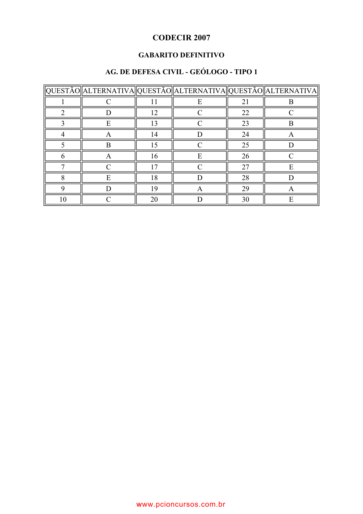 pcimarkpci MDAwMDowMDAwOjAwMDA6MDAwMDowMDAwOmZmZmY6MmQ4YzpjMGQ3:V2VkLCAyNyBOb3YgMjAyNCAwMTowNDoyMCAtMDMwMA== www.pciconcursos.com.br CODECIR 2007 GABARITO DEFINITIVO AG. DE DEFESA CIVIL - GEÓLOGO - TIPO 1 QUESTÃO ALTERNATIVA QUESTÃO ALTERNATIVA QUESTÃO ALTERNATIVA 1 C 11 E 21 B 2 D 12 C 22 C 3 E 13 C 23 B 4 A 14 D 24 A 5 B 15 C 25 D 6 A 16 E 26 C 7 C 17 C 27 E 8 E 18 D 28 D 9 D 19 A 29 A 10 C 20 D 30 E wwww.pcioncursos.com.br