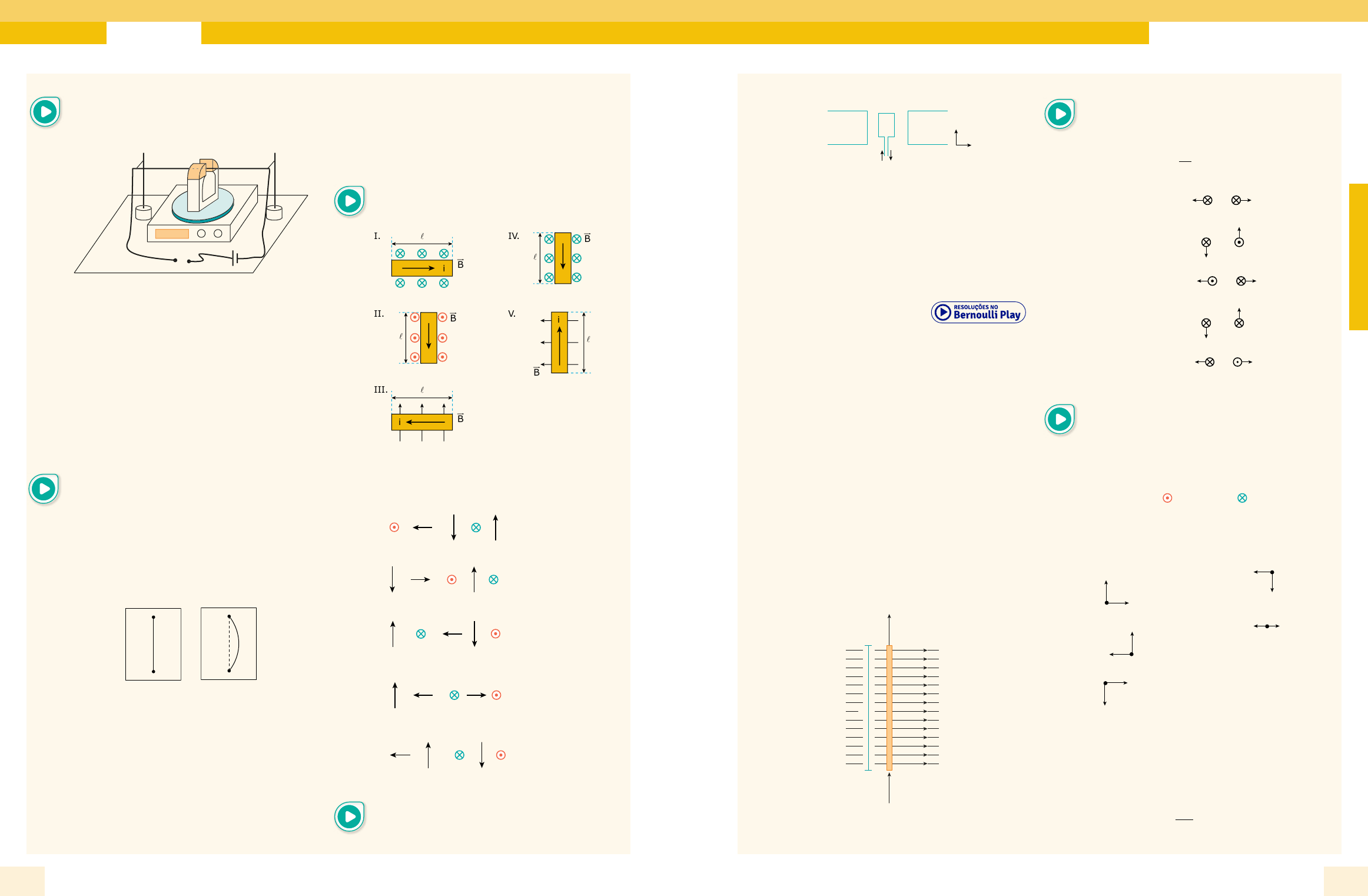 Frente C Força Magnética sobre FiosMódulo 14 FÍ SI C A 8584 Bernoulli Sistema de EnsinoColeção 6V 05. (UFRGS-RS–2016) No esquema da figura a seguir, o fio F, horizontalmente suspenso e fixo nos pontos de suporte P, passa entre os polos de um ímã, em que o campo magnético é suposto horizontal e uniforme. O ímã, por sua vez, repousa sobre uma balança B, que registra seu peso. P PF B C V –+ N S Assinale a alternativa que preenche corretamente as lacunas do enunciado a seguir, na ordem em que aparecem. Em dado instante, a chave C é fechada, e uma corrente elétrica circula pelo fio. O fio sofre uma força vertical, _______, e o registro na balança _______. A) para baixo – não se altera B) para baixo – aumenta C) para baixo – diminui D) para cima – aumenta E) para cima – diminui 06. (UFPB) Em um laboratório de Física, o professor, depois de expor aos seus alunos a teoria dos efeitos de campos magnéticos sobre fios condutores, realiza dois experimentos e pede para que os alunos, embasados na teoria exposta, expliquem os resultados. Um fio vertical, flexível e com as extremidades fixas, por onde pode, ou não, estar passando uma corrente elétrica, i, é colocado na presença de um campo magnético B. No experimento representado na figura 1, o fio não se encurva; enquanto que, no experimento representado na figura 2, o fio se encurva para a direita. B Figura 1 B Figura 2 Com base no que foi exposto, os estudantes forneceram cinco explicações. Identifique as que são compatíveis com os experimentos. I. O fio, na figura 1, não se encurva, porque não passa corrente elétrica por ele. II. O fio, na figura 1, não se encurva, porque a orientação de B é paralela à orientação da corrente. III. O fio, na figura 2, se encurva para a direita, porque a corrente, i, flui para cima e o campo B está orientado para fora do plano da página. IV. O fio, na figura 2, se encurva para a direita, porque a corrente, i, flui para baixo e o campo B está orientado para dentro do plano da página. V. O fio, na figura 2, se encurva para a direita, porque a corrente, i, flui para baixo e o campo está orientado para a direita. 07. (UPE) Um condutor retilíneo de comprimento l, percorrido por uma corrente elétrica i, é imerso em um campo magnético uniforme B. Na figura a seguir estão disponibilizadas as seguintes situações I, II, III, IV e V: i B III. i B I. i B IV. i B II. i B V. Nessas condições, o conjunto que melhor representa o sentido da força magnética que atua sobre o condutor nos itens I, II, III, IV e V, respectivamente, é: A) I II III IV V B) I II III IV V C) I II III IV V D) I II III IV V E) I II III IV V 08. (Unimontes-MG–2015) Na figura a seguir, temos um modelo muito simplificado de um motor de corrente contínua, como os motores de arranque dos automóveis. Uma espira retangular, que está sendo percorrida por uma corrente i, foi colocada numa região de campo magnético. Dessa maneira, a espira é capaz de girar em torno do eixo y. Entre as afirmativas a seguir, assinale a correta. i i bN Sd y x c A) A força magnética resultante na espira é zero, porém o torque resultante é diferente de zero. B) A força magnética nos lados b e d da espira é nula. C) O campo magnético na região da espira está no sentido negativo de x. D) A força magnética nos lados a e c da espira é diferente em módulo. EXERCÍCIOS PROPOSTOS 01. (UFAL) Numa certa região, o campo magnético gerado pela Terra possui uma componente Bx paralela à superfície terrestre, com intensidade de 2 . 10–5 T, e uma componente Bz perpendicular à superfície terrestre, com intensidade de 5 . 10–5 T. Nessa região, uma linha de transmissão paralela à componente Bx é percorrida por uma corrente elétrica de 5 000 A. A força magnética por unidade de comprimento que o campo magnético terrestre exerce sobre essa linha de transmissão possui intensidade igual a A) 0,10 N/m. B) 0,25 N/m. C) 1,0 N/m. D) 2,5 N/m. E) 10 N/m. 02. (FPS-PE–2015) Um fio condutor retilíneo tem comprimento L = 16 metros e transporta uma corrente elétrica contínua, igual a I = 0,5 A, em um local onde existe um campo magnético perpendicular e uniforme, cujo módulo vale B = 0,25 Tesla, conforme indica a figura a seguir. O módulo da força magnética exercida pelo campo magnético sobre o fio será: L B I I A) 0,2 N. B) 20 N. C) 200 N. D) 10 N. E) 2 N. 03. (UDESC) A força entre dois fios condutores paralelos, perpendiculares ao plano da página, ambos com 10,0 m de comprimento e separados por 5,0 cm, é de repulsão. A corrente elétrica em ambos é de 20,0 A. A alternativa que melhor representa a força é: Dado: µo = π −4 . 10 TA m 7 A) |F| = 8,00 . 10–4 N i F i F B) |F| = 8,00 . 10–4 N i F i F C) |F| = 16,00 . 10–3 N i F i F D) |F| = 16,00 . 10–3 N i F i F E) |F| = 16,00 . 10–5 N i F i F 04. (Mackenzie-SP) Dois fios condutores (1) e (2), muito longos e paralelos são percorridos por correntes elétricas i1 e i2, respectivamente, e sentidos opostos e situados no plano horizontal. A figura a seguir mostra a secção transversal desses condutores, em que a corrente elétrica i1 está saindo da página e a corrente elétrica i2 está entrando na página. (1) (2) i2i1 A melhor representação vetorial da força magnética (Fm) e do campo de indução magnética (B) agentes sobre o fio condutor (1) é: A) B Fm B) B Fm C) B Fm D) B Fm E) BFm 05. (EEAR-SP–2017) Dois condutores paralelos extensos são percorridos por correntes de intensidades i1 = 3 A e i2 = 7 A. Sabendo-se que a distância entre os centros dos dois condutores é de 15 cm, qual a intensidade da força magnética por unidade de comprimento entre eles, em µ.N/m? Adote: µ π0 74 10= −. .T m A A) 56 B) 42 C) 28 D) 14 https://www.youtube.com/watch?v=KUmcZc11jcM https://www.youtube.com/watch?v=KUmcZc11jcM https://www.youtube.com/watch?v=KUmcZc11jcM https://youtu.be/orV_x9U7Y7U https://www.youtube.com/watch?v=KUmcZc11jcM h