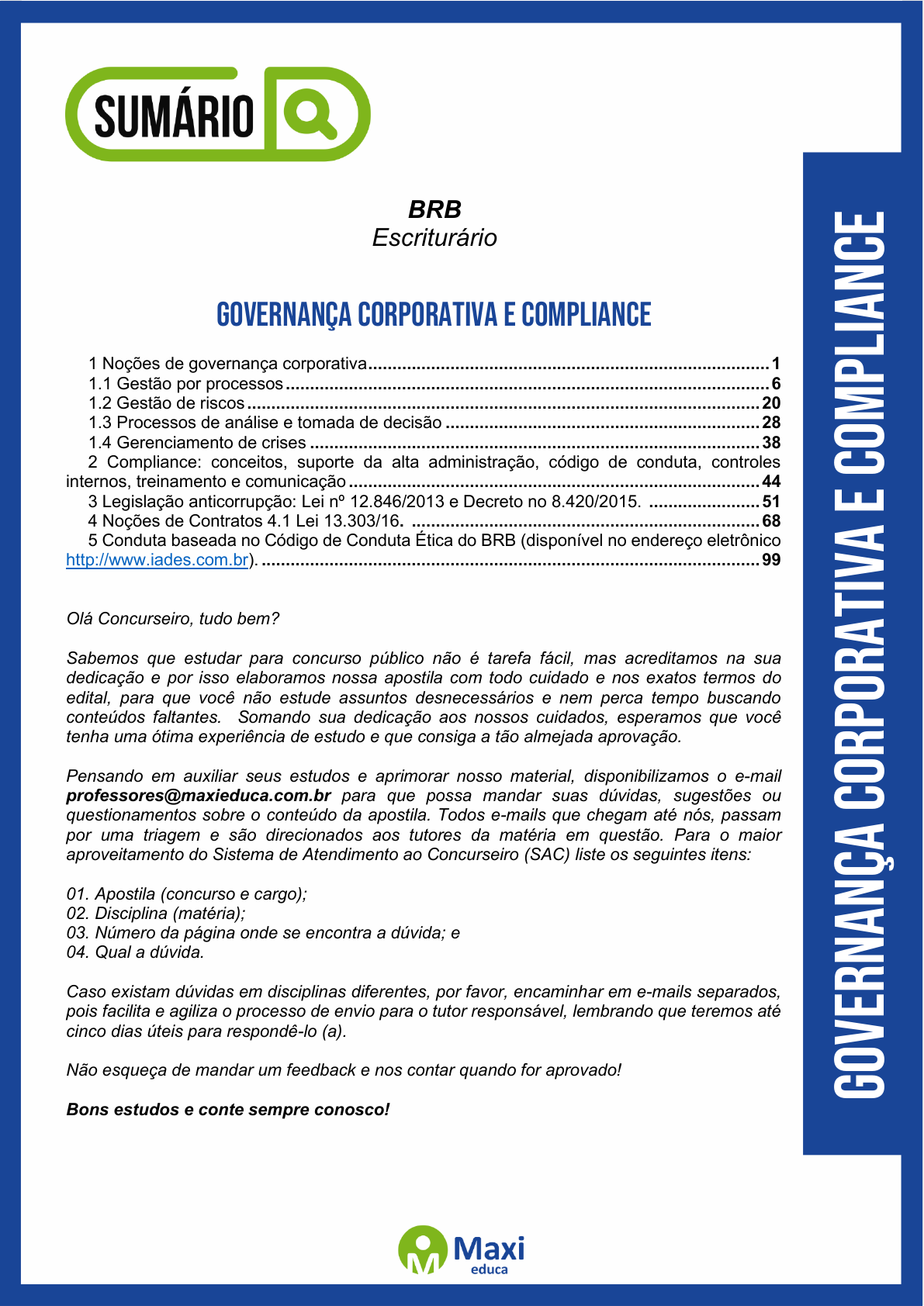 1 Go ve rn an ça C or po ra ti va e C om pl ia nc e BRB Escriturário Governança Corporativa e Compliance 1 Noções de governança corporativa ................................................................................... 1 1.1 Gestão por processos .................................................................................................... 6 1.2 Gestão de riscos .......................................................................................................... 20 1.3 Processos de análise e tomada de decisão ................................................................. 28 1.4 Gerenciamento de crises ............................................................................................. 38 2 Compliance: conceitos, suporte da alta administração, código de conduta, controles internos, treinamento e comunicação ..................................................................................... 44 3 Legislação anticorrupção: Lei nº 12.846/2013 e Decreto no 8.420/2015. ....................... 51 4 Noções de Contratos 4.1 Lei 13.303/16. ........................................................................ 68 5 Conduta baseada no Código de Conduta Ética do BRB (disponível no endereço eletrônico http://www.iades.com.br). ....................................................................................................... 99 Olá Concurseiro, tudo bem? Sabemos que estudar para concurso público não é tarefa fácil, mas acreditamos na sua dedicação e por isso elaboramos nossa apostila com todo cuidado e nos exatos termos do edital, para que você não estude assuntos desnecessários e nem perca tempo buscando conteúdos faltantes. Somando sua dedicação aos nossos cuidados, esperamos que você tenha uma ótima experiência de estudo e que consiga a tão almejada aprovação. Pensando em auxiliar seus estudos e aprimorar nosso material, disponibilizamos o e-mail professores@maxieduca.com.br para que possa mandar suas dúvidas, sugestões ou questionamentos sobre o conteúdo da apostila. Todos e-mails que chegam até nós, passam por uma triagem e são direcionados aos tutores da matéria em questão. Para o maior aproveitamento do Sistema de Atendimento ao Concurseiro (SAC) liste os seguintes itens: 01. Apostila (concurso e cargo); 02. Disciplina (matéria); 03. Número da página onde se encontra a dúvida; e 04. Qual a dúvida. Caso existam dúvidas em disciplinas diferentes, por favor, encaminhar em e-mails separados, pois facilita e agiliza o processo de envio para o tutor responsável, lembrando que teremos até cinco dias úteis para respondê-lo (a). Não esqueça de mandar um feedback e nos contar quando for aprovado! Bons estudos e conte sempre conosco! 1715895 E-book gerado especialmente para HELEN CHILOFF GONCALVES 1 Governança Corporativa é o conjunto de práticas que tem por finalidade otimizar o desempenho de uma companhia ao proteger todas as partes interessadas, tais como investidores, empregados e credores, facilitando o acesso ao capital. A análise das práticas de governança corporativa aplicada ao mercado de capitais envolve, principalmente: - Transparência; - Prestação de contas; e - Equidade de tratamento dos acionistas. Para os investidores, a análise das práticas de governança auxilia na decisão de investimento, pois a governança determina o nível e as formas de atuação que estes podem ter na companhia, possibilitando- lhes exercer influência no desempenho da mesma. O objetivo é o aumento do valor da companhia, pois boas práticas de governança corporativa repercutem na redução de seu custo de capital, o que aumenta a viabilidade do mercado de capitais como alternativa de capitalização. Quando investidores financiam companhias, eles sujeitam-se ao risco de apropriação indevida, por parte de acionistas controladores ou de administradores da companhia, de parcela do lucro do seu investimento. A adoção de boas práticas de governança corporativa constitui, também, um conjunto de mecanismos através dos quais investidores, incluindo controladores, se protegem contra desvios de ativos por indivíduos que têm poder de influenciar ou tomar decisões em nome da companhia. Companhias com um sistema de governança que proteja todos os seus investidores tendem a ser mais valorizadas, porque os investidores reconhecem que o retorno dos investimentos será usufruído igualmente por todos. A governança corporativa é uma tentativa de solucionar problemas do conflito agente x principal, a resposta é sim, uma vez que o modelo agente x principal pode ser utilizado para um número enorme de relações sociais, inclusive as tratadas no âmbito político, conforme demonstrado. A grande quantidade de publicações oficiais e artigos acadêmicos tratando de governança corporativa no setor público corrobora essa posição. Uma boa governança pública, à semelhança da corporativa, está apoiada em quatro princípios: relações éticas, conformidade, em todas as suas dimensões; transparência; e prestação de contas. A ausência desses princípios requer mudança na forma de gestão. A busca permanente da prática desses princípios na administração do país ou gestão de qualquer instituição deve ser vista como uma condição indispensável para que essa instituição possa continuar a progredir. É importante ressaltar que essa é uma tarefa permanente, que exige uma participação proativa de todos os atores envolvidos – dirigentes, políticos, órgãos de controle – e, em especial, da sociedade organizada. O uso das práticas de governança corporativa exige que todas as organizações do setor público sejam transparentes e responsáveis por suas atitudes. A transparência do Estado se efetiva, por meio do acesso do cidadão à informação governamental, que torna mais democráticas as relações entre o Estado e sociedade civil. Uma boa governança corporativa é importante para os i