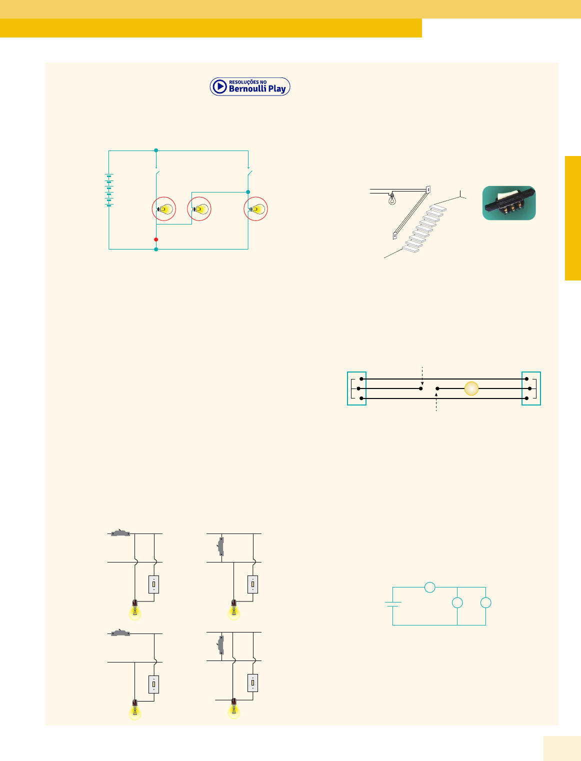 EXERCÍCIOS DE APRENDIZAGEM 01. (Unesp–2018) A figura mostra o circuito elétrico que acende a lâmpada de freio e as lanternas traseira e dianteira de um dos lados de um automóvel. bateria lâmpada de freio interruptor freio interruptor freio lanterna traseiraP lanterna dianteira Disponível em: (Adaptação). Considerando que as três lâmpadas sejam idênticas, se o circuito for interrompido no ponto P, estando o automóvel com as lanternas apagadas, quando o motorista acionar os freios, A) apenas a lanterna dianteira se acenderá. B) nenhuma das lâmpadas se acenderá. C) todas as lâmpadas se acenderão, mas com brilho menor que seu brilho normal. D) apenas a lanterna traseira se acenderá. E) todas as lâmpadas se acenderão com o brilho normal. 02. (UFRN) No mundo atual, é muito difícil viver sem a eletricidade e seus benefícios. No entanto, o seu uso adequado envolve o domínio técnico associado a conceitos e princípios físicos. Neste sentido, considere um ramo de um circuito residencial montado por estudantes em uma aula prática de eletricidade, composto pelos seguintes elementos: um disjuntor (D), uma lâmpada (L), um interruptor (I), o fio neutro e o fio fase. O circuito que está corretamente montado é o representado pela opção Fio fase Fio neutro D I L Fio fase Fio neutro D I L Fio fase Fio neutro D I L Fio fase Fio neutro D I L C)A) D)B) 9KJX ZQ1A 03. (CMMG) Uma ligação elétrica residencial chamada de three-way é usada quando se necessita acender ou apagar uma mesma lâmpada a partir de dois interruptores, como no exemplo da figura esquerda a seguir. Antes de subir a escada, a pessoa acende a lâmpada por meio de um primeiro interruptor e, quando chega ao andar de cima, apaga a lâmpada pelo outro interruptor. Fase Neutro Os interruptores three-way (figura anterior da direita) possuem três saídas de fios. O three-way P pode estar ligado nos contatos 1 ou 2; o three-way Q pode estar ligado nos contatos 3 ou 4. A figura a seguir mostra o esquema da ligação entre os dois three-ways, a lâmpada, a fase e o neutro. Fase Neutro Lâmpada1 3 2 P Q 4 A lâmpada estará acesa se os interruptores P e Q estiverem conectados, respectivamente, em A) 1 e 4 ou 2 e 4. B) 1 e 4 ou 2 e 3. C) 1 e 3 ou 2 e 3. D) 1 e 3 ou 2 e 4. 04. (CEFET-MG) O circuito elétrico seguinte é constituído por três lâmpadas L1, L2 e L3, que são idênticas, e ligadas a uma bateria ε. L3ε L1 L2 Se a lâmpada L3 repentinamente se queimar, é correto afirmar que A) L2 diminuirá o seu brilho. B) L1 dissipará mais energia. C) L2 dissipará menos energia. D) L1 terá o mesmo brilho de L2. 5IAA Resistores no Dia a Dia FÍ SI C A 87Bernoulli Sistema de Ensino 05. (UFC-CE) Três lâmpadas, L1, L2 e L3, são alimentadas por uma bateria ideal V, conforme mostra a figura. As três lâmpadas estão acesas. Quando a chave S é fechada, o resultado esperado está indicado na opção: V L1 S L2 L3 A) L1, L2 e L3 permanecem acesas. B) L1 e L2 permanecem acesas. C) L1 permanece acesa, mas L2 e L3 se apagam. D) L1 e L3 se apagam, mas L2 permanece acesa. E) As três lâmpadas se apagam. 06. (UFRN) As instalações elétricas podem ser feitas em série ou em paralelo, como mostra a figura a seguir. Série Paralelo Considere as afirmações a seguir, em relação a esses tipos de instalações. I. A ligação em série é a mais adequada para a instalação da iluminação de uma residência. II. Nos dois tipos de instalação, se uma lâmpada se queimar, o circuito elétrico ficará interrompido, e todas as lâmpadas se apagarão. III. No circuito em paralelo, se uma lâmpada se queimar, a corrente elétrica deixará de passar pela lâmpada queimada, mas as outras continuarão acesas, porque há um circuito fechado formado pelas outras lâmpadas, e a corrente continuará a circular. IV. A ligação em paralelo é a mais adequada para a instalação da iluminação de uma residência. Dessas afirmações, são corretas apenas A) III e IV. B) II e III. C) I e IV. D) I e II. 07. (EsPCEx-SP) Quatro lâmpadas ôhmicas idênticas A, B, C e D foram associadas e, em seguida, a associação é ligada a um gerador de energia elétrica ideal. Em um dado instante, a lâmpada A queima, interrompendo o circuito no trecho em que ela se encontra. As lâmpadas B, C e D permanecem acesas, porém o brilho da lâmpada B aumenta e o brilho das lâmpadas C e D diminui. UXPØ L38D Com base nesses dados, a alternativa que indica a associação formada por essas lâmpadas é: A) B D A C D) B A C D B) BA C D E) B A C D C) A B C D 08. (PUC RS–2015) O circuito alimentado com uma diferença de potencial de 12 V representado na figura a seguir mostra quatro lâmpadas associadas, cada uma com a inscrição 12 V / 15 W. 12 V 1 2 4 3 Considerando essa associação entre as lâmpadas, é correto afirmar que A) a intensidade da corrente elétrica é diferente nas lâmpadas 1 e 2. B) a diferença de potencial é diferente nas lâmpadas 1 e 2. C) a intensidade de corrente elétrica na lâmpada 2 é maior do que na 3. D) cada uma das lâmpadas 1 e 2 está sujeita à diferença de potencial de 6,0 V. E) cada uma das lâmpadas 3 e 4 está sujeita à diferença de potencial de 12 V. EXERCÍCIOS PROPOSTOS 01. (FGV) Os valores nominais de potência de duas lâmpadas, L1 e L2, em 120 V, são, respectivamente, 40 W e 60 W. A figura a seguir mostra dois circuitos, A e B, montados com essas lâmpadas. Circuito B 120v L2 L1 Circuito A L2 L1 120v VV6W Frente C Módulo 08 88 Coleção 6V