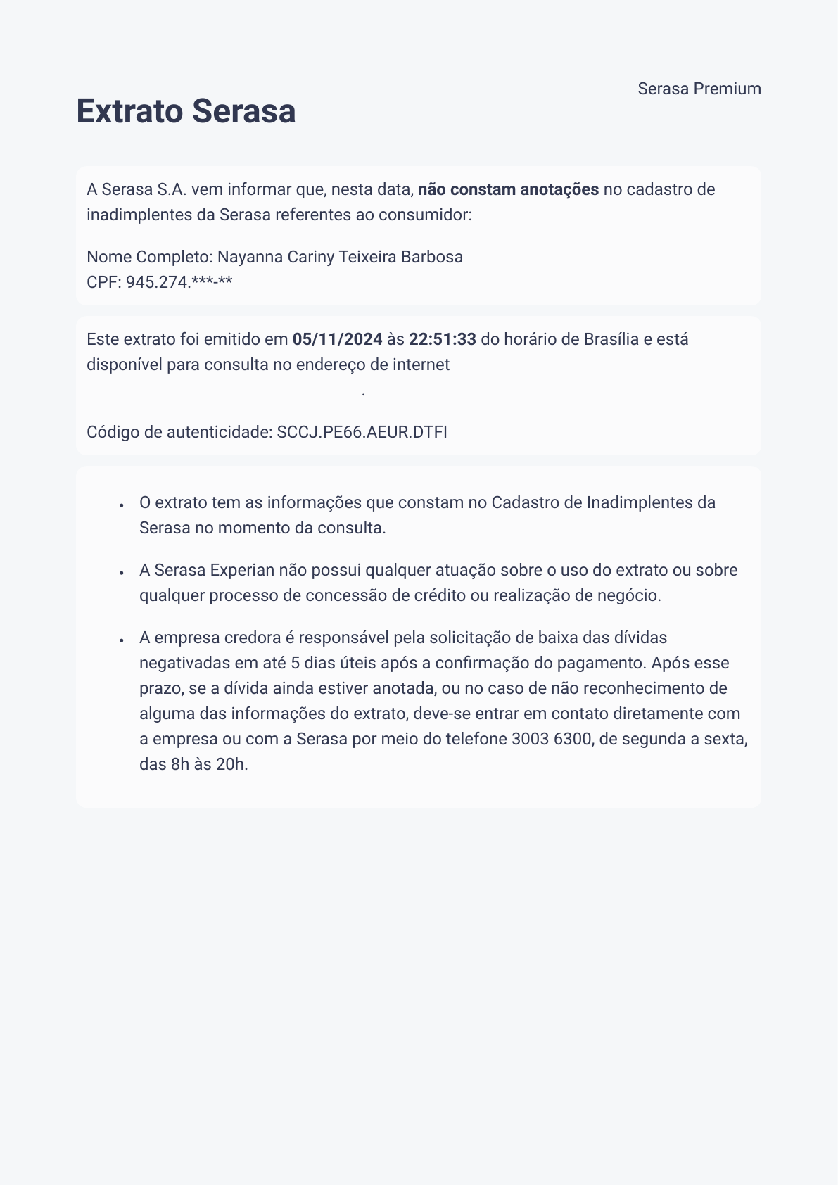 Extrato Serasa Serasa Premium A Serasa S.A. vem informar que, nesta data, não constam anotações no cadastro de inadimplentes da Serasa referentes ao consumidor: Nome Completo: Nayanna Cariny Teixeira Barbosa CPF: 945.274.***-** Este extrato foi emitido em 05/11/2024 às 22:51:33 do horário de Brasília e está disponível para consulta no endereço de internet https://www.serasa.com.br/area- cliente/meu-cpf/pendencias/extrato. Código de autenticidade: SCCJ.PE66.AEUR.DTFI • O extrato tem as informações que constam no Cadastro de Inadimplentes da Serasa no momento da consulta. • A Serasa Experian não possui qualquer atuação sobre o uso do extrato ou sobre qualquer processo de concessão de crédito ou realização de negócio. • A empresa credora é responsável pela solicitação de baixa das dívidas negativadas em até 5 dias úteis após a confirmação do pagamento. Após esse prazo, se a dívida ainda estiver anotada, ou no caso de não reconhecimento de alguma das informações do extrato, deve-se entrar em contato diretamente com a empresa ou com a Serasa por meio do telefone 3003 6300, de segunda a sexta, das 8h às 20h. Extrato Serasa
