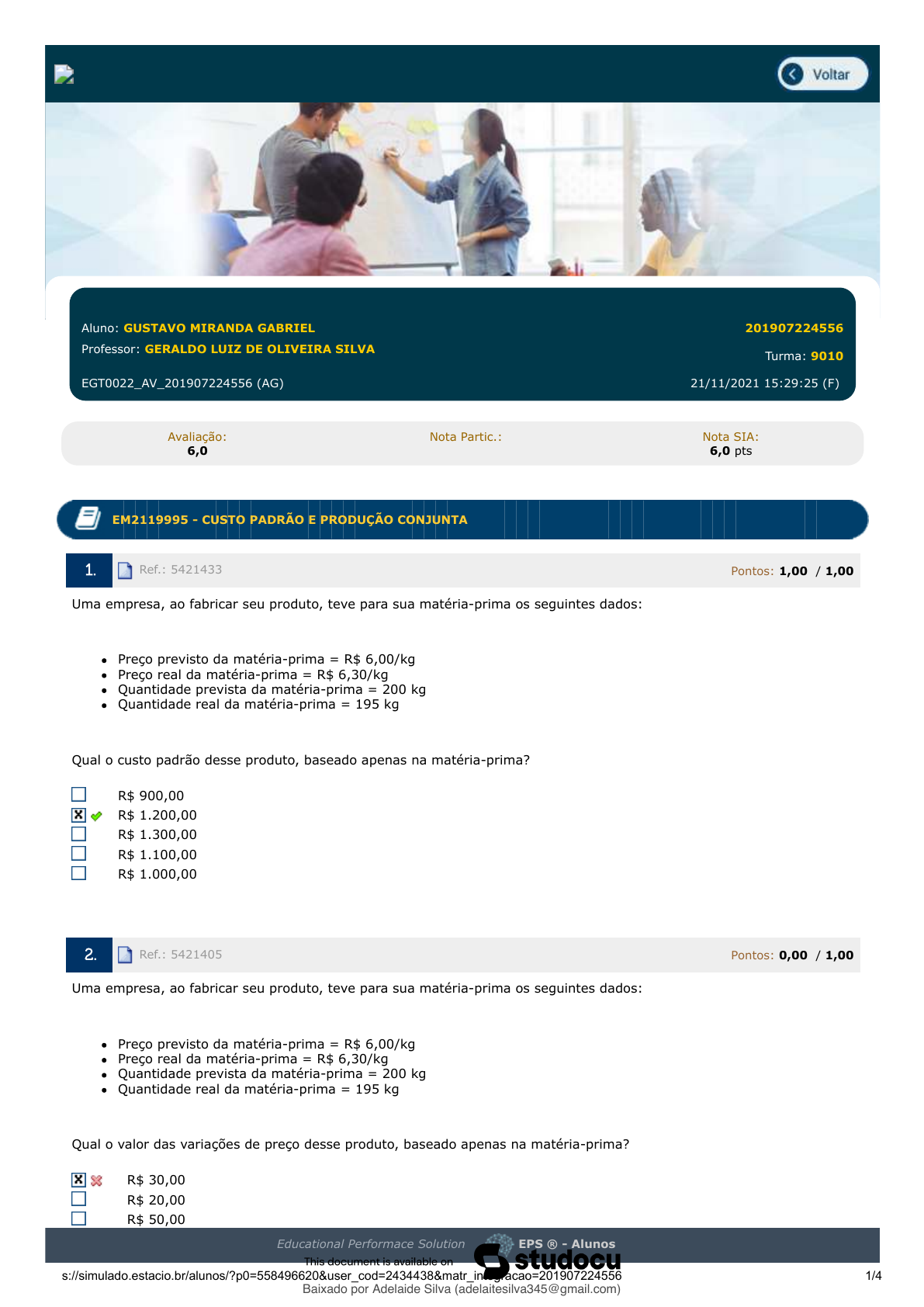 30/11/2021 20:12 EPS https://simulado.estacio.br/alunos/?p0=558496620&user_cod=2434438&matr_integracao=201907224556 1/4 GUSTAVO MIRANDA GABRIEL 201907224556 Disciplina: CONTABILIDADE E ANÁLISE DE CUSTOS AV Aluno: GUSTAVO MIRANDA GABRIEL 201907224556 Professor: GERALDO LUIZ DE OLIVEIRA SILVA Turma: 9010 EGT0022_AV_201907224556 (AG) 21/11/2021 15:29:25 (F) Avaliação: 6,0 Nota Partic.: Nota SIA: 6,0 pts EM2119995 - CUSTO PADRÃO E PRODUÇÃO CONJUNTA Ref.: 5421433 Pontos: 1,00 / 1,00 Uma empresa, ao fabricar seu produto, teve para sua matéria-prima os seguintes dados: Preço previsto da matéria-prima = R$ 6,00/kg Preço real da matéria-prima = R$ 6,30/kg Quantidade prevista da matéria-prima = 200 kg Quantidade real da matéria-prima = 195 kg Qual o custo padrão desse produto, baseado apenas na matéria-prima? R$ 900,00 R$ 1.200,00 R$ 1.300,00 R$ 1.100,00 R$ 1.000,00 Ref.: 5421405 Pontos: 0,00 / 1,00 Uma empresa, ao fabricar seu produto, teve para sua matéria-prima os seguintes dados: Preço previsto da matéria-prima = R$ 6,00/kg Preço real da matéria-prima = R$ 6,30/kg Quantidade prevista da matéria-prima = 200 kg Quantidade real da matéria-prima = 195 kg Qual o valor das variações de preço desse produto, baseado apenas na matéria-prima? R$ 30,00 R$ 20,00 R$ 50,00 R$ 40,00 Educational Performace Solution EPS ® - Alunos Baixado por Adelaide Silva (adelaitesilva345@gmail.com) lOMoARcPSD|49908550 Mobile User 30/11/2021 20:12 EPS https://simulado.estacio.br/alunos/?p0=558496620&user_cod=2434438&matr_integracao=201907224556 2/4 R$ 60,00 Ref.: 5421430 Pontos: 1,00 / 1,00 No método do custeio padrão: As variações sempre somam zero quando o custo padrão é menor que o custo real. As variações sempre somam zero quando o custo padrão é igual ao custo real. As variações sempre somam zero quando o custo padrão é maior que o custo real. As variações sempre somam zero. As variações nunca somam zero. EM2119996 - MÉTODOS DE CUSTEAMENTO Ref.: 5421388 Pontos: 1,00 / 1,00 A imagem a seguir representa um fluxograma referente a qual tipo de método de custeio? Custeio ABC Custeio por Absorção Custeio Direto Custeio Pleno RKW Ref.: 5421342 Pontos: 1,00 / 1,00 Uma empresa utiliza o método de custeio por absorção. Ela produz dois produtos: O Produto A e o produto B, tendo o produto A 400 unidades mensalmente produzidas, e o produto B 600 unidades mensalmente produzidas. O custo unitário direto do Produto A é de R$12,00 (R$6,00 de matéria-prima e R$6,00 de mão de obra direta), e o custo unitário direto do Produto B é de R$15,00 (R$10,00 de matéria-prima e R$5,00 de mão de obra direta). Os custos indiretos são de R$50.000,00. Educational Performace Solution EPS ® - Alunos Baixado por Adelaide Silva (adelaitesilva345@gmail.com) lOMoARcPSD|49908550 Mobile User 30/11/2021 20:12 EPS https://simulado.estacio.br/alunos/?p0=558496620&user_cod=2434438&matr_integracao=201907224556 3/4 A partir dos dados acima, calcule o rateio do custo indireto pelo método do Custeio por Absorção do Produto B utilizando unidades produzidas. R$40.000 R$15.000 R$25.000 R$55.000 R$30.000 EM2119997 - CUSTOS DE AQUISIÇÃO E CONTROLES DE ESTOQUES Ref.: 5421285 Pontos: 0,00 / 1,00 Uma empresa tem no estoque 500 produtos produzidos em abril ao custo de R$5,00 cada, 1.000 produzidos em maio ao custo de R$6,00 cada e 2.000 em junho a R$5,80 cada. Sabe-se que ela possui controle específico de estoque e que vendeu 200 produtos produzidos em abril e 50 produzidos em maio. Calcule o custo de mercadorias vendidas pelo método PEPS. R$1.300,00 R$1.250,00 R$1.450,00 R$1.435,00 R$750,00 Ref.: 5421335 Pontos: 0,00 / 1,00 Uma empresa incorreu nos seguintes custos: R$10.000,00 de matéria-prima, R$25.000,00 de mão de obra direta, R$13.000,00 de mão de obra indireta, R$8.000,00 de aluguel do espaço da fábrica, R$1.000,00 de aluguel de espaço da loja, R$4.000,00 de depreciação do maquinário e R$1.000,00 de energia elétrica para alimentar as máquinas de produção. Calcule o valor da despesa dela. 11.000,00 50.000,00 35.000,00 26.000,00 1.000,00 PE2110184 - CONTEXTUALIZAÇÃO DA CONTABILIDADE DE CUSTOS Ref.: 4875583 Pontos: 1,00 / 1,00 Conforme o texto de Martins (2009), até a Revolução Industrial (século XVII), praticamente só havia a Contabilidade Financeira, também conhecida como Contabilidade Geral. O consumo de bens e serviços é inerente à condição humana e ocorre desde os primórdios da civilização. Antes da Revolução Industrial, o tipo inicial de empresa que se desenvolveu foram as empresas comerciais ou de manufatura. Nesse contexto, surge a Contabilidade de Custos. Podemos afirmar que o novo ramo da contabilidade surge pelo seguinte motivo: Pelo surgimento da oportunidade de criar novos postos de trabalhos para os bacharéis em contabilidade formados na época As práticas aplicadas pela Contabilidade Financeira foram superadas e nasce uma contabilidade que substituí a contabilidade de Custos; Necessidade de gerenciar as grandes quantidades de estoques produzidos utilizando as maquinas criadas no período da Revolução Industrial; Cumprir o Planejamento elaborado pelos Órgãos Gestores do Projeto da Revolução Industrial; Por determinação do Estado, para controlar os estoques produzidos e arrecadar os impostos de forma mais transparente Educational Performace Solution EPS ® - Alunos Baixado por Adelaide Silva (adelaitesilva345@gmail.com) lOMoARcPSD|49908550 Mobile User 30/11/2021 20:12 EPS https://simulado.estacio.br/alunos/?p0=558496620&user_cod=2434438&matr_integracao=201907224556 4/4 Ref.: 4332277 Pontos: 0,00 / 1,00 As terminologias de custos são termos utilizados no dia a dia das empresas e que representam conceitos diferentes. Diante disso, verifique os gastos que uma determinada indústria apresentou no mês de fevereiro de 2021: Compra de Matéria-Prima (MP) R$50.000 Pró-labore da Administração da empresa: R$5.000 Energia elétrica da fábrica: R$2.000 Hono
