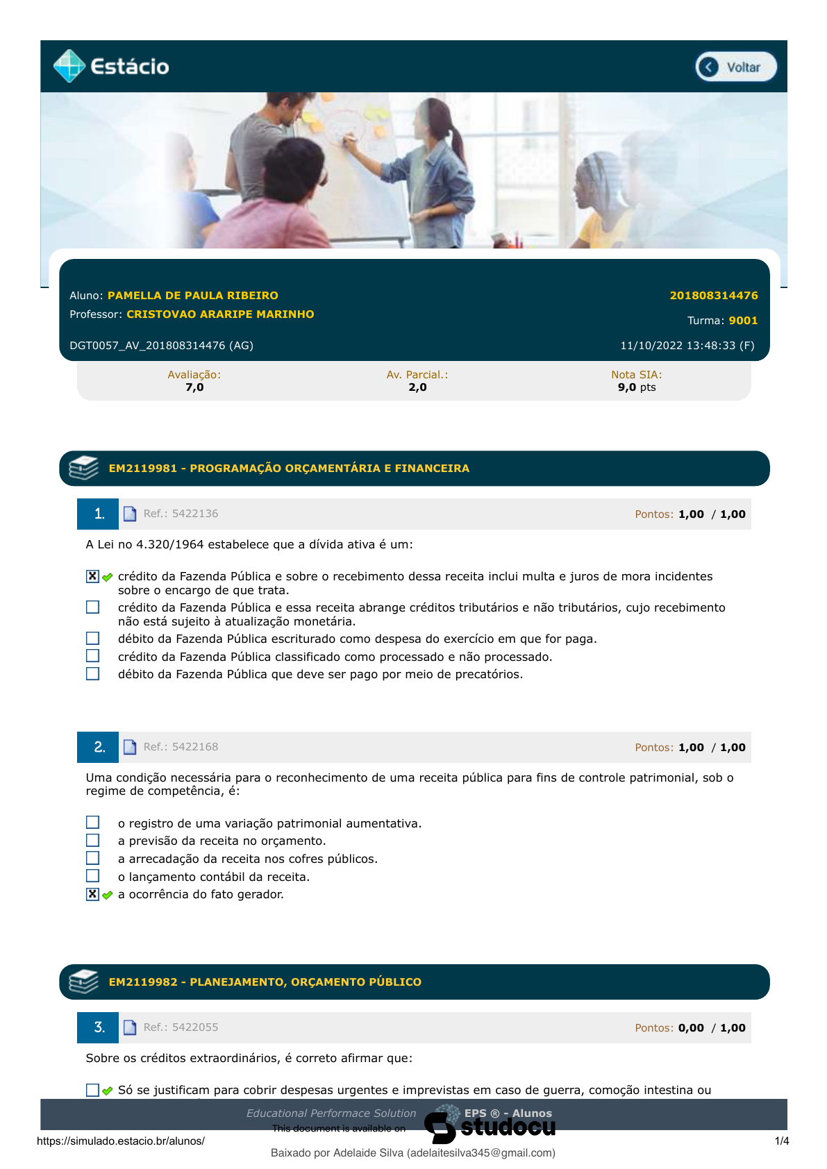29/11/2022 12:50 EPS https://simulado.estacio.br/alunos/ 1/4 PAMELLA DE PAULA RIBEIRO 201808314476 Disciplina: CONTABILIDADE E ORÇAMENTO PÚBLICO AV Aluno: PAMELLA DE PAULA RIBEIRO 201808314476 Professor: CRISTOVAO ARARIPE MARINHO Turma: 9001 DGT0057_AV_201808314476 (AG) 11/10/2022 13:48:33 (F) Avaliação: 7,0 Av. Parcial.: 2,0 Nota SIA: 9,0 pts EM2119981 - PROGRAMAÇÃO ORÇAMENTÁRIA E FINANCEIRA Ref.: 5422136 Pontos: 1,00 / 1,00 A Lei no 4.320/1964 estabelece que a dívida ativa é um: crédito da Fazenda Pública e sobre o recebimento dessa receita inclui multa e juros de mora incidentes sobre o encargo de que trata. crédito da Fazenda Pública e essa receita abrange créditos tributários e não tributários, cujo recebimento não está sujeito à atualização monetária. débito da Fazenda Pública escriturado como despesa do exercício em que for paga. crédito da Fazenda Pública classificado como processado e não processado. débito da Fazenda Pública que deve ser pago por meio de precatórios. Ref.: 5422168 Pontos: 1,00 / 1,00 Uma condição necessária para o reconhecimento de uma receita pública para fins de controle patrimonial, sob o regime de competência, é: o registro de uma variação patrimonial aumentativa. a previsão da receita no orçamento. a arrecadação da receita nos cofres públicos. o lançamento contábil da receita. a ocorrência do fato gerador. EM2119982 - PLANEJAMENTO, ORÇAMENTO PÚBLICO Ref.: 5422055 Pontos: 0,00 / 1,00 Sobre os créditos extraordinários, é correto afirmar que: Só se justificam para cobrir despesas urgentes e imprevistas em caso de guerra, comoção intestina ou calamidade pública. Dependem necessariamente da criação de receita vinculada, como o imposto residual de competência da Educational Performace Solution EPS ® - Alunos Baixado por Adelaide Silva (adelaitesilva345@gmail.com) lOMoARcPSD|49908550 Mobile User 29/11/2022 12:50 EPS https://simulado.estacio.br/alunos/ 2/4 União e o empréstimo compulsório. Tem cabimento a abertura desses créditos em qualquer situação que justifique a realização da despesa e quando não tenha havido uma dotação orçamentária específica. Podem ter vigência superior ao exercício financeiro em que foram abertos independentemente de qualquer autorização legal, vigendo enquanto durar a causa do crédito. Só podem ser abertos por lei desde que ela tenha vigência temporária. Ref.: 5422107 Pontos: 1,00 / 1,00 O Artigo 165, §8º, da Constituição Federal de 1988 estabelece que: "A lei orçamentária não conterá dispositivo estranho à previsão da receita e à fixação da despesa, não se incluindo na proibição a autorização para abertura de créditos suplementares e contratação de operações de crédito, ainda que por antecipação de receita, nos termos da lei". Assinale a opção que indica o princípio orçamentário descrito no texto acima. Princípio da equidade regional Princípio do orçamento participativo Princípio da exclusividade orçamentária Princípio da não afetação de receitas Princípio da seletividade EM2120764 - CONTABILIDADE APLICADA AO SETOR PÚBLICO Ref.: 5420092 Pontos: 0,00 / 1,00 Sobre a Lei de Responsabilidade Fiscal: Ela introduz o conceito do Balanço Patrimonial Ela proíbe a criação de novas despesas em qualquer hipótese Ela introduz o conceito das Demonstrações de Fluxos de Caixa Ela introduz o conceito da Receita Corrente Líquida Ela é irrelevante para as contas públicas Ref.: 5420071 Pontos: 1,00 / 1,00 Quais dos seguintes demonstrativos não pertence ao conjunto de divulgação obrigatória pelos entes públicos? Balanço Patrimonial Demonstração dos Fluxos de Caixa Demonstração de Valor Adicionado Balanço Orçamentário Demonstração das Variações Patrimoniais EM2120765 - PROCEDIMENTOS CONTÁBEIS E ORÇAMENTÁRIOS APLICADOS AO SETOR PÚBLICO Ref.: 5420106 Pontos: 1,00 / 1,00 Analise os fatos abaixo e assinale (VPA) quando se tratar de uma Variação Patrimonial Aumentativa e (VPD) quando se tratar de uma Variação Patrimonial Diminutiva. ( ) Redução ou extinção do valor econômico de um ativo. ( ) Surgimento de um passivo, sem correspondente ativo. Educational Performace Solution EPS ® - Alunos Baixado por Adelaide Silva (adelaitesilva345@gmail.com) lOMoARcPSD|49908550 Mobile User 29/11/2022 12:50 EPS https://simulado.estacio.br/alunos/ 3/4 ( ) Recebimento efetivo de doações e subvenções. ( ) Extinção total de um passivo sem o concomitante desaparecimento de um ativo. ( ) Extinção de um ativo, devido à transferência de sua propriedade para terceiro. Assinale a alternativa que apresenta a sequência CORRETA, de cima para baixo. VPD - VPD - VPA - VPA - VPD. VPD - VPA - VPA - VPA - VPD. VPD - VPD - VPA - VPA - VPA VPA - VPA - VPD - VPD - VPD. VPA - VPD - VPA - VPD - VPA. Ref.: 5419989 Pontos: 1,00 / 1,00 As etapas que melhor correspondem à sequência do denominado ciclo orçamentário são: Análise técnica; elaboração e revisão; aprovação; autorização; execução e avaliação. Elaboração; apreciação legislativa; execução e acompanhamento; controle e avaliação. Diagnóstico; encaminhamento e apreciação; deliberação; execução e controle; reavaliação. Preparação; análise e encaminhamento; autorização e execução; avaliação e controle. Elaboração e acompanhamento; autorização e revisão executiva; execução; controle e avaliação. EM2120766 - TÓPICOS AVANÇADOS EM CONTABILIDADE PÚBLICA E ORÇAMENTO PÚBLICO Ref.: 5421249 Pontos: 1,00 / 1,00 As operações de crédito por Antecipação de Receita Orçamentária (ARO) são regulamentadas pela Lei de Responsabilidade Fiscal (Lei Complementar nº 101/2000). Sobre o assunto, assinale a alternativa correta: A ARO se realizará somente a partir do início da sessão legislativa, ou seja, a partir de 2 (dois) de fevereiro de cada ano. A ARO será liquidada no primeiro semestre, quando for feita no último ano de mand