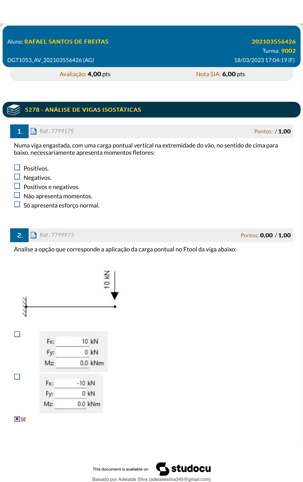 Disciplina: ANÁLISE DE ESTRUTURAS ISOSTÁTICASANÁLISE DE ESTRUTURAS ISOSTÁTICAS AVAV Aluno: RAFAEL SANTOS DE FREITASRAFAEL SANTOS DE FREITAS 202103556426202103556426 Turma: 90029002 DGT1053_AV_202103556426 (AG) 18/03/2023 17:04:19 (F) Avaliação: 4,004,00 pts Nota SIA: 6,006,00 pts 5278 - ANÁLISE DE VIGAS ISOSTÁTICAS5278 - ANÁLISE DE VIGAS ISOSTÁTICAS 1.1. Ref.: 7799175 Pontos: / 1,001,00 Numa viga engastada, com uma carga pontual vertical na extremidade do vão, no sentido de cima para baixo, necessariamente apresenta momentos fletores: Positivos. Negativos. Positivos e negativos. Não apresenta momentos. Só apresenta esforço normal. 2.2. Ref.: 7799973 Pontos: 0,000,00 / 1,001,00 Analise a opção que corresponde a aplicação da carga pontual no Ftool da viga abaixo: Baixado por Adelaide Silva (adelaitesilva345@gmail.com) lOMoARcPSD|49908550 Mobile User 5279 - ANÁLISE DE PÓRTICOS ISOSTÁTICOS PLANOS5279 - ANÁLISE DE PÓRTICOS ISOSTÁTICOS PLANOS 3.3. Ref.: 7800076 Pontos: 0,000,00 / 1,001,00 Determine o valor do momento no ponto C. -36 kNm -12 kNm +12 kNm 36 kNm 0 kNm 4.4. Ref.: 7799598 Pontos: 1,001,00 / 1,001,00 Para o pórtico abaixo, qual das opções caracteriza um Diagrama de Esforço Cortante? Baixado por Adelaide Silva (adelaitesilva345@gmail.com) lOMoARcPSD|49908550 Mobile User Baixado por Adelaide Silva (adelaitesilva345@gmail.com) lOMoARcPSD|49908550 Mobile User 5280 - LINHAS DE INFLUÊNCIA EM VIGAS ISOSTÁTICAS5280 - LINHAS DE INFLUÊNCIA EM VIGAS ISOSTÁTICAS 5.5. Ref.: 7801038 Pontos: 0,000,00 / 1,001,00 A determinação dos esforços atuantes numa estrutura são fundamentais para o dimensionamento de um determinado empreendimento. Ao determinar as envoltórias, ou seja, os valores mínimos e máximos dos Baixado por Adelaide Silva (adelaitesilva345@gmail.com) lOMoARcPSD|49908550 Mobile User esforços devido aos carregamentos que atuam em uma viga de ponte rolante, por exemplo, é estabelecida: a carga permanente. os momentos fletores máximos. a posição da carga móvel. a faixa de trabalho. a seção. 6.6. Ref.: 7801037 Pontos: 1,001,00 / 1,001,00 A determinação dos esforços atuantes numa estrutura são fundamentais para o dimensionamento de um determinado empreendimento. Ao conjunto de valores máximos e mínimo de esforços numa estrutura dá- se o nome de: Trem-tipo. Linha de influência. Envoltórias. Linhas de Estado. Diagramas de esforços.rutura. Estes valores são retirados dos Diagramas de Esforços e são consideradas as situações mais críticas da estrutura. 5281 - DEFORMAÇÕES EM ESTRUTURAS ISOSTÁTICAS5281 - DEFORMAÇÕES EM ESTRUTURAS ISOSTÁTICAS 7.7. Ref.: 7798580 Pontos: 1,001,00 / 1,001,00 A estrutura isostática tem o número exato de vínculos para ser estável, com isso sempre se ajusta a pequenas modificações de comprimento. Sendo assim quando ocorre variação de temperatura no meio ambiente, podemos afirmar: Que a estrutura isostática tem o mesmo comportamento da estrutura hiperestática. Que a estrutura sofre esforços internos devido aos deslocamentos. Que a estrutura isostática sofre resistência para acomodar uma barra. Que a estrutura isostática não sofre resistência para acomodar uma barra. Que a estrutura isostática não vai se deformar. 8.8. Ref.: 7798581 Pontos: 0,000,00 / 1,001,00 Para determinar o deslocamento horizontal do ponto C no pórtico abaixo, devido a um recalque no apoio B, é necessário determinar as reações de apoio do pórtico com uma carga unitária virtual aplicada no ponto: Baixado por Adelaide Silva (adelaitesilva345@gmail.com) lOMoARcPSD|49908550 Mobile User D C C e D B A 5286 - MODELOS DE ESTRUTURAS ISOSTÁTICAS5286 - MODELOS DE ESTRUTURAS ISOSTÁTICAS 9.9. Ref.: 7798278 Pontos: 0,000,00 / 1,001,00 O pórtico a seguir apresenta dois apoios de 2° gênero e uma rótula. Ele pode ser classificado como: Bi apoiado Tri articulado Engastado e livre Bi apoiado com articulação e tirante Tri articulado com tirante 10.10. Ref.: 7798378 Pontos: 1,001,00 / 1,001,00 O pórtico representado abaixo apresenta tipos de apoios diferentes e uma rótula. Determine o seu grau de estaticidade: Baixado por Adelaide Silva (adelaitesilva345@gmail.com) lOMoARcPSD|49908550 Mobile User 4 1 3 2 0 Observação: Eu, , estou ciente de que ainda existe(m) 1 questão(ões) não respondida(s) ou salva(s) no sistema, e que mesmo assim desejo finalizar DEFINITIVAMENTE a avaliação. Data: 18/03/2023 18:48:30 Baixado por Adelaide Silva (adelaitesilva345@gmail.com) lOMoARcPSD|49908550 Mobile User