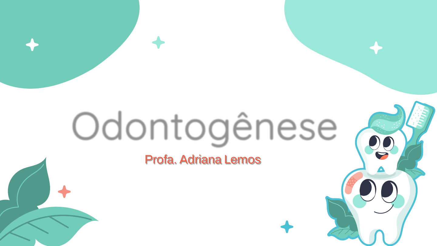 Profa. Adriana Lemos Odontogênese Dentes “Estrutura mineralizada implantada nos processos alveolares maxilar e mandibular, que realiza a mastigação e auxilia a articulação dos sons e palavras.” ● Dentes decíduos (20); ● Dentes permanentes (32). Incisivos 01 Possuem forma de lâmina: cortar o alimento. Caninos 02 Pontas agudas: rasgar e perfurar o alimento. Pré-molares 03 Duas pontas: esmagar o alimento. Molares 04 Várias pontas: moer e triturar o alimento. Dentes Numerando os dentes (FDI)... Partes do dente ● Coroa Parte superior e visível do dente. ● Polpa Camada mais interna e apresenta vasos sanguíneos e nervos. ● Raiz Garante a sustentação do dente. Partes do dente ● Esmalte Substância mais dura do corpo: cristais de hidroxiapatita de cálcio. ● Dentina Forma a maior parte do dente. É mais dura do que o osso e o cemento, porém mais macia do que o esmalte. ● Cemento Tecido duro que cobre a raiz. Iniciando a Odontogênese... ● Interação do epitélio oral primitivo com o ectomesênquima. Banda epitelial primária Diferenciação da BEP Lâmina dentária Lâmina vestibular Banda epitelial primária Lâmina dentária e vestibular Banda epitelial primária Lâmina dentária e vestibular Lâmina dentária Processo de formação dos dentes decíduos durante o período de desenvolvimento embrionário. Fase de botão; Fase de capuz; Fase de campânula; Fase de coroa; Fase de raiz. Odontogênese Interação: Células epiteliais e ectomesenquimais Interação: Células epiteliais e ectomesenquimais Fase de botão Transição: Fase de botão e campânula Intensa proliferação celular Fase de Capuz Fase de capuz Retículo estrelado Células unidas por desmossomos Secretam glicosaminoglicanas Epitélio externo do órgão do esmalte Células cúbicas Epitélio interno do órgão do esmalte Células cilíndricas Por que retículo estrelado? Retículo estrelado Células unidas por desmossomos Secretam glicosaminoglicanas Diferenciação ectomesênquima Folículo dentário Papila dentária Papila dentária Retículo estrelado Folículo dentário Epitélio externo do órgão do esmalte Epitélio interno do órgão do esmalte Lâmina dentária Epitélio oral Fase de campânula ● Início da morfo e histodiferenciação celular. Retículo estrelado Epitélio interno do esmalte Epitélio externo do esmalte Alças cervicais Fase de campânula ● Início da morfo e histodiferenciação celular. Fase de campânula Retículo estrelado Epitélio externo do esmalte Epitélio interno do esmalte Alças cervicais Estrato intermediário Células fusiformes Retículo estrelado Epitélio externo do esmalteEstrato intermediário Alças cervicais Epitélio interno do esmalte Folículo dentário Papila dentária Fase de campânula ● O epitélio interno e externo formam a alça cervical. Fase de campânula ● Aumento do volume e dos prolongamentos das células do RE; ● Células do epitélio externo se achatam (pavimentosas); ● Células do epitélio interno se alongam (cilíndricas); ● Surgimento do Estrato Intermediário. 2 1 3 4 5 6 1. Folículo dentário; 2. Retículo estrelado; 3. Epitélio interno; 4. Estrato intermediário; 5. Papila dentária; 6. Epitélio externo. A proliferação celular do epitélio e do ectomesênquima diminuem. Em que momento ocorre a morfo e histodiferenciação celular na fase de campânula? Fase de campânula ● Desintegração da lâmina dentária. Resquícios celulares formam o canal gubernacular. Células gubernaculares Dentes supranumerários Odontomas Cistos de erupção Dente supranumerário Odontoma Cisto de erupção Fase de campânula ● Com a desintegração da lâmina dentária o osso alveolar aparece (cripta óssea). Folículo dentário Papila dentária Trabécula óssea Epitélio interno Fase de campânula ● A forma das dobras do epitélio interno determina a forma da coroa. Fase de campânula ● A Dentinogênese é anterior à Amelogênese; ● Indução recíproca resulta na diferenciação de odontoblastos e ameloblastos. As células do epitélio interno se tornam cilíndricas com o núcleo voltado para o RE (inversão de polaridade); No mesmo momento, as células da papila param de se dividir e se diferenciam em Odontoblastos e secretam a primeira camada de dentina; A matriz da dentina, rica em colágeno, em contato com os pré-ameloblastos induz a diferenciação destes para ameloblastos, células que secretam matriz não colagênica. Fase de coroa ● Também conhecida como fase de campânula avançada; ● A formação da dentina é centrípeta e do esmalte é centrífuga. Fase de raiz ● A proliferação celular na alça cervical forma o Diafragma epitelial e a Bainha epitelial de Hertwig para iniciar a formação da raiz. Diafragma epitelial Fase de raiz ● A fragmentação da bainha epitelial de Hertwig forma os Restos epiteliais de Malassez. Fase de raiz ● O cemento, ligamento periodontal e o osso alveolar são formados simultaneamente.