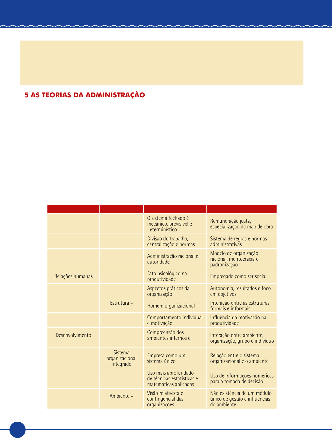 46 Unidade II Unidade II 5 AS TEORIAS DA ADMINISTRAÇÂO As teorias da administração são conceitos que envolvem estratégias de gestão recomendadas aos administradores, que podem incluir ferramentas como estruturas e diretrizes passíveis de serem implementadas em organizações modernas. Geralmente, os profissionais não dependem apenas de uma teoria de gestão sozinha, em vez disso, introduzem vários conceitos de diferentes teorias de gestão que melhor se adaptam à sua força de trabalho e à cultura da empresa. É importante destacar que os estudos e as teorias foram desenvolvidos de acordo com a evolução das organizações e da administração em cada época. O propósito de cada teoria é, acima de tudo, buscar soluções para os problemas mais importantes enfrentados na época em que foram fundamentadas. Quadro 3 – Resumo das principais teorias da administração Teoria Ênfase Principais pontos Contribuição Científica Tarefa O sistema fechado é mecânico, previsível e determinístico Remuneração justa, especialização da mão de obra Clássica Estrutura Divisão do trabalho, centralização e normas Sistema de regras e normas administrativas Burocrática Estrutura Administração racional e autoridade Modelo de organização racional, meritocracia e padronização Relações humanas Pessoas Fato psicológico na produtividade Empregado como ser social Neoclássica Estrutura Aspectos práticos da organização Autonomia, resultados e foco em objetivos Estruturalista Estrutura – ambiente Homem organizacional Interação entre as estruturas formais e informais Comportamental Pessoas Comportamento individual e motivação Influência da motivação na produtividade Desenvolvimento organizacional Pessoas Compreensão dos ambientes internos e externos Interação entre ambiente, organização, grupo e indivíduo Sistêmica Sistema organizacional integrado Empresa como um sistema único Relação entre o sistema organizacional e o ambiente Matemática Quantitativo Uso mais aprofundado de técnicas estatísticas e matemáticas aplicadas Uso de informações numéricas para a tomada de decisão Contingencial Ambiente – tecnologia Visão relativista e contingencial das organizações Não existência de um módulo único de gestão e influências do ambiente WPS_1701862784 Highlight WPS_1701862784 Highlight 47 EVOLUÇÃO DO PENSAMENTO ADMINISTRATIVO 5.1 Abordagem clássica da administração A abordagem clássica, pioneira na ciência administrativa, nasce no século XX, com os estudos pioneiros de dois engenheiros, que, embora em países separados e com propostas diferentes, convergiam para uma visão que se complementava. Essa abordagem é decorrência direta da Revolução Industrial, causada pelo crescente aumento do número de indústrias bem como pelo acirramento da concorrência. Então, as origens da abordagem clássica se devem a dois aspectos históricos: • o crescimento acelerado e desordenado das empresas; • a necessidade de aumentar a eficiência e a competência das organizações. É composta por duas teorias ou escolas, a saber: • Escola da administração científica, que ocorreu nos EUA e teve como principal personalidade Frederick Winslow Taylor, dando ênfase para as tarefas organizacionais. • Escola dos anatomistas e fisiologistas da administração, que ficou conhecida como teoria clássica da administração. Seu maior nome foi Henri Fayol. Aconteceu na França, dando ênfase para a estrutura organizacional. Essa abordagem é decorrência direta da Revolução Industrial. Essas duas correntes, embora em locais diferentes, aconteceram na mesma época (início do século XX) e tiveram muitos pontos em comum, de forma que são consideradas juntamente numa proposta que leva o nome de abordagem clássica. Abordagem clássica Administração científica Teoria clássica Ênfase na estrutura Ênfase nas tarefasTaylorTaylor FayolFayol Figura 10 – Teorias da abordagem clássica Na escola clássica da administração, duas abordagens ganham destaque: a científica e a clássica. As duas escolas surgiram em meados do século XX e seus percursores foram dois engenheiros: um americano e outro europeu. Henry Fayol, europeu, foi o percursor da teoria clássica da administração, enquanto Frederick Winslow Taylor, americano nascido na Filadélfia, foi o teórico mais importante da teoria científica. Perceberemos ao longo dos estudos que as teorias clássica e científica têm vários pontos em comum, mas há algumas questões em que os teóricos divergiam. E é justamente nessas divergências que as teorias vão ganhando novos estudos, novos conceitos e novas aplicações. WPS_1701862784 Highlight WPS_1701862784 Highlight WPS_1701862784 Highlight WPS_1701862784 Highlight WPS_1701862784 Highlight WPS_1701862784 Highlight WPS_1701862784 Highlight WPS_1701862784 Highlight 48 Unidade II Algumas dessas concordâncias são destacadas a seguir: • foram conduzidas por engenheiros diretamente ligados a indústrias; • consideravam princípios prescritivos e normativos, tais como divisão do trabalho, especialização, unidade de comando e amplitude de controle; • preocupação com a organização formal; “é o nome dado à organização oficialmente adotada pela empresa e retratada pelo organograma” (CHIAVENATO, 2003b, p. 94); • aceitação do conceito de homo economicus: é a pressuposição de que o ser humano é principalmente motivado por estímulos de ordem financeira e material; • busca da máxima eficiência. Essas duas abordagens serão vistas separadamente a seguir. 5.1.1 Abordagem científica da administração Os estudos da administração científica surgiram em 1903, nos EUA, liderados por Frederick W. Taylor. Considerada como a primeira teoria no campo da administração, o desenvolvimento dessa teoria pode ser representado pela própria trajetória de vida de seu principal autor, Taylor, que começou como operário e supervisor em 