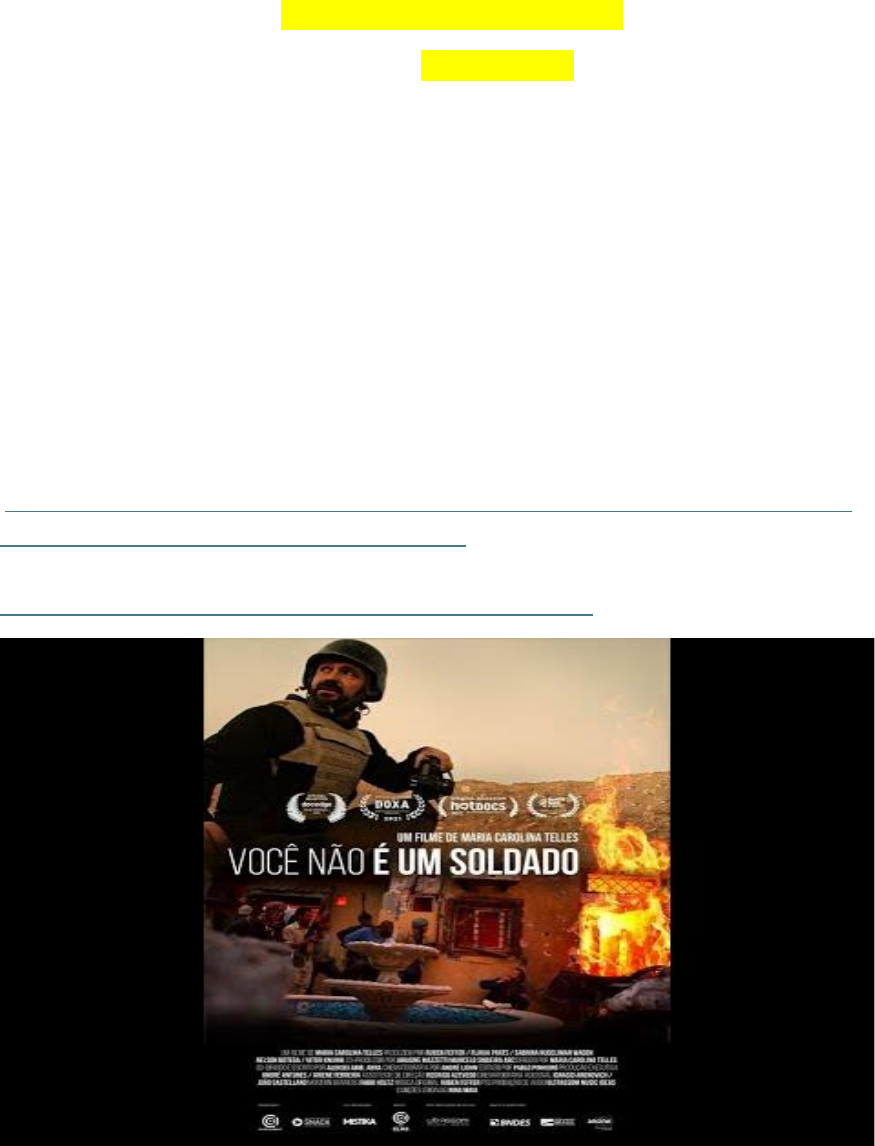 UNIP – UNIVERSIDADE PAULISTA CURSO: Design Gráfico NOME: Fernanda Antonia Diogo Pereira RA: G91HAF1 DATA: 14/08/2024 SEMESTRE: 2º TURMA: 2DP2P17 CATEGORIA: Documentário NOME: Você não é um soldado - André Liohn Fontes disponíveis: https://www.primevideo.com/-/pt/detail/Voc%C3%AA-N%C3%A3o-%C3%A9-um- Soldado/0JB2JQHDZQELPJFWC4DLQAFWG8 https://www.youtube.com/watch?v=UMnJ28ABf7A&t=3s André Liohn, um fotógrafo brasileiro conhecido por seu trabalho em zonas de conflito. Esse documentário trata-se de um relato do fotógrafo onde é narrado um trabalho que ele fez até uma guerra, para registrar momentos arriscados durante esse conflito. André Liohn, ao longo do documentário, busca oferecer uma visão mais profunda e humana das experiências daqueles que estão em meio ao caos da guerra, destacando as complexidades e as realidades frequentemente ocultas por trás dos conflitos. O título sugere uma crítica ou reflexão sobre o papel dos indivíduos envolvidos em conflitos, muitas vezes apresentando uma perspectiva mais pessoal e emocional sobre o impacto da guerra. Também mostra durante o documentário registros dele com sua família, ou realizando outras atividades, assim demostrando um ponto de vista diferente, talvez onde o nome do documentário (Você não é um soldado) queira mostrar que não é uma tarefa fácil, nem para o fotógrafo que se arriscou deixando sua família para trás para trazer registros do conflito, mas também não é fácil para os soldados que estão batalhando que provavelmente também deixaram suas famílias para trás para batalhar em prol de seus respectivos países. No meu ponto de vista, a principal mensagem do documentário é a de que a guerra é uma experiência desumanizadora que afeta todos os envolvidos de maneiras profundas e muitas vezes devastadoras. Liohn enfatiza que, apesar dos papéis militares e dos discursos oficiais, os soldados são, no fundo, pessoas comuns que enfrentam traumas e dilemas morais. Ele também destaca o sofrimento das populações civis que, muitas vezes, são as maiores vítimas dos conflitos. Por meio de suas imagens e narrativas, Liohn pretende criar empatia e compreensão em relação às experiências daqueles que vivem em zonas de guerra. Ele quer que o público veja além dos estereótipos e preconceitos, reconhecendo a humanidade compartilhada entre soldados e civis, e refletir sobre o verdadeiro custo da guerra. Esse documentário foi apresentado para nós alunos pela professora Roberta Peroni, em uma aula da matéria Fotografia. Sorocaba - SP