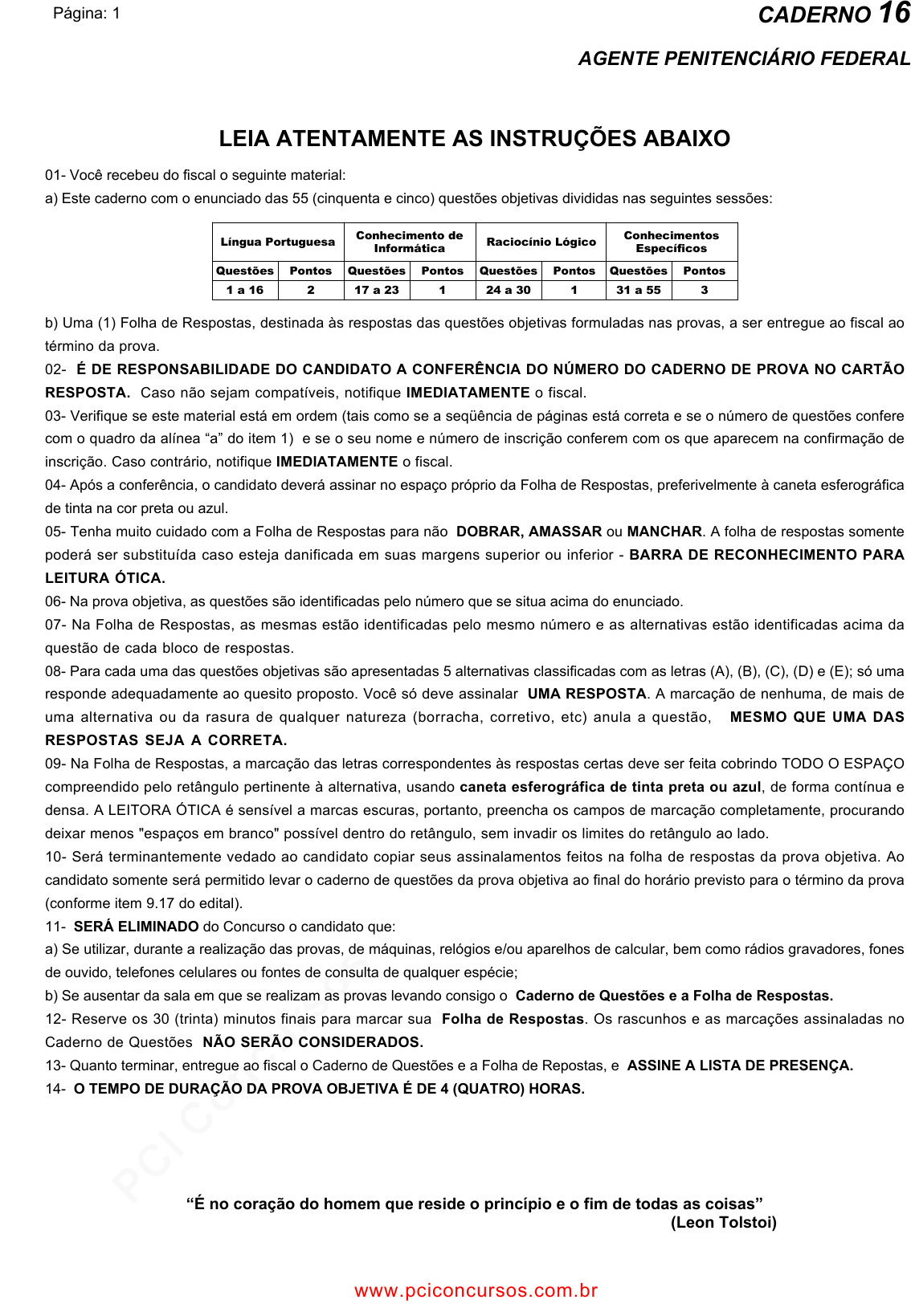 pcimarkpci MjgwNDowMDE4OjA4NjE6MjcyZDo1MGQ1OmFjNDc6MDk2ZDozODU1:V2VkLCAyNyBOb3YgMjAyNCAxOTo0MjoxMiAtMDMwMA== www.pciconcursos.com.br Página: 1 AGENTE PENITENCIÁRIO FEDERAL CADERNO 16 LEIA ATENTAMENTE AS INSTRUÇÕES ABAIXO 01- Você recebeu do fiscal o seguinte material: a) Este caderno com o enunciado das 55 (cinquenta e cinco) questões objetivas divididas nas seguintes sessões: b) Uma (1) Folha de Respostas, destinada às respostas das questões objetivas formuladas nas provas, a ser entregue ao fiscal ao término da prova. 02- É DE RESPONSABILIDADE DO CANDIDATO A CONFERÊNCIA DO NÚMERO DO CADERNO DE PROVA NO CARTÃO RESPOSTA. Caso não sejam compatíveis, notifique IMEDIATAMENTE o fiscal. 03- Verifique se este material está em ordem (tais como se a seqüência de páginas está correta e se o número de questões confere com o quadro da alínea “a” do item 1) e se o seu nome e número de inscrição conferem com os que aparecem na confirmação de inscrição. Caso contrário, notifique IMEDIATAMENTE o fiscal. 04- Após a conferência, o candidato deverá assinar no espaço próprio da Folha de Respostas, preferivelmente à caneta esferográfica de tinta na cor preta ou azul. 05- Tenha muito cuidado com a Folha de Respostas para não DOBRAR, AMASSAR ou MANCHAR. A folha de respostas somente poderá ser substituída caso esteja danificada em suas margens superior ou inferior - BARRA DE RECONHECIMENTO PARA LEITURA ÓTICA. 06- Na prova objetiva, as questões são identificadas pelo número que se situa acima do enunciado. 07- Na Folha de Respostas, as mesmas estão identificadas pelo mesmo número e as alternativas estão identificadas acima da questão de cada bloco de respostas. 08- Para cada uma das questões objetivas são apresentadas 5 alternativas classificadas com as letras (A), (B), (C), (D) e (E); só uma responde adequadamente ao quesito proposto. Você só deve assinalar UMA RESPOSTA. A marcação de nenhuma, de mais de uma alternativa ou da rasura de qualquer natureza (borracha, corretivo, etc) anula a questão, MESMO QUE UMA DAS RESPOSTAS SEJA A CORRETA. 09- Na Folha de Respostas, a marcação das letras correspondentes às respostas certas deve ser feita cobrindo TODO O ESPAÇO compreendido pelo retângulo pertinente à alternativa, usando caneta esferográfica de tinta preta ou azul, de forma contínua e densa. A LEITORA ÓTICA é sensível a marcas escuras, portanto, preencha os campos de marcação completamente, procurando deixar menos "espaços em branco" possível dentro do retângulo, sem invadir os limites do retângulo ao lado. 10- Será terminantemente vedado ao candidato copiar seus assinalamentos feitos na folha de respostas da prova objetiva. Ao candidato somente será permitido levar o caderno de questões da prova objetiva ao final do horário previsto para o término da prova (conforme item 9.17 do edital). 11- SERÁ ELIMINADO do Concurso o candidato que: a) Se utilizar, durante a realização das provas, de máquinas, relógios e/ou aparelhos de calcular, bem como rádios gravadores, fones de ouvido, telefones celulares ou fontes de consulta de qualquer espécie; b) Se ausentar da sala em que se realizam as provas levando consigo o Caderno de Questões e a Folha de Respostas. 12- Reserve os 30 (trinta) minutos finais para marcar sua Folha de Respostas. Os rascunhos e as marcações assinaladas no Caderno de Questões NÃO SERÃO CONSIDERADOS. 13- Quanto terminar, entregue ao fiscal o Caderno de Questões e a Folha de Repostas, e ASSINE A LISTA DE PRESENÇA. 14- O TEMPO DE DURAÇÃO DA PROVA OBJETIVA É DE 4 (QUATRO) HORAS. Língua Portuguesa Questões Pontos 21 a 16 Conhecimento de Informática Questões Pontos 117 a 23 Raciocínio Lógico Questões Pontos 124 a 30 Conhecimentos Específicos Pontos 331 a 55 “É no coração do homem que reside o princípio e o fim de todas as coisas” (Leon Tolstoi) Questões www.pciconcursos.com.br pcimarkpci MjgwNDowMDE4OjA4NjE6MjcyZDo1MGQ1OmFjNDc6MDk2ZDozODU1:V2VkLCAyNyBOb3YgMjAyNCAxOTo0MjoxMiAtMDMwMA== www.pciconcursos.com.br Página: 2 AGENTE PENITENCIÁRIO FEDERAL CADERNO 16 * LÍNGUA PORTUGUESA * Questão 1 Qual a única série de palavras que contém dígrafos consonantais? A) farrista – aquecido – exceto – milharal. B) através – problemas – crateras – caboclos. C) ternura – caspa – resultado – êxtase. D) tampas – ventania – sintoma – fundação. E) hálito – hélice – hino – humilde. Questão 2 “Senhoras e senhores, chamo ao palco neste momento o Professor Doutor Simão Bacamarte, ilustre Paraninfo das turmas concluintes do Ensino Médio de nosso querido Colégio”. A função textual das duas vírgulas dessa frase é separar, respectivamente, A) o sujeito e o predicativo. B) os substantivos e os adjetivos. C) o verbo e o nome. D) o acessório e o enfático. E) o vocativo e o aposto. Questão 3 Após a partida, o jogador confirmou na entrevista coletiva que ia abandonar o futebol, mas disse também que estava muito triste por se despedir de sua carreira de maneira tão melancólica. O redator dessa notícia transmitiu, com suas próprias palavras, a essência do depoimento do jogador, o que é uma técnica redacional chamada de A) discurso indireto. B) referência livre. C) ponto de vista. D) discurso direto. E) ponto de referência. Questão 4 Para esse trabalho, você precisará utilizar uma caneta, uma prancheta e um bloco de papel em que fará as anotações diárias. Todo esse material será fornecido pela empresa contratante. A informação acima usa o hiperônimo “material” para A) substituir os sinônimos “caneta”, “prancheta” e “bloco de papel”. B) evitar a ambiguidade de “caneta”, “prancheta” e “bloco de papel”. C) desfazer a polissemia de “caneta”, “prancheta” e “bloco de papel”. D) ampliar a conotatividade de “caneta”, “prancheta” e “bloco de papel”. E) englobar os hipônimos “caneta”, “prancheta