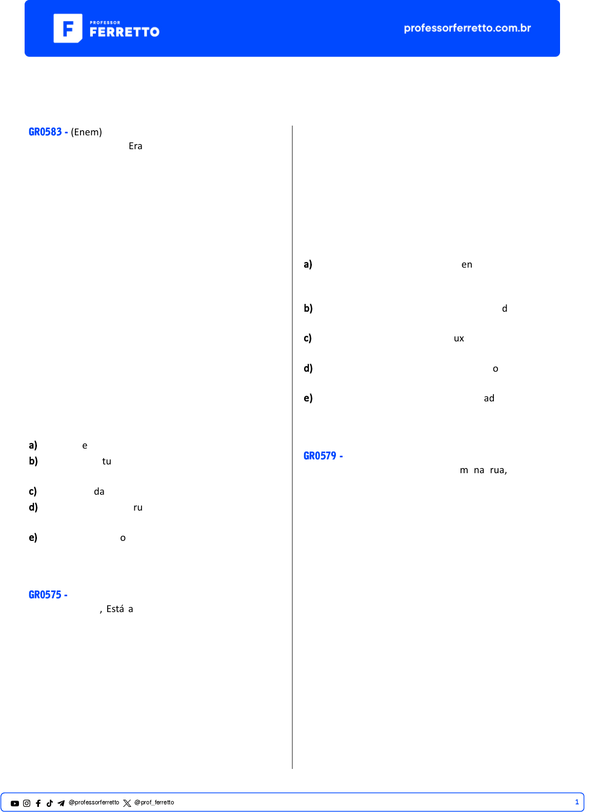 Coesão e Paralelismo GR0583 - (Enem) Era uma vez Um rei leão que não era rei. Um pato que não fazia quá-quá. Um cão que não la�a. Um peixe que não nadava. Um pássaro que não voava. Um �gre que não comia. Um gato que não miava. Um homem que não pensava... E, enfim, era uma natureza sem nada. Acabada. Depredada. Pelo homem que não pensava. Laura Araújo Cunha (CUNHA, L. A. In: KOCH, I. V.; ELIAS, V. M. Ler e escrever: estratégias de produção textual. São Paulo: Contexto, 2011.) São as relações entre os elementos e as partes do texto que promovem o desenvolvimento das ideias. No poema, a estratégia linguís�ca que contribui para esse desenvolvimento, estabelecendo a con�nuidade do texto, é a a) escolha de palavras de diferentes campos semân�cos. b) negação contundente das ações pra�cadas pelo homem. c) intertextualidade com o gênero textual fábula infan�l. d) repe�ção de estrutura sintá�ca com novas informações. e) u�lização de ponto final entre termos de uma mesma oração. GR0575 - (Enem) O homem disse, Está a chover, e depois, Quem é você, Não sou daqui, Anda à procura de comida, Sim, há quatro dias que não comemos, E como sabe que são quatro dias, É um cálculo, Está sozinha, Estou com o meu marido e uns companheiros, Quantos são, Ao todo, sete, Se estão a pensar em ficar conosco, �rem daí o sen�do, já somos muitos, Só estamos de passagem, Donde vêm, Es�vemos internados desde que a cegueira começou, Ah, sim, a quarentena, não serviu de nada, Por que diz isso, Deixaram-nos sair, Houve um incêndio e nesse momento percebemos que os soldados que nos vigiavam �nham desaparecido, E saíram, Sim, Os vossos soldados devem ter sido dos úl�mos a cegar, toda a gente está cega, Toda a gente, a cidade toda, o país SARAMAGO, J. Ensaio sobre a cegueira. São Paulo: Cia. das Letras, 1995. A cena retrata as experiências das personagens em um país a�ngido por uma epidemia. No diálogo, a violação de determinadas regras de pontuação a) revela uma incompa�bilidade entre o sistema de pontuação convencional e a produção do gênero romance. b) provoca uma leitura equivocada das frases interroga�vas e prejudica a verossimilhança. c) singulariza o es�lo do autor e auxilia na representação do ambiente caó�co. d) representa uma exceção às regras do sistema de pontuação canônica. e) colabora para a construção da iden�dade do narrador pouco escolarizado. GR0579 - (Enem PPL) As alegres meninas que passam na rua, com suas pastas escolares, às vezes com seus namorados. As alegres meninas que estão sempre rindo, comentando o besouro que entrou na classe e pousou no ves�do da professora; essas meninas; essas coisas sem importância. O uniforme as despersonaliza, mas o riso de cada uma as diferencia. Riem alto, riem musical, riem desafinado, riem sem mo�vo; riem. Hoje de manhã estavam sérias, era como se nunca mais voltassem a rir e falar coisas sem importância. Faltava uma delas. O jornal dera no�cia do crime. O corpo da menina encontrado naquelas condições, em lugar ermo. A selvageria de um tempo que não deixa mais rir. As alegres meninas, agora sérias, tornaram-se adultas de uma hora para outra; essas mulheres. ANDRADE, C. D. Essas meninas. Contos plausíveis. Rio de Janeiro: José Olympio, 1985. 1@professorferretto @prof_ferretto No texto, há recorrência do emprego do ar�go “as" e do pronome “essas". No úl�mo parágrafo, esse recurso linguís�co contribui para a) intensificar a ideia do súbito amadurecimento. b) indicar a falta de iden�dade �pica da adolescência. c) organizar a sequência temporal dos fatos narrados. d) complementar a descrição do acontecimento trágico. e) expressar a banalidade dos assuntos tratados na escola. GR0580 - (Enem) Fazer 70 anos Fazer 70 anos não é simples. A vida exige, para o conseguirmos, perdas e perdas no ín�mo do ser, como, em volta do ser, mil outras perdas. […] Ó José Carlos, irmão-em-Escorpião! Nós o conseguimos… E sorrimos de uma vitória comprada por que preço? Quem jamais o saberá? ANDRADE, C. D. Amar se aprende amando. São Paulo: Círculo do Livro, 1992 (fragmento). O pronome oblíquo “o”, nos versos “A vida exige, para o conseguirmos” e “Nós o conseguimos”, garante a progressão temá�ca e o encadeamento textual, recuperando o segmento a) “Ó José Carlos”. b) “perdas e perdas”. c) “A vida exige”. d) “Fazer 70 anos”. e) “irmão-em-Escorpião”. GR0581 - (Enem) Apesar de Não lembro quem disse que a gente gosta de uma pessoa não por causa de, mas apesar de. Gostar daquilo que é gostável é fácil: gen�leza, bom humor, inteligência, simpa�a, tudo isso a gente tem em estoque na hora em que conhece uma pessoa e resolve conquistá-la. Os defeitos ficam guardadinhos nos primeiros dias e só então, com a convivência, vão saindo do esconderijo e revelando-se no dia a dia. Você então descobre que ele não é apenas gen�l e doce, mas também um tremendo casca-grossa quando trata os próprios funcionários. E ela não é apenas segura e determinada, mas uma chorona que passa 20 dias por mês com TPM. E que ele ronca, e que ela diz palavrão demais, e que ele é supers�cioso por bobagens, e que ela enjoa na estrada, e que ele não gosta de criança, e que ela não gosta de cachorro, e agora? Agora, convoquem o amor para resolver essa encrenca. (MEDEIROS, M. Revista O Globo, n. 790, 12 jun. 2011 (Adaptado).) Há elementos de coesão textual que retomam informações no texto e outros que as antecipam. Nos trechos, o elemento de coesão sublinhado que antecipa uma informação do texto é a) “Gostar daquilo que é gostável é fácil [...]”. b) “[...] tudo isso a gente tem em estoque [...]”. c) “[...] na hora em que conhece uma pessoa [...]”. d) “[...] resolve conquistá-la”. e) “[...] para resolver essa encrenca”. GR0574 - (Enem) Um asteroide 