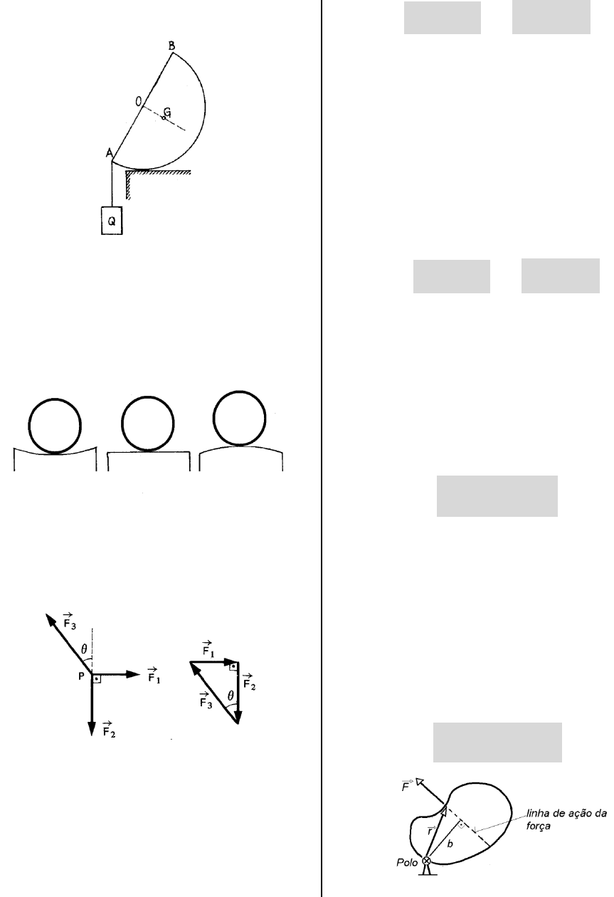 Equilíbrio de Sólidos 1. Estabilidade O equilíbrio de corpos rígidos pode ser classificado em equilíbrio estável, instável ou indiferente. Para nós interessa-nos o equilíbrio estável para o qual cessada a perturbação, o sistema volte para o ponto de equilíbrio inicial. Um corpo rígido está em equilíbrio estável, quando a resultante de forças aplicadas ao corpo é nula, assim como a soma dos torques destas forças, em relação a um polo, também é nula. Estável Indiferente Instável 2. Equilíbrio de um ponto material Sejam as forças F1 , F2 e F3 , aplicadas a um ponto material. Para um corpo esteja em equilíbrio estável de translação é necessário e suficiente que a resultante de forças aplicadas ao corpo seja nula. 0321 FFF 0iF Se cada componente de força for discriminado por suas coordenadas como, jFiFF yxi ˆˆ que de dentro do sinal da somatória , 0ˆˆ jFiF yx subtende as condições de equilíbrio dadas por 0xF e 0yF 3. Equilíbrio de um corpo extenso a) Equilíbrio de Translação Para o um corpo extenso tenha equilíbrio de translação é necessário que a resultante de forças aplicadas no centro de massa do corpo extenso seja nula. E conforme a 2ª lei de Newton a aceleração é zero, 0amF Ou seja, se cada força aplicada é decomposta nas duas projeções de coordenadas Fx e Fy, temos as condições de equilíbrios que garantem o equilíbrio de translação dados por, 0xF e 0yF , b) Equilíbrio de Rotação Como um corpo extenso apresenta uma distribuição de massa ao longo de seu formato, é necessitamos levar em conta também o equilíbrio de rotação. Conforme a lei de rotação, a aceleração angular é zero. Portanto para que o corpo extenso tenha um equilíbrio de rotação é necessário e suficiente que a soma vetorial dos torques de cada força aplicada seja nula, ou seja, 0 IMPolo 0PoloM onde I é o Momento de Inércia, que será visto no semestre que vem, indicando a forma como a massa do corpo é distribuído. Assim como a aplicação de uma força é independente da aplicação da outra, o torque que cada força aplicada na rotação do corpo extenso é também independente do torque da outra força, e seus efeitos são adicionados vetorialmente. 4. Torque de uma força O torque de uma força Mpolo é o resultado de um produto vetorial entre o vetor posição r no ponto de aplicação e a força aplicada F em relação a um polo ou centro de rotação, dado por, FrM polo O módulo do torque Mpolo = r.F.sen, o fator b = r sen é chamado de braço de alavanca, escrito como bFM polo . Com relação ao sinal, o torque pode ser positivo, quando a força rotaciona o corpo extenso no sentido anti- horário, como na trigonometria, e negativo, quando a força rotaciona o corpo extenso no sentido horário. 0poloM ou 0poloM Exemplo 1 As forças F1 = 40N, F2 = 50N estão aplicadas em um retânculo ABCD, de lados 20 cm por 30 cm, com uma força resultante FR desloca o retângulo na direção de translação. jiFR ˆ50ˆ40 Tomando o polo no ponto A como eixo de de rotação a soma dos torques das duas forças, é igual a, M1 = 1200,00 Ncm e M2 = 1000,00 Ncm resulta numa somatória MA= M1 +M2 = 2200 Ncm. No ponto B, os torques destas forças ficam, M1 = +1200,00 Ncm e M2 = 0, e a somatória igual a MB= M1 +M2 = 1200 Ncm Analogamente repetindo o cálculo dos torques para os pontos C e D, temos que, MC = 0 MD = 1000 Ncm Podemos concluir que o torque total é diferente em cada ponto considerado. Portanto, para que o corpo extenso tenha equilíbrio de rotação é necessário que a somatória de todos os torques aplicados ao corpo seja nula. Isto é 0PoloM Isto é possível pela fixação do sistema a partir de vínculos ou apoios. 5 .Vínculos Vínculos são apoios mecânicos que impedem que o corpo extenso tenha movimento de translação e de rotação. Os vínculos podem ser classificados de três tipos básicos. a) Articulação fixa A barra dom uma articulação livre na extremidade A é impedida de ter movimento na direção horizontal e na direção vertical ou normal. b) Articulação Móvel A barra apresenta uma articulação livre na extremidade A e retém o movimento da barra na direção somente na direção vertical ou normal, deixando o movimento livre na horizontal. c) Engastamento A barra é totalmente rígida na extremidade A com também retém o seu movimento tanto na direção horizontal e vertical, como também retém através de um torque M. Exemplo 1 Determinar as reações de apoio, VA, HA e VB para que a placa permaneça em equilíbrio a partir de dois vínculos nos pontos A e C, e sabendo-se que as cargas aplicadas são de F1 = 40N, F2 = 50N A somatória das projeções na direção de x, Fx= HAF2=0 HA = 50N. E a somatória das projeções na direção de y, Fy=VAVC+F1=0 VCVA=40N. Por final usando a somatória dos momentos em torno no polo A MA= 50x20+40x30VCx30=0 obtemos os valores das intensidades VC = 73,33 N e VA = 33,33 N. Portanto qualquer que seja o polo escolhido, B, C, D ou E, a somatório dos momentos em relação a estes pontos é zero. Exemplo2 Duas peças são equilibradas, por um ponto de apoio, de uma gangorra AB de comprimento de 546 mm e massa m = 50,2 gramas. Na extremidade A é colocado um disco de cobre de massa m1 = 235,7 gramas que apresenta seu braço b1 = 127,9 mm distante do ponto de apoio. Na outra extremidade B se encontra em equilíbrio um disco de plástico de massa m2 = 65 gramas, cujo braço mede b2 = 378 mm também do ponto de apoio. O ponto de equilíbrio da gangorra dista 153 mm da extremidade A. Verificar se a somatório dos torques do disco, do cilindro e do peso da barra é próxima de zero. Solução Os pesos do disco de cobre e do cilindro de plástico são iguais a Q1 = 2,310 N e Q2 = 0,637 N, e a barra de madeira tem peso igual a P = 0,492 N. O disco de cobre tem torque M1 = - 0,295449 Nm, Entretanto o pino e a barra giram a barra no sentido horário e apresentam torques iguais a M2 