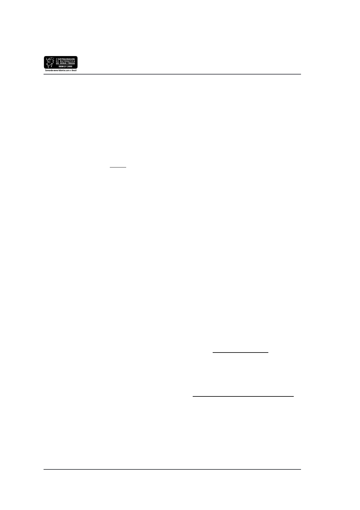 Nı́vel 2 Lista 6 Lista 6 1. Brincando com dados - Dois dados são lançados. Qual é o percentual do produto dos números obtidos nos 2 dados ser diviśıvel por 6? 2. Contando soluções - Quantos são os pares de números inteiros positivos (x, y) tais que xy x+ y = 144? 3. Cı́rculos tangentes - Os vértices de um triângulo de lados 3 cm, 4 cm e 5 cm são centros de três ćırculos dois a dois tangentes . Qual é a soma das áreas destes três ćırculos? 4. Grupo de amigos - João, Jorge, José e Jan são bons amigos. João não tem dinheiro, mas seus amigos têm. Jorge deu a João um quinto de seu dinheiro, José deu um quarto de seu dinheiro e Jan deu um terço de seu dinheiro. Se todos eles deram para João a mesma quantidade de dinheiro, que fração do dinheiro do grupo ficou com João? 5. Um trapézio isósceles - Na figura, o trapézio ABCD é isósceles, AB é pa- ralelo a CD e as diagonais AC e BD cortam-se no ponto P . Se as áreas dos triângulos 4ABP e 4PCD são 4 cm2 e 9 cm2, respectivamente, qual é a área do triângulo 4PBC? T T T T T T T T¢ ¢ ¢ ¢ ¢ ¢ ¢ ¢ HHHHHHHHHHHHHHH """"""""""""" D C A B P 18 OBMEP 2008 Nível 2 Nível 2 1. População – Em 1998, a população do Canadá era de 30,3 milhões. Qual das opções abaixo representa a população do Canadá em 1998? (a) 30 300 000 (b) 303 000 000 (c) 30 300 (d) 303 300 (e) 30 300 000000 2. Réguas em 15 minutos – Uma certa máquina é capaz de produzir oito réguas por minuto. Quantas réguas essa máquina consegue produzir em 15 minutos? (a) 104 (b) 110 (c) 112 (d) 128 (e) 120 3. Alturas iguais – Luíza, Maria, Antônio e Júlio são irmãos. Dois deles têm a mesma altura. Sabe-se que • Luíza é maior que Antônio; • Maria é menor que Luíza; • Antônio é maior do que Júlio; • Júlio é menor do que Maria. Quais deles têm a mesma altura? (a) Maria e Júlio (c) Antônio e Luíza (e) Antônio e Maria (b) Júlio e Luíza (d) Antônio e Júlio 4. Unidade – O algarismo da unidade do número 1× 3× 5× 79× 97× 113 é (a) 1 (b) 3 (c) 5 (d) 7 (e) 9 5. Em que o? – A, B, C, D, E, F, G e H são os os de apoio que uma aranha usa para construir sua teia, conforme mostra a gura. A aranha continua seu trabalho. Sobre qual o de apoio estará o número 118? (a) B (b) D (c) E (d) G (e) H Para resolver as duas próximas questões, utilize as informações da tabela dada, que mostra o desempenho das seleções do grupo A da Copa do Mundo de 2002. Nessas partidas de futebol, a equipe vencedora ganha três pontos e a perdedora não ganha nem perde pontos; em caso de empate, as duas ganham um ponto. Seleção J V E D GP GC P Dinamarca 3 2 1 0 5 2 7 Senegal 3 1 2 0 5 4 ? Uruguai 3 0 2 1 4 ? 2 França 3 0 1 2 0 3 1 OBMEP 2010 35
