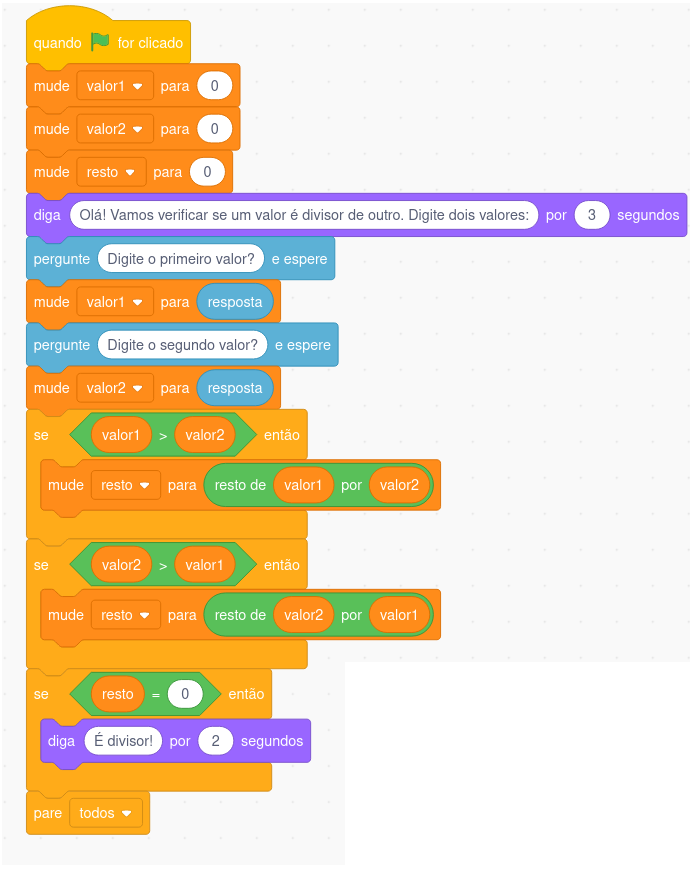 quando for clicado mude valor1 para 0 mude valor2 para 0 mude resto para 0 diga Olá! Vamos verificar se um valor é divisor de outro. Digite dois valores: por 3 segundos pergunte Digite primeiro valor? e espere mude valor1 para resposta pergunte Digite segundo valor? e espere mude valor2 para resposta se valor1 valor2 então mude resto para resto de valor1 por valor2 se valor2 valor 1 então mude resto para resto de valor2 por valor1 se resto 0 então diga É divisor! por 2 segundos pare todos