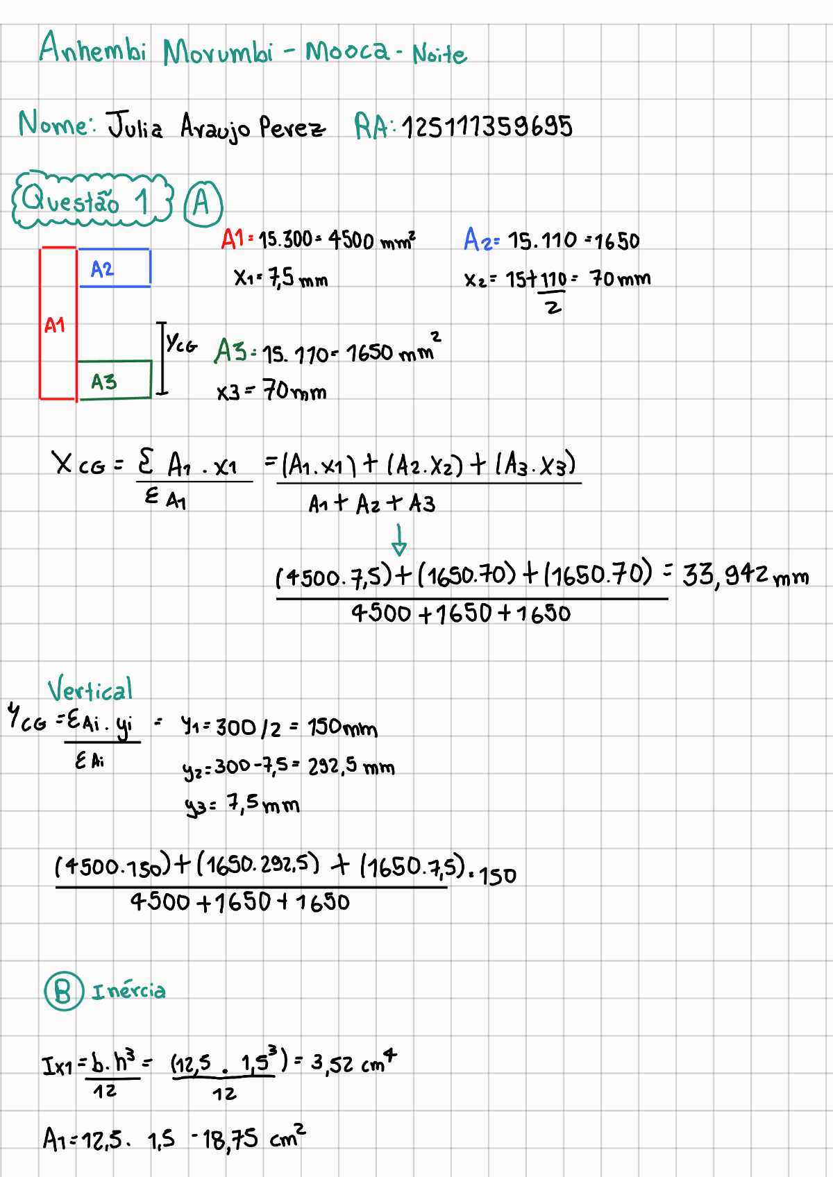 Anhembi - Mooca. - Noite Nome: Julia Pevez RA: 125111359695 1 A mm2 A2= 15.110=1650 A2 X1=7,5mm X2= 70mm 2 A1 A3 I YCG 2 70mm X CG = = + (A2.X2) + (A3.X3) EAT + + A3 (4500.7,5)+(1650.70) + (1650.70) = 33,942mm Vertical =EAi. yi = EA; mm (4500.150) + (1650.292,5) + (1650.7,5) 150 4500 +1650+ 1650 B Inercia Ix1 = b.h3= = 3,52 cm4 12 12 -18,75 cm22 Ix1= 352 cm4 dy=0 Ix2 = IX2= b.h3 = = 2460,38 cm4 12 12 = (0) 2460,38 = 2460,38cm4 Ix3'=b.h3 = 12 12 A3= = 3810,94 Ix 4 Ix = 3810,94+ cmQuestao 2 JAB=10mm FBC = : = 8mm 4 3 FAB 0,8 FBC = 1,6 FBC Diagrama de corpo livre 0,5 FABC FBcy + FAB FBCX & Fx =0 FABX = FAB. 4 FBC 5 784,8N Faby = 784, 8N Fab. sen 60° 3 FBC 5 1,6 FBC. 0,866 + 0,6 FBC = 784,8 1,9856 FBC= N 1,9856 FAB = FBC FAB = 632,4N Tensao = Forga AB = FAB 632,3N 8,05 MP2 AAB Tensao BC= FBC = 395,2 7,86 MPa ABC
