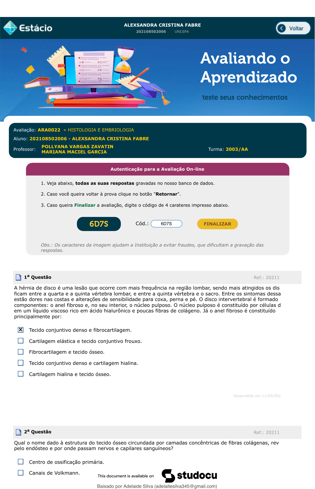 ALEXSANDRA CRISTINA FABRE 202108502006 UNIJIPA Avaliação: ARA0022 » HISTOLOGIA E EMBRIOLOGIA Aluno: 202108502006 - ALEXSANDRA CRISTINA FABRE Professor: POLLYANA VARGAS ZAVATIN MARIANA MACIEL GARCIA Turma: 3003/AA Autenticação para a Avaliação On-line 1. Veja abaixo, todas as suas respostas gravadas no nosso banco de dados. 2. Caso você queira voltar à prova clique no botão "Retornar". 3. Caso queira Finalizar a avaliação, digite o código de 4 carateres impresso abaixo. Cód.: 6D7S FINALIZAR Obs.: Os caracteres da imagem ajudam a Instituição a evitar fraudes, que dificultam a gravação das respostas. 1a Questão Ref.: 202113972409 A hérnia de disco é uma lesão que ocorre com mais frequência na região lombar, sendo mais atingidos os discos que ficam entre a quarta e a quinta vértebra lombar, e entre a quinta vértebra e o sacro. Entre os sintomas dessa doença estão dores nas costas e alterações de sensibilidade para coxa, perna e pé. O disco intervertebral é formado por dois componentes: o anel fibroso e, no seu interior, o núcleo pulposo. O núcleo pulposo é constituído por células dispersas em um líquido viscoso rico em ácido hialurônico e poucas fibras de colágeno. Já o anel fibroso é constituído principalmente por: Tecido conjuntivo denso e fibrocartilagem. Cartilagem elástica e tecido conjuntivo frouxo. Fibrocartilagem e tecido ósseo. Tecido conjuntivo denso e cartilagem hialina. Cartilagem hialina e tecido ósseo. Respondido em 11/05/2022 13:42:43 2a Questão Ref.: 202113972445 Qual o nome dado à estrutura do tecido ósseo circundada por camadas concêntricas de fibras colágenas, revestida pelo endósteo e por onde passam nervos e capilares sanguíneos? Centro de ossificação primária. Canais de Volkmann. Baixado por Adelaide Silva (adelaitesilva345@gmail.com) lOMoARcPSD|49908550 Mobile User Osteoide. Canais de Havers. Canalículos. Respondido em 11/05/2022 13:44:41 3a Questão Ref.: 202113972351 ''O tecido cartilaginoso é uma forma especializada de tecido conjuntivo de consistência rígida. Desempenha a função de suporte de tecidos moles, reveste superfícies articulares, absorvendo choques, e facilita o deslizamento dos ossos na articulação. A cartilagem é essencial para a formação e o crescimento do osso longo, na vida intrauterina e depois do nascimento.¿ (adaptado de Histologia Interativa, Universidade Federal de Alfenas. Disponível em:. Acesso em 22/04/2021. Sobre o crescimento e processo de reparo da cartilagem, analise as afirmativas a seguir: I. Uma vez danificada, a capacidade de cicatrização da cartilagem é quase nula, mesmo em casos de lesões leves. II. A expressão do fator de crescimento SOX-9 induz a diferenciação das células mesenquimais em condroblastos. III. O reparo da cartilagem, quando ocorre, se dá principalmente pela produção e deposição de tecido conjuntivo frouxo. IV. O crescimento intersticial denomina o processo de formação da nova cartilagem dentro de uma massa de cartilagem existente. É correto o que se afirma em: I, II e IV. II e III. I e II. II, III e IV. I, II e III. Respondido em 11/05/2022 14:01:43 4a Questão Ref.: 202113972448 A principal característica do tecido ósseo secundário é a existência de fibras colágenas organizadas em lamelas concêntricas, estrutura denominada ___________. No centro dessa estrutura, existe o ___________, que contém nervos e vasos sanguíneos. A comunicação desses complexos entre si, com a cavidade medular e a superfície externa se dá por ___________. Qual das alternativas abaixo contém os termos que preenchem adequadamente e de maneira sequencial a sentença acima? Sistemas de Harvers - ósteon - canais de Volkmann. Ósteons - canal de Harvers - canais de Volkmann. Sistema de Volkmann - canal de Volkmann - ósteons. Ósteons - canal de Volkmann - canais de Harvers. Centro de ossificação - ósteon - canais de Harvers. Respondido em 11/05/2022 13:56:39 Baixado por Adelaide Silva (adelaitesilva345@gmail.com) lOMoARcPSD|49908550 Mobile User 5a Questão Ref.: 202113972451 O tecido muscular representa um dos quatro tipos de tecido do corpo e é responsável pelo movimento do corpo como um todo e pelas mudanças no tamanho e formato dos órgãos internos. A seguir, são listadas algumas características da contração muscular. Assinale a alternativa que apresenta uma característica correta do processo de contração muscular. Durante a contração do músculo estriado, as miofibrilas se encurtam e causam o encurtamento de todo o sarcômero. No músculo liso, com o estímulo do sistema nervoso autônomo, os íons de cálcio migram do retículo sarcoplasmático para o sarcoplasma. A contração tem fim quando a membrana do retículo transfere os íons de cálcio para o interior das suas cisternas, em um processo passivo. O sistema de túbulos transversais garante que a contração muscular se dê de maneira uniforme por todo o músculo. Quando a fibra do nervo motor recebe um impulso nervoso, seu terminal axônico libera norepinefrina que se associa a receptores do sarcolema. Respondido em 11/05/2022 13:49:10 Período de não visualização da prova: desde até . Baixado por Adelaide Silva (adelaitesilva345@gmail.com) lOMoARcPSD|49908550 Mobile User