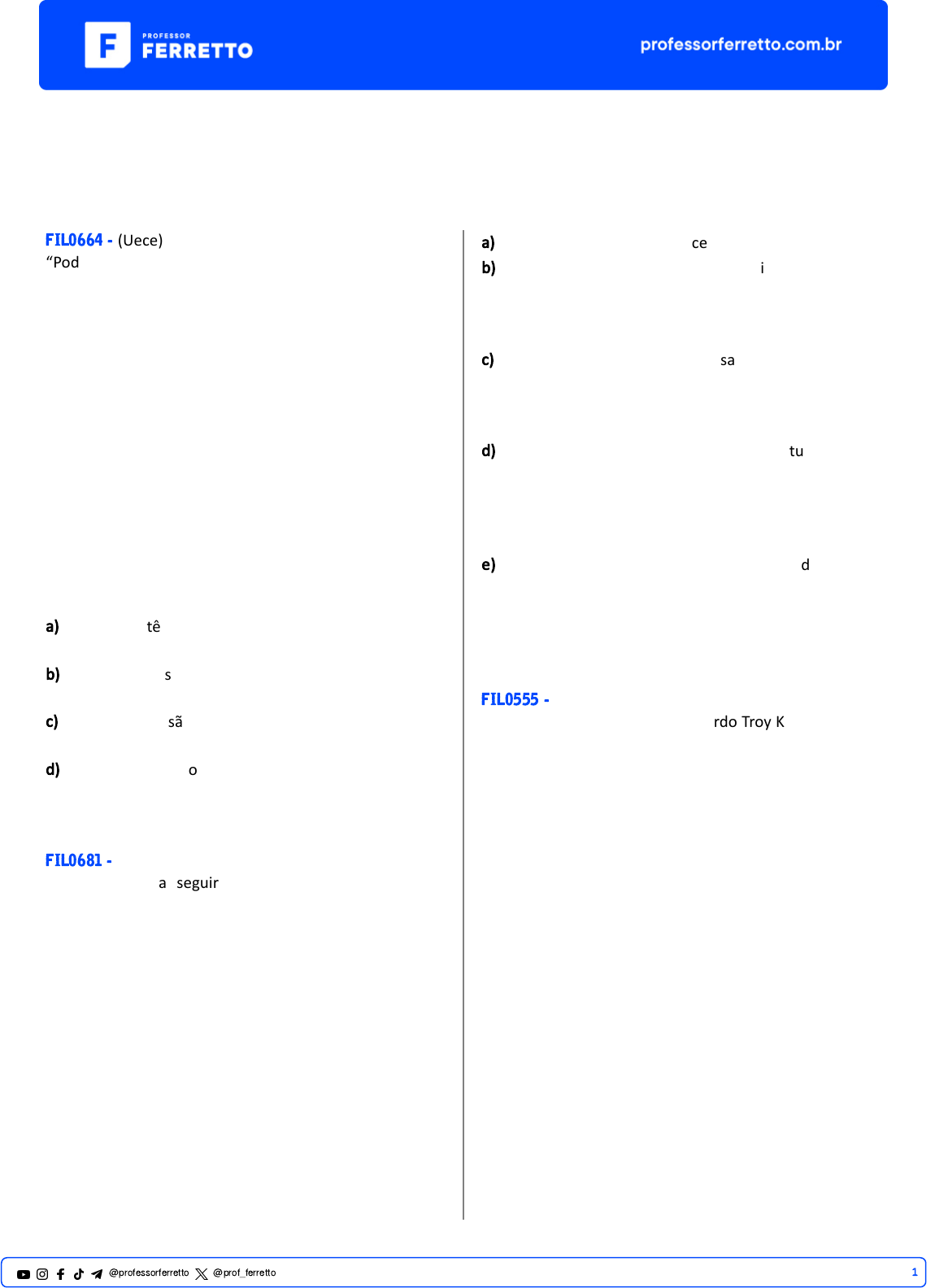 Filosofia Moderna Berkeley e Hume FIL0664 - (Uece) “Podemos dividir todas as percepções do espírito em duas classes ou espécies, que se dis�nguem por seus diferentes graus de força e vivacidade. [...] Pelo termo impressão entendo todas as percepções mais vivas, quando ouvimos, vemos, sen�mos, amamos, odiamos, desejamos ou queremos. E as impressões diferenciam-se das ideias, que são as percepções menos vivas, das quais temos consciência, quando refle�mos sobre quaisquer das sensações ou dos movimentos acima mencionados”. HUME, David. Inves�gação acerca do entendimento humano. Trad. de João Paulo Gomes Monteiro. São Paulo: Nova Cultural, 1996, p. 69-70. Coleção Os Pensadores. Com base na passagem anterior, é correto afirmar que, para Hume, a) as ideias têm como fundamento as impressões sensíveis, sen�mentais etc. b) as impressões e as ideias são duas percepções psíquicas independentes. c) as impressões são percepções do espírito; logo, são o mesmo que ideias. d) as impressões são percepções corporais, e as ideias são percepções mentais. FIL0681 - (Ufpr) As afirmações a seguir são de Hylas e foram todas re�radas do Diálogo entre Hylas e Philonous, de George Berkeley. Qual delas mostra que Hylas finalmente admi�u o idealismo defendido por seu interlocutor, Philonous? (BERKELEY, George. Três diálogos entre Hylas e Philonous. Curi�ba: UFPR. SCHLA, 2012, p. 29, 73, 37, 63 e 51, respec�vamente.) a) “Exis�r é uma coisa, ser percebido é outra.” b) “Tudo que posso fazer é formar ideias na minha própria mente. [...] E isso está longe de ser prova de que posso concebê-las exis�ndo fora das mentes de todos os espíritos.” c) “O calor e o frio são apenas sensações que existem em nossas mentes. Entretanto, ainda restam qualidades suficientes para assegurar a realidade das coisas externas.” d) “Cores, sons, sabores, resumindo, tudo aquilo denominado qualidades secundárias, certamente não existem fora da mente. Mas ao admi�-lo, não significa que eu rejeite qualquer coisa da realidade da matéria ou dos objetos externos.” e) “Considero uma grande omissão o fato de não ter dis�nguido suficientemente objeto e sensação. Embora a sensação não possa exis�r sem a mente, disso não se segue que o objeto não possa.” FIL0555 - (Uece) Na edição de 2022 do Oscar, o surdo Troy Kotsur recebeu o prêmio de melhor ator coadjuvante por sua par�cipação no filme No ritmo do Coração (2021). Essa premiação ocorreu justamente no ano em que, no Brasil, se comemoram os 20 anos da Lei que reconhece a Língua Brasileira de Sinais (Libras), aprovada em 24 de abril de 2002. No seu tempo, o filósofo francês E�enne de Condillac (1714-1780) buscou fundamentar a língua de sinais francesa em um ponto de vista filosófico. Ele o fez dizendo o seguinte sobre o ensino em língua de sinais que o Abade de l’Épeé (1712-1789), importante professor de surdos à época, oferecia às crianças surdas: “Com base na linguagem da ação, o abade De l’Epée criou uma arte metódica, simples e fácil, com a qual dá a seus pupilos ideias de todo �po e, ouso dizer, ideias mais precisas do que as que, em geral, se adquirem com a ajuda da audição. O abade De l’Epée só tem um meio de dar às crianças surdas ideias sensoriais: é analisar e fazer com que o pupilo analise junto. Assim, ele os conduz de ideias sensoriais a ideias abstratas”. CONDILLAC, E. Apud SACKS, Oliver. Vendo vozes: Uma viagem ao mundo dos surdos. Trad. bras. Laura Teixeira 1@professorferretto @prof_ferretto Mo�a. São Paulo: Companhia das Letras, 2010, p.30. Adaptado. A expressão “linguagem da ação” deve ser entendida no sen�do do que a linguís�ca atual nomeia de língua gestual-visual. Considerando a citação acima, é correto afirmar que o ponto de vista filosófico em que Condillac se baseia para jus�ficar a língua de sinais é a) idealista. b) racionalista. c) marxista. d) empirista. FIL0284 - (Ueg) David Hume nasceu na cidade de Edimburgo, em pleno Século das Luzes, denominação pela qual ficou conhecido o século XVIII. Para inves�gar a origem das ideias e como elas se formam, Hume parte, como a maioria dos filósofos empiristas, do co�diano das pessoas. Do ponto de vista de um empirista, a) não existem ideias inatas. b) não existem ideias abstratas. c) não existem ideias a posteriori. d) não existem ideias formadas pela experiência. FIL0274 - (Enem) Quando analisamos nossos pensamentos ou ideias, por mais complexos e sublimes que sejam, sempre descobrimos que se resolvem em ideias simples que são cópias de uma sensação ou sen�mento anterior. Mesmo as ideias que, à primeira vista, parecem mais afastadas dessa origem mostram, a um exame mais atento, ser derivadas dela. HUME, D. Inves�gação sobre o entendimento humano. São Paulo: Abril Cultural, 1973. Depreende-se deste excerto da obra de Hume que o conhecimento tem a sua gênese na a) convicção inata. b) dimensão apriorís�ca. c) elaboração do intelecto. d) percepção dos sen�dos. e) realidade transcendental. FIL0286 - (Ufu) O texto abaixo comenta a correlação entre ideias e impressões em David Hume. Em contrapar�da, vemos que qualquer impressão, da mente ou do corpo, é constantemente seguida por uma ideia que a ela se assemelha, e da qual difere apenas nos graus de força e vividez. A conjunção constante de nossas percepções semelhantes é uma prova convincente de que umas são as causas das outras; [...]. HUME, D. Tratado da natureza humana. São Paulo: Editora da Unesp/Imprensa Oficial do Estado, 2001. p. 29. Assinale a alterna�va que, de acordo com Hume, indica corretamente o modo como a mente adquire as percepções denominadas ideias. a) Todas as nossas ideias são formas a priori da mente e, mediante essas ideias, organizamos as respec�vas impressões na experiência. b) Todas as nossas ideias advêm das nos