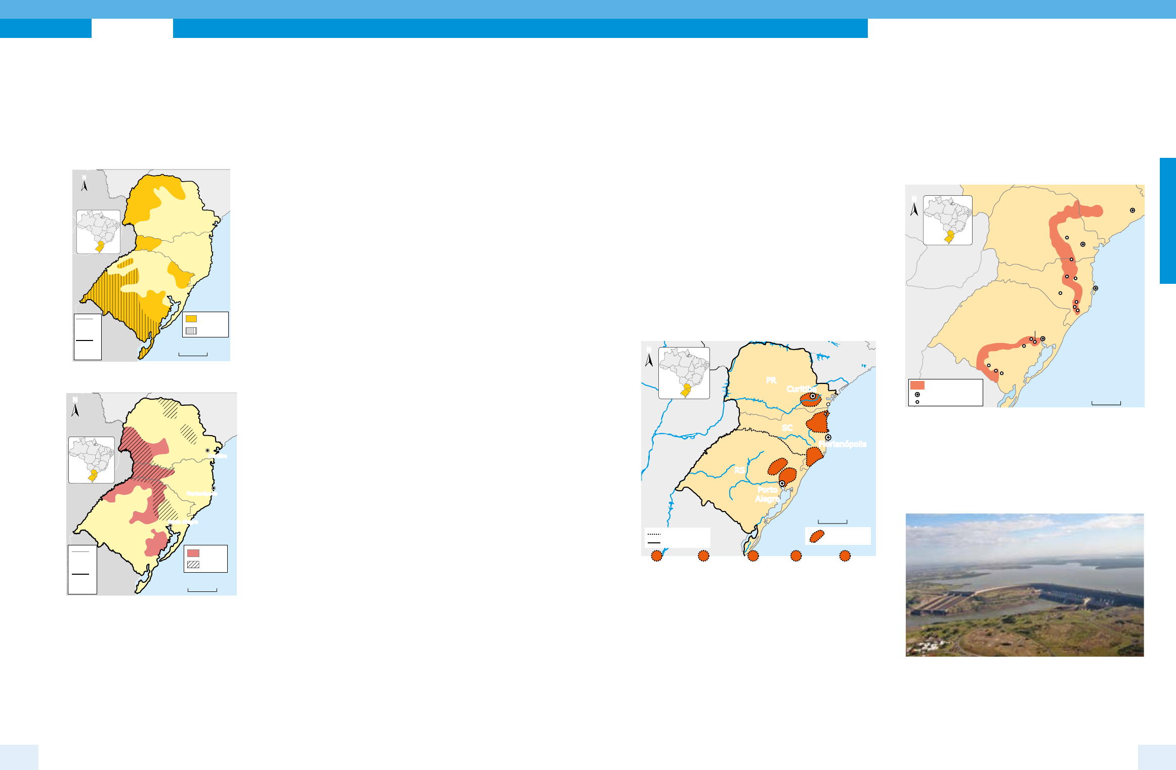 UHE Nova Avanhandava UHE Três Irmãos UHE Água Vermelha Foz do Iguaçu UHE São Simão OCEANO ATLÂNTICO PARAGUAI ARGENTINA URUGUAI MS GO MG PR SC RS RJSP MS GO MG PR SC RS RJSP IBGE. Atlas Nacional do Brasil, 2006. A distribuição de energia elétrica na região Sul é controlada pela Eletrosul, com sede em Florianópolis (SC), que estende a atuação ao estado de Mato Grosso do Sul e também a outras áreas do Brasil, devido a interligações com a rede de energia da região Sudeste. Transportes O Sul é uma das regiões mais bem servidas no setor de transportes, dispondo de condições naturais e financeiras que facilitam a implantação de uma boa malha rodoviária e ferroviária. Além disso, o fato de sua população ser bem distribuída, sem grandes vazios populacionais, permite que sua rede de transportes seja mais eficiente e lucrativa. Embora quase todas as principais cidades da região sejam servidas por linhas da Rede Ferroviária Federal (RFFSA), o transporte rodoviário é o mais desenvolvido. Duas rodovias federais são as principais vias de transporte de cargas e passageiros: a rodovia BR-101, que liga Porto Alegre a Curitiba pelo litoral, passando por Florianópolis; e a rodovia BR-116, que liga Porto Alegre a Curitiba pelo interior, passando por Lages (SC). De Curitiba a São Paulo, as rodovias se fundem na Régis Bittencourt, conhecida como a rodovia da morte, devido ao elevado número de acidentes que nela ocorrem. Como nas demais regiões do Brasil, o setor de transportes ferroviários e rodoviários necessita de investimentos que permitam a manutenção das vias já existentes e a abertura de outras novas. Atrás apenas do Sudeste e de Brasília, a região Sul possui os mais movimentados e modernos aeroportos do Brasil. Possui, ainda, vários portos marítimos em atividade: o porto de Paranaguá, que é o principal terminal graneleiro do país e exporta, principalmente, café e soja; os portos de Imbituba e Laguna, em Santa Catarina, exportadores de carvão mineral; os portos de São Francisco do Sul, Itajaí e Itapoá (o primeiro porto privado do Brasil), também em Santa Catarina, exportadores de madeira; e, finalmente, os portos de Rio Grande e Porto Alegre, no Rio Grande do Sul, pelos quais passam mercadorias diversificadas. Turismo A região Sul apresenta índices consideráveis em relação ao turismo nacional. Dados apresentados pela Embratur mostram que Florianópolis, Foz do Iguaçu, Porto Alegre e Camboriú figuram entre as cidades mais visitadas do país. O Parque Nacional do Iguaçu, onde se localizam as Cataratas do Iguaçu, é uma unidade de conservação brasileira. Está localizado no extremo oeste do estado do Paraná e possui área total de 185 262,2 hectares. Foi criado em 10 de janeiro de 1939, pelo Decreto-lei n. 1 035, e em 1986 recebeu o título, concedido pela UNESCO, de Patrimônio Mundial. J us tin O tt o / C re at iv e C om m on s Parque Nacional do Iguaçu. Durante os dias quentes de verão, as praias catarinenses são procuradas e frequentadas por turistas do Brasil inteiro e de outros países. Florianópolis, atrás apenas das cidades do Rio de Janeiro (RJ) e Salvador (BA), é uma das capitais brasileiras mais visitadas. Com o fim da crise econômica nos países do Mercosul, parte do movimento de argentinos, uruguaios e paraguaios voltou ao proveito do turismo de verão, em localidades como Balneário Camboriú e Barra Velha. Além disso, há, na região Sul, pontos turísticos considerados patrimônios da humanidade: as Cataratas do Iguaçu, no Parque Nacional do Iguaçu, no Paraná, e as Ruínas Jesuítico- -Guaranis de São Miguel das Missões, no Rio Grande do Sul. As serras gaúcha e catarinense atraem turistas no inverno rigoroso, que desejam aproveitar as temperaturas mais baixas e a neve, inclusive em Urubici (SC). Em Cambará do Sul (RS), localiza-se o Parque Nacional de Aparados da Serra, onde fica a cachoeira do Itaimbezinho. H al le y Pa ch ec o de O liv ei ra / C re at iv e C om m on s Cachoeira do Itaimbezinho. O charme e o requinte da colonização europeia de Curitiba fazem com que a capital paranaense atraia um número cada vez maior de visitantes interessados em conhecer o planejamento urbano, o Museu Oscar Niemeyer, entre outros. Curitiba concentra, também, a melhor e maior estrutura hoteleira do Sul. • Do mesmo modo, a presença da Floresta Amazônica para além dos limites da região Norte tornou o estado do Tocantins e parte dos estados de Goiás e Mato Grosso áreas de atuação da Sudam e da Superintendência do Desenvolvimento do Centro-Oeste (Sudeco). ITAIPU GERA DISPUTA ENTRE BRASIL E PARAGUAI 08 mar. 2019 BRASÍLIA - [...] Se o Paraguai aceitar contratar a energia que consome pelo preço considerado adequado pelo lado brasileiro, os consumidores do país vizinho terão de arcar com um reajuste médio de cerca de 40% [...] Itaipu costuma produzir um volume de energia excedente – muito mais barata [...]. Esse volume também deveria ser dividido igualmente entre Brasil e Paraguai, mas um acordo firmado [...] em 2009, hoje questionado pelo Brasil, dá ao Paraguai direito a uma proporção maior dessa energia mais barata. [...] Desde o ano passado, esse acordo, apesar de favorecer o Paraguai, teria sido extrapolado [...]. O Paraguai tem se apropriado de todo o volume excedente e também de parte da eletricidade a que o Brasil tem direito. A Eletrobrás [...] se recusou a pagar pelo que não recebeu. O Paraguai quer manter inalterado o volume contratado e suprir a indústria local com os excedentes [...]. WARTH, Anne. O Estado de S. Paulo. Disponível em: . Acesso em: 28 mar. 2019. [Fragmento] ITAIPU MANTÉM LIDERANÇA NA GERAÇÃO DE ENERGIA ACUMULADA Após mais de duas décadas de liderança mundial no ranking de geração de energia anual, a Usina Hidrelétrica de Itaipu foi ultrapassada, em 2014, pela chinesa Três Gargantas. Em produção acumulada, no entanto, nenhuma outra gerou tanta energia quanto 