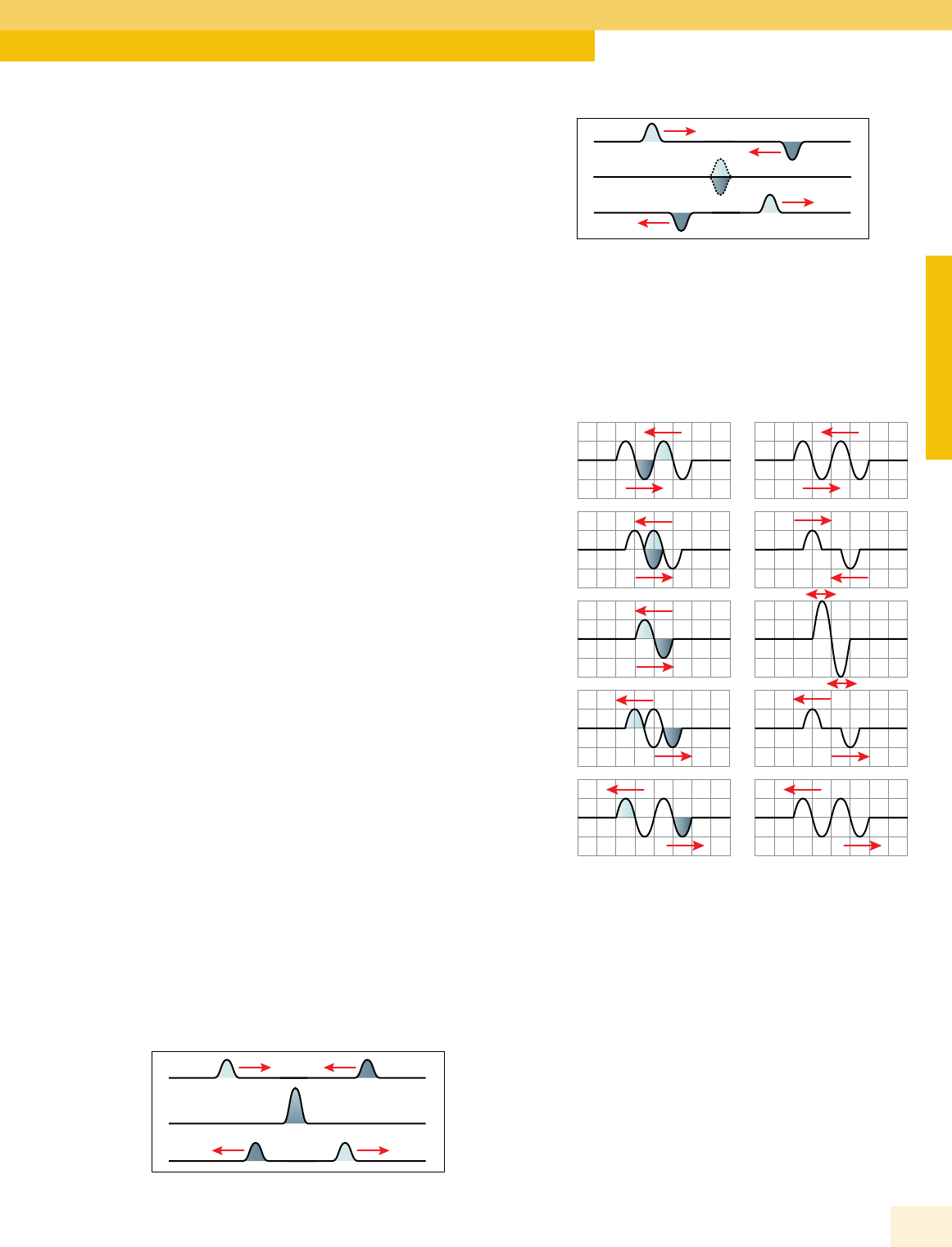 As belas cores na cauda de um pavão, por exemplo, são explicadas pela interferência da luz. Como é um fenômeno complexo, vamos analisar a interferência com o mínimo de abordagem matemática. O fenômeno da interferência é consequência de um princípio simples chamado de Princípio da Superposição. Nesta Coleção, vamos tratar apenas das ondas para as quais esse princípio é válido. A superposição ocorre quando dois ou mais pulsos ocupam, num dado instante, o mesmo lugar no espaço. Princípio da Superposição O Princípio da Superposição pode ser usado tanto para as ondas transversais quanto para as longitudinais. Vamos começar com a superposição de dois pulsos unidimensionais numa corda elástica, por exemplo. Quando dois pulsos se cruzam, numa certa posição e num dado instante, os seus efeitos se sobrepõem. Assim, cada ponto do meio deve deslocar-se, naquele instante de acordo com a “resultante” dos efeitos individuais de cada pulso. O efeito resultante pode fazer com que o deslocamento de cada ponto da corda seja maior ou menor do que aquele que ela teria se apenas um pulso se propagasse. Sejam x a elongação resultante da corda com os pulsos superpostos e x1 e x2 as elongações da corda devido a cada pulso individual. Se os pulsos têm: 1 – Elongações de mesmo sinal ⇒ |x| = |x1| + |x2| 2 – Elongações de sinais opostos ⇒ |x| = |x1| – |x2| A interferência, que acontece devido à superposição dos pulsos, pode ser de dois tipos. Se as elongações de um determinado ponto do meio, devido a cada comando individual, são somadas, a interferência é chamada de construtiva. Se as elongações são subtraídas, ela é chamada de interferência destrutiva. Um fato importante da interferência diz respeito ao que acontece com cada pulso após a superposição deles. Independentemente do tipo de interferência (construtiva ou destrutiva), após a superposição dos pulsos, cada um segue o seu caminho com as mesmas características originais. Ou seja, cada pulso mantém inalterados a forma, a fase, a velocidade, a frequência e o comprimento de onda. Veja a seguir a superposição de dois pulsos transversais em fase (a) e em oposição de fase (b). (a) (b) (a) (b) Considere dois pulsos completos, com a mesma amplitude e em oposição de fase, que se propagam em sentidos opostos ao longo de uma corda elástica, em cinco instantes de tempo. Considere cada quadriculado da figura a seguir com dimensões 2 cm . 2 cm, e que a velocidade de cada pulso seja igual a 1,0 cm/s. Dessa forma, a cada segundo, os pulsos caminham 1,0 cm. Cada figura da direita, em cada um dos instantes, mostra a onda resultante e, claro, a forma que a corda assume devido à superposição dos pulsos. t = 0 t = 1 s t = 2 s t = 3 s t = 4 s No instante t = 2 s, as cristas e os vales dos dois pulsos se superpõem. Dessa forma, a onda resultante apresenta amplitude igual a 4,0 cm. Nos instantes t = 1 s e t = 3 s, a crista de um pulso se sobrepõe ao vale do outro, e vice-versa. Assim, o efeito resultante é uma amplitude nula. Nesse caso, a interferência é destrutiva total. Você deve desenhar, em casa, as ondas resultantes, nos cinco instantes mostrados anteriormente, para dois pulsos em concordância de fase. Interferência de ondas bidimensionais Da mesma forma que ocorre com ondas unidimensionais, as ondas bidimensionais (ou tridimensionais) também sofrem interferência quando ocorre a superposição dos pulsos, no mesmo instante e em cada ponto do meio, gerados por uma ou por mais de uma fonte de ondas. Difração e Interferência de Ondas FÍ SI C A 37Bernoulli Sistema de Ensino A figura a seguir mostra duas ondas, geradas por duas fontes F1 e F2, que se propagam na água contida em uma cuba de ondas. Considere que as fontes sejam coerentes, ou seja, que elas produzam ondas com a mesma frequência e em concordância de fase. Assim, o comprimento de onda é o mesmo para as duas ondas. As linhas cheias e pontilhadas representam, respectivamente, as cristas e os vales das ondas. Considere que as duas ondas foram geradas com a mesma amplitude (A). F1 F2 Essa figura mostra um padrão de interferência. Observe que os pontos pretos indicam posições em que a interferência é destrutiva total (cristas e vales superpostos). Nesses pontos, a todo instante, a amplitude é sempre nula. A linha que une tais pontos (linha preta na figura) é chamada de linha nodal. Em todos os pontos dessas linhas, temos sempre uma interferência destrutiva total e, portanto, a água permanece em repouso. Uma rolha, por exemplo, colocada em qualquer ponto da linha nodal não oscila, ou seja, existe um padrão ou um modelo para a interferência. As bolinhas brancas mostram pontos do meio em que a interferência é totalmente construtiva (superposições de crista com crista ou de vale com vale). Nesses pontos, a amplitude resultante é máxima, e a água tem a sua maior oscilação. Um objeto flutuante, colocado em qualquer um desses pontos, oscila para cima e para baixo com uma amplitude 2A. A região compreendida entre duas linhas nodais é chamada de região ventral. Nela, a água está oscilando, para cima e para baixo, com variadas amplitudes. A fotografia a seguir mostra o padrão de interferência discutido na figura anterior. Is to ck ph ot o Observe que a fotografia mostra várias linhas nodais. Na linha central das regiões ventrais, podemos ver cristas e vales. Na região ventral, temos a noção do deslocamento das ondas no sentido radial. As ondas tridimensionais também apresentam padrão de interferência semelhante. A diferença está no fato de que elas, por se propagarem nas três dimensões do espaço, podem formar superfícies nodais (em vez de linhas) e regiões ventrais espaciais (e não planas). Devido à dificuldade de se desenhar tais padrões, eles serão omitidos. Condições de interferência Vamos tratar apenas das interferências construtiva ou destrutiva total. Considere dua
