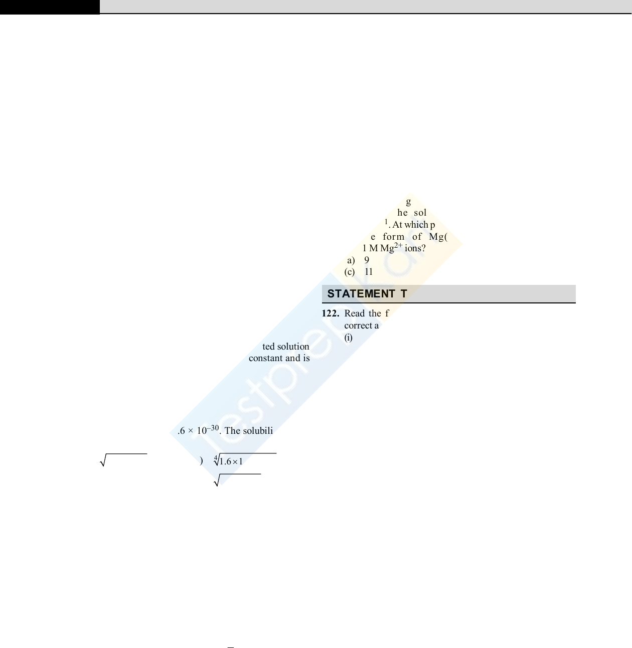 118 EQUILIBRIUM 108. What is [H+] in mol/L of a solution that is 0.20 M in CH3COONa and 0.10 M in CH3COOH ? Ka for CH3COOH = 1.8 × 10–5. (a) 3.5 × 410 (b) 1.1 × 510 (c) 1.8 × 510 (d) 9.0 × 610 109. Which of the following pairs constitutes a buffer? (a) NaOH and NaCl (b) HNO3 and NH4NO3 (c) HCl and KCl (d) HNO2 and NaNO2 110. Buffer solutions have constant acidity and alkalinity because (a) these give unionised acid or base on reaction with added acid or alkali. (b) acids and alkalies in these solutions are shielded from attack by other ions. (c) they have large excess of H+ or OH– ions (d) they have fixed value of pH 111. The buffering action of an acidic buffer is maximum when its pH is equal (a) 5 (b) 7 (c) 1 (d) pKa 112. When a buffer solution, sodium acetate and acetic acid is diluted with water : (a) Acetate ion concentration increases (b) H+ ion concentration increases (c) OH– ion conc. increases (d) H+ ion concentration remains unaltered 113. The product of ionic concentration in a saturated solution of an electrolyte at a given temperature is constant and is known as (a) Ionic product of the electrolyte (b) Solubility product (c) Ionization constant (d) Dissociation constant 114. The Ksp for Cr(OH)3 is 1.6 × 10–30. The solubility of this compound in water is : (a) 4 301.6 10 (b) 4 301.6 10 / 27 (c) 30/ 271.6 10 (d) 301.6 10 115. At 25°C, the solubility product of Mg(OH)2 is 1.0 × 10–11. At which pH, will Mg2+ ions start precipitating in the form of Mg(OH)2 from a solution of 0.001 M Mg2+ ions? (a) 9 (b) 10 (c) 11 (d) 8 116. pH of a saturated solution of Ba(OH)2 is 12. The value of solubility product (Ksp) of Ba(OH)2 is : (a) 3.3 × 10– 7 (b) 5.0 × 10–7 (c) 4.0 × 10–6 (d) 5.0 × 10–6 117. If s and S are respectively solubility and solubility product of a sparingly soluble binary electrolyte then : (a) s = S (b) s = S2 (c) 1/ 2s S (d) 1s S 2 118. Why only As+3 gets precipitated as As2S3 and not Zn+2 as ZnS when H2S is passed through an acidic solution containing As+3 and Zn+2? (a) Solubility product of As2S3 is less than that of ZnS (b) Enough As+3 are present in acidic medium (c) Zinc salt does not ionise in acidic medium (d) Solubility product changes in presence of an acid 119. Solid Ba(NO3)2 is gradually dissolved in a 1.0 × 10–4 M Na2CO3 solution. At which concentration of Ba2+, precipitate of BaCO3 begins to form ? (Ksp for BaCO3 = 5.1 × 10–9) (a) 5.1 × 10–5 M (b) 7.1 × 10–8 M (c) 4.1 × 10–5 M (d) 8.1 × 1–7 M 120. Solubility product of silver bromide is 5.0 × 10–13. The quantity of potassium bromide (molar mass taken as 120 g mol–1) to be added to 1 litre of 0.05 M solution of silver nitrate to start the precipitation of AgBr is (a) 1.2 × 10–10 g (b) 1.2 × 10–9 g (c) 6.2 × 10–5 g (d) 5.0 × 10–8 g 121. At 25°C, the solubility product of Mg(OH)2 is 1.0 × 10–11. At which pH, will Mg2+ ions start precipitating in the form of Mg(OH)2 from a solution of 0.001 M Mg2+ ions? (a) 9 (b) 10 (c) 11 (d) 8 STATEMENT TYPE QUESTIONS 122. Read the following statements carefully and choose the correct answer (i) Water and water vapour remain in equilibrium position at atmospheric pressure (1.013 bar) and at 100°C in a closed vessel. (ii) The boiling point of water is 100°C at 1.013 bar pressure (iii) Boiling point of the liquid depends on the atmospheric pressure. (iv) Boiling point depends on the altitude of the place; at high altitude the boiling point increases. (a) (i), (ii) and (iv) are correct (b) (i), (iii) and (iv) (c) (i), (ii) and (iii) are correct (d) only (iii) is correct 123. You must have seen that when a soda water bottle is opened, some of the carbon dioxide gas dissolved in it fizzes out rapidly. There is equilibrium between the molecules in the gaseous state and the molecules dissolved in the liquid under pressure i.e., CO2(gas) CO2(in solution) Which of the following statements is/are correct regarding this? (i) The phenomenon arises due to difference in solubility of carbon dioxide at different pressures. (ii) This equilibrium is governed by Henry's law. (iii) The amount of CO2 gas dissolved in liquid increases with decrease of temperature. (iv) The amount of CO2 gas dissolved in liquid decreases with increase of temperature. (a) (i), (ii) and (iv) are correct (b) (i) , (iii) and (iv) (c) (i), (ii) and (iii) are correct (d) only (iii) is correct EQUILIBRIUM 119 124. Identify the CORRECT statements below regarding chemical equilibrium: (i) All chemical reactions which are in equilibrium are irreversible. (ii) Equilibrium is achieved when the forward reaction rate equals the reverse reaction rate. (iii) Equilibrium is achieved when the concentrations of reactants and product remain constant. (iv) Equilibrium is dynamic in nature (a) (i), (ii) and (iv) are correct (b) (i), (ii), (iii) and (iv) are correct (c) (i), (ii) and (iii) are correct (d) only (ii) is correct 125. Nobel gas is added to a reaction at equilibrium involving gaseous reactant and gaseous product. Which of the following statement is true for above reaction? Statement 1 : Reaction will proceed forward, as total pressure has increased due to addition of Nobel gas. Statement 2 : Reaction will proceed backward, if Nobel gas react with reactant. (a) Statement 1 and 2 are both correct. (b) Statement 1 is correct but statement 2 is incorrect. (c) Statement 1 is incorrect but statement 2 is correct. (d) Statement 1 and 2 both are incorrect. 126 Read the following statements and choose the correct option. (i) The value of equilibrium constant is independent of initial concentrations of the reactants and products. (ii) Equilibrium constant is temperature dependent (iii) The equilibrium constant for the reverse reaction is equal to the inverse of the equilibrium constant for the forward reaction. (iv) The equilibrium constant for the reverse reaction is equal to the equilibrium constant for the forward reaction. (a) (i), (ii) and (iv) are correct (b) (i)