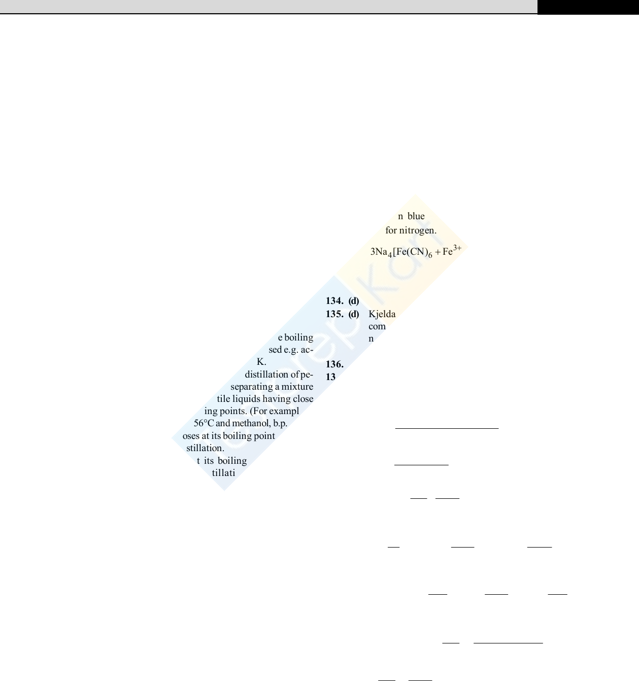 ORGANIC CHEMISTRY – SOME BASIC PRINCIPLES & TECHNIQUES 199 109. (b) In elimination reactions one or two molecules are lost from the substrate to form a multiple bond. Dehydration of ethanol is an example of elimination reaction. 2 4 Conc 2 5 2 2 2H SO C H OH CH CH H O . 110. (a) 111. (d) 112. (a) 113. (b) Coloured impurities are removed by adsorbing over activated charcoal. 114. (a) This method is applied for the purification of substances which (i) are insoluble in water, (ii) are volatile in steam, (iii) are associated with non steam volatile impurities, (iv) have high molecular weights and (v) possess a fairly high vapour pressure at about the boiling point of water e.g. Aniline. 115. (a) Aniline is purified by steam distillation. A mixture of water and aniline boils at 371 K and 760 mm pressure which is less than boiling point of water. 116. (b) Among the given compounds naphthelene is volatile but benzoic acid is non-volatile (it forms a dimer). So, the best method for their separation is sublimation, which is applicable to compounds which can be converted directly into the vapour phase from its solid state on heating and back to the solid state on cooling. Hence it is the most appropriate method. 117. (d) 118. (b) If there is a small difference (10 or less) in the boiling points of liquids fractional distillation is used e.g. ac- etone b.p. 333 K and methanol b.p. 338 K. 119. (a) Fractional distillation is used for the distillation of pe- troleum. This method is used for separating a mixture of two or more miscible, volatile liquids having close (less than 40 degrees) boiling points. (For example, a mixture of acetone, b.p., 56°C and methanol, b.p. 65°C) 120. (c) If any liquid decomposes at its boiling point, it can be purified by vacuum distillation. 121. (c) Glycerol decomposes at its boiling point, hence it should be purified by distillation under reduced pressure. 122. (c) Vaccum distillation means distillation under reduced pressure. 123. (c) 124. (a) The latest technique for the purification of organic compounds is chromatography. These are of various types like column, paper and gas-chromatography. 125. (d) Both silica gel and alumina are used as adsorbents in adsorption chromatography. 126. (a) Chromatography paper contains water trapped in it, which acts as the stationary phase. 127. (c) The mixture of sugars is a homogenous one. Homogeneous mixtures of a solvent and one or more solutes (dissolved substances) are often separated by chromatography. Chromatography works to separate a mixture because the components of a mixture distribute themselves differently when they are in contact with a “two phase system”. One phase is stationary and the other is moving or mobile. The stationary phase may be a solid packed in a tube or a piece of paper. The mobile phase may be liquid of gaseous. 128. (b) 129. (b) 130. (b) Carbon and hydrogen are detected by heating the compound with copper (II) oxide. Carbon present in the compound is oxidised to CO2 and hydrogen to H2O. 131. (b) 132. (b) Hydrazine (NH2NH2) does not contain carbon and hence on fusion with Na metal, it cannot form NaCN; consequently hydrazine does not show Lassaigne’s test for nitrogen. 133. (a) Prussian blue 364 ])CN(Fe[Fe is formed in lassaigne test for nitrogen. 3 4 63Na [Fe(CN) Fe 4 4 3 Prussian blue Fe [Fe(CN) ] 12Na 134. (d) 135. (d) Kjeldahl method is not applicable to any of the given compounds. As nitrogen of these compounds does not change to ammonium sulphate on heating with conc. H2SO4. 136. (c) 137. (b) 138. (b) In Kjeldahl’s method nitrogen is converted into (NH4)2 SO4, then to NH3 139. (d) To increase the bpt of H2SO4,K2SO4 is added 140. (b) N% 1.4 N V wt.of organic compound 1.4 29 1/ 5 16.24% 0.5 141. (b) 10100 32.0 233.0 233 32Sof% % 142. (c) As in above question, 40 13.33 46.67C 3.33; H 13.33; N 3.34 12 1 14 Relative No. of atoms, 3.33 13.33 3.34C 1; H 4; N 1 3.33 3.33 3.33 Empirical formula = CH4N 143. (b) Percentage of P = 222 62 × compoundof.wt OPMgof.wt 722 × 100 = 222 62 × 79.2 332.1 × 100 = 13.33% 200 ORGANIC CHEMISTRY – SOME BASIC PRINCIPLES & TECHNIQUES 144. (a) % of element Relative Simple ratio no. of atoms C 38.8 38.8 3.2 12 1 H 16.0 16 16.0 1 5 N 45.28 45.28 3.2 14 1 145. (b) Compound heat O2 + Other gaseous products 1373K 2 (A) 2C O 2CO 2 5 2 2 (A) (C)(B) I O 5CO I 5CO STATEMENT TYPE QUESTIONS 146. (c) A carbon having an sp hybrid orbital with 50% s-character is more electronegative than carbon atoms having sp2 and sp3 hybrid orbitals with 33% and 25% s-character respectively. In CH2 = C = CHCH3 Number of bonds : C – C = 3, C – H = 6, total = 6 + 3 = 9 Number of bonds = 2 147. (a) heat or light R – X R +X Above equation is an example of homolytic cleavge 148. (c) – CH3 is an electron donating group. 149. (b) The resonance structures have same positions of nuclei and same number of unpaired electrons. 150. (b) Fractional distillation method is used if the difference in boiling points of two liquids is not much. 151. (d) For statement (ii), RF = Distance moved by thesubstancefrom baseline Distance moved by thesolvent from base line For statement (iv), amino acids sports may be detected by spraying the TLC plate with ninhydrin solution. 152. (b) 42SOK raises bpt. and 4CuSO acts as catalyst. 153. (d) When organic compound contains nitrogen, upon combustion it will produce oxides of nitrogen soluble in KOH solution. The copper will convert them into 2N 2NO + 2Cu 2CuO + 2N 2 2NO + 4Cu 4CuO + 2N etc. Halogens will be removed as AgX. In case of sulphur 2SO formed will be removed as 4PbSO . MATCHING TYPE QUESTIONS 154. (b) 155. (c) 156. (a) 157. (c) 158. (a) 159. (a) 160. (d) 161. (a) 162. (b) 163. (d) 164. (c) 165. (a) ASSERTION-REASON TYPE QUESTIONS 166. (c) – CN is a secondary suffix. 167. (b) 168. (d) The correct name of the given compound is 2, 5, 6 -trimethyloctane 169. (c) 170. (d) 171. (c) Benzene has a uniform C – C bond distance of 139 pm, a value intermediate