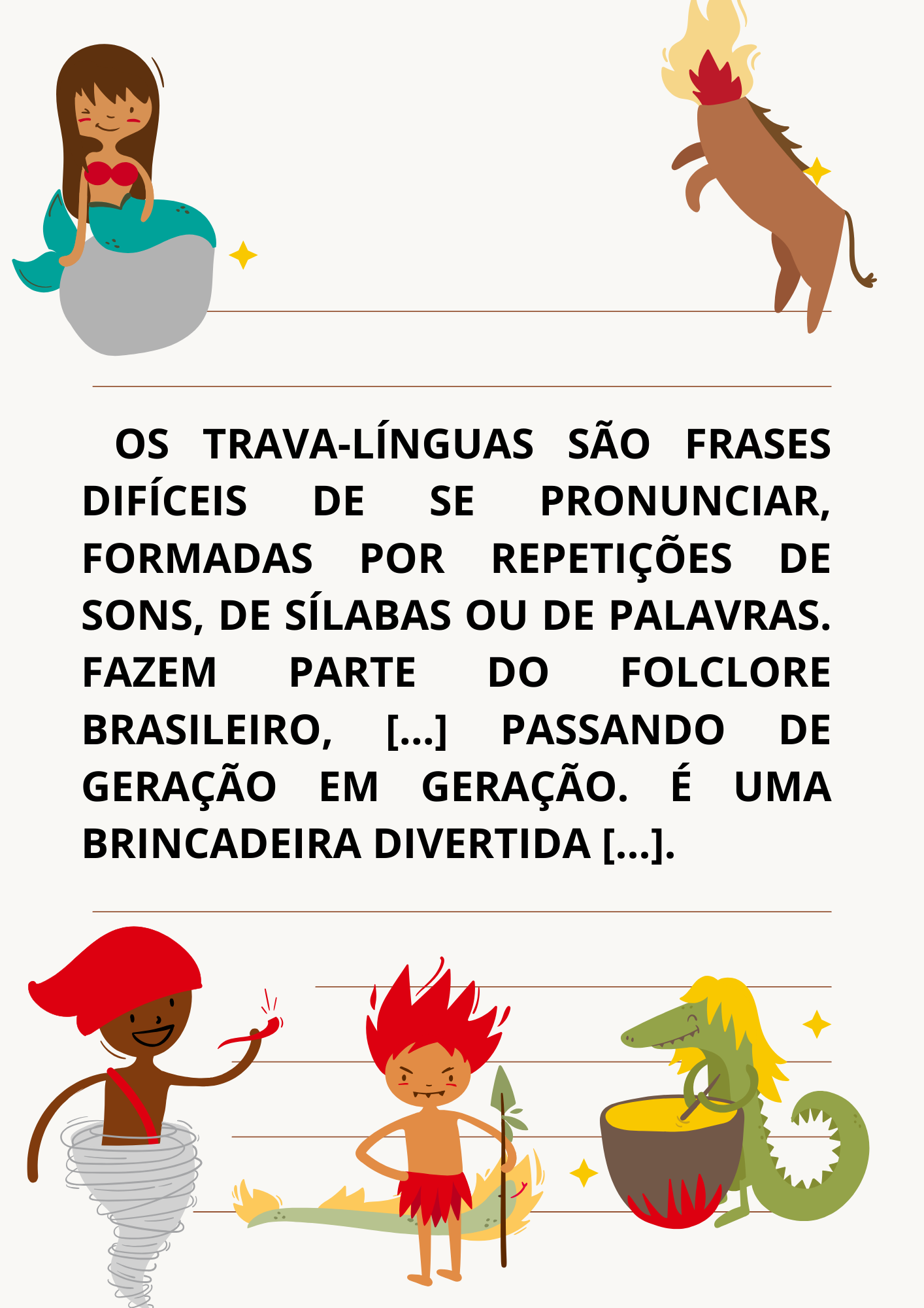 os TRAVA-LÍNGUAS SÃO FRASES DIFÍCEIS DE SE PRONUNCIAR, FORMADAS POR REPETIÇÕES DE SONS, DE SÍLABAS OU DE PALAVRAS. FAZEM PARTE DO FOLCLORE BRASILEIRO, [...] PASSANDO DE GERAÇÃO EM GERAÇÃO. É UMA BRINCADEIRA DIVERTIDA [...].