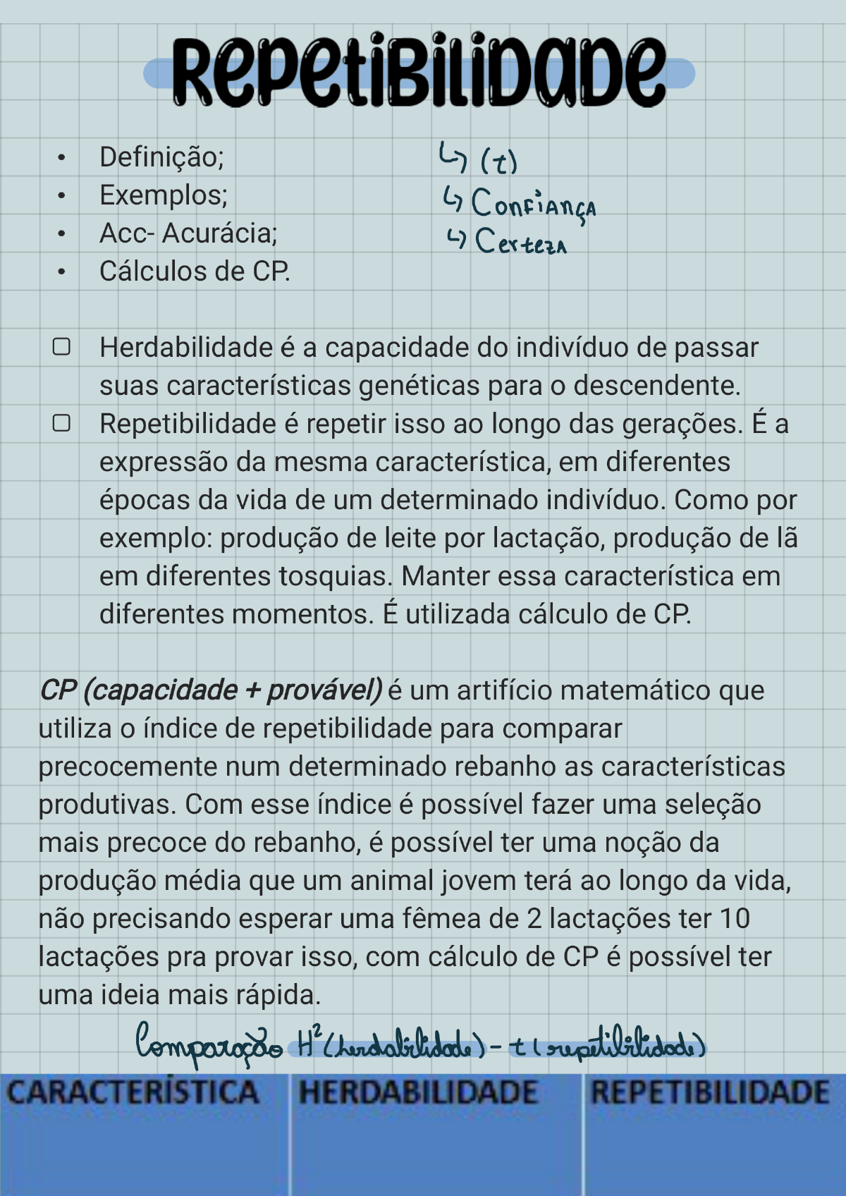 Definição; (t) Exemplos; Acc- Acurácia; Certeza Cálculos de CP. Herdabilidade é a capacidade do indivíduo de passar suas características genéticas para o descendente. Repetibilidade é repetir isso ao longo das gerações. É a expressão da mesma característica, em diferentes épocas da vida de um determinado indivíduo. Como por exemplo: produção de leite por lactação, produção de em diferentes tosquias. Manter essa característica em diferentes momentos. É utilizada cálculo de CP. CP (capacidade + provável) é um artifício matemático que utiliza índice de repetibilidade para comparar precocemente num determinado rebanho as características produtivas. Com esse índice é possível fazer uma seleção mais precoce do rebanho, é possível ter uma noção da produção média que um animal jovem terá ao longo da vida, não precisando esperar uma fêmea de 2 lactações ter 10 lactações pra provar isso, com cálculo de CP é possível ter uma ideia mais rápida. - t CARACTERÍSTICA HERDABILIDADE REPETIBILIDADEPeso a desmama 0,25 - - de 100% - 25% = 75% transmission genetica AOL 0,03 0,05 Forma do ovo 0,5 0,9 + AOL: Área de olho de lombo: É a medida da espessura do contra filé, que é músculo longíssumus dorsi, ou seja, é a medida da espessura do lombo do animal. Quanto maior AOL, maior rendimento de carcaça. Peso a desm: há 50% de confiança que irá ocorrer 25% de transmissão genética, logo 75% de influência do ambiente. Forma do ovo tem 90% de confiança que haverá transmissão genética de 50%, ou 50% de influência do ambiente. AOL: 5% de confiança que haverá 3% de transmissão genética, logo 97% de influencia do meio. A) 0,7 B) H=0,6 / t=0,95 y) + de ACORRELAÇÃO GENÉTICA Definição; Pleiotropia e linkage; Tipos de correlação genética. 24 y 22 6 20 18 4 14 2 12 10 0 300 0 2 4 6 Pleiotropia é quando um único gene, determina duas ou mais características. Ex: mosca Drosophila melanogaster Um determinado gene dominante determina ao mesmo tempo menor tempo de vida e menor tempo de fecundidade. Linkage são genes ligados, é a ocorrência de genes muito próximos entre si que promovendo a expressão de duas ou mais característica. Correlação positiva e correlação negativa: Correlação positiva é quando as características são diretamente proporcionais, ou seja, quando uma aumenta, a outra também aumenta. Ex: tamanho de úbere e produção de leite. Quanto maior o úbere, maior a produção de leite.CE= Circunferência escrotal. Quanto maior a CE, maior a fertilidade do animal. Relação entre comprimento de umbigo e desenvolvimento de barbela. Quanto maior o comprimento de umbigo, maior desenvolvimento de barbela. ideal é tamanho intermediário. Menor = Pouco desenvolvimento / Maior = Grandes chances de traumatismos. Correlação negativa é quando as características são inversamente proporcionais, ou seja, são antagônicas. Correlação de meio é a relação existente entre uma determinada característica fenotípica e o ambiente. Como por exemplo produção de leite e temperatura ambiental. Trata-se de uma correlação negativa. Seleção É o ato de separar dentro de uma determinada população os indivíduos aptos ou não a cumprirem determinada tarefa. Processo de melhoramento genético e não de acasalamento. Aumentar a frequência genética favorável. O objetivo é diminuir a frequência dos genes de feitos desfavoráveis. Hibridação: é a reprodução entre indivíduos de espécies diferentes, como por exemplo a reprodução entre o jumentoe a égua que resulta no burro ou mula. Cruzamento: é a reprodução entre indivíduos da mesma espécie, porém de raças diferentes. Acasalamento: é a reprodução entre indivíduos da mesma espécie e da mesma raça. Seleção artificial Nesta existe interferência humana, onde predominam os indivíduos portadores da melhor combinação genética possível. Tipos de seleção artificial: S. A. por tipo ou aparência: enzoognósia. Enzoognósia é padrão morfológico, ou seja, o padrão racial, são características externas de um animal. O critério é subjetivo, pois, muitas vezes que é mais bonito para alguém, não necessariamente é mais bonito para outro. S. A por habilidade ou função: aqui levamos em consideração aspecto produtivo, portanto, o critério é objetivo e mensurável. Objetivo porque não depende de quem está observando e mensurável porque ele é medido. Seleção natural Não tem interferência humana, é qualquer fator natural que consiga alterar uma frequência gênica. Ex: Pode ser o chamado boi pantaneiro (ex. de raças podem ser: Jofreano, Curraleiro, Pé duro). Na seleção natural sobrevivem os mais resistentes, porém,isso acaba comprometendo fator produtivo.