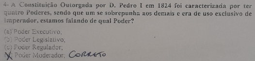 4- A Constituição Outorgada por D. Pedro I em 1824 foi caracterizada por ter quatro Poderes, sendo que um se sobrepunha demais e era de uso exclusivo de estamos falando de qual Poder? (a) Poder (b) Poder (c) Poder Poder CORRETO