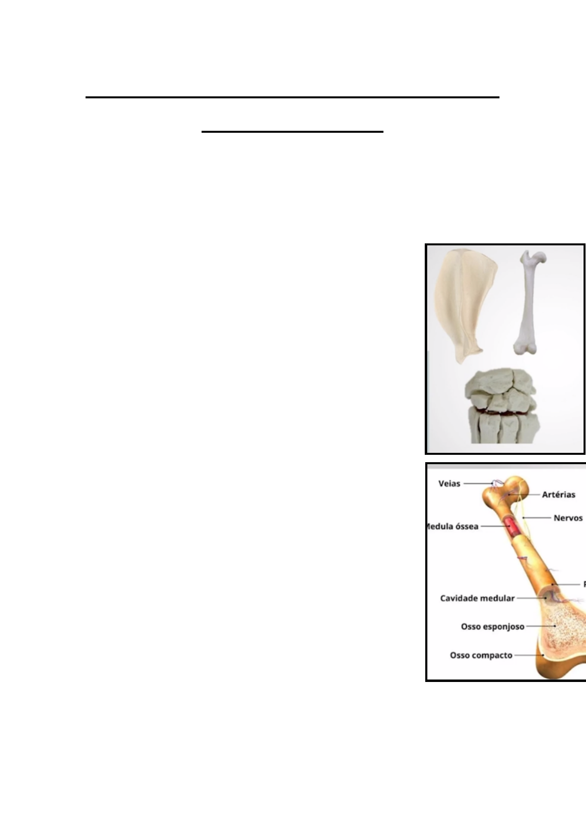 Certifica Vet - Ortopedia de A a Z - Aula 1º - 17/04: → Anatomia do sistema locomotor: Sistema responsável pela sustentação e movimento do indivíduo. Composto por ossos e articulações. Osteologia + sindesmologia (estudo do osso e da articulação). Ação conjunta com sistema muscular → sistema locomotor. Classificação dos ossos. - Classificação dos ossos: 1. Planos; 2. Longos; 3. Curtos; 4. Irregulares; Dimensões tridimensionais, dependendo de sua espessura e largura. Relacionados a sustentação e movimentação do animal. Os ossos curtos estão dispostos sobre a força exercida na pisada, ou seja, possuem a mesma conformidade para auxiliar no impacto. (“Amortecimento”) O osso é uma estrutura viva, mesmo havendo uma grande parte de sua estrutura mineralizada, ele é um componente essencial para o nosso organismo, e não estamos falando somente da sustentação e locomoção, mas sim também pela sua produção de sangue via medula óssea. Ao longo de todo o osso possuímos uma cobertura, que seria o osso compacto. Em suas extremidades encontraremos o osso esponjoso, que nada menos que é uma estrutura trabeculada, preenchida por um tecido chamada de médula vermelha, osso mais frágil mas responsável pela nutrição das células presentes nos ossos. As células nutridas pelo osso esponjoso (Células osteoprogenitoras) presentes são osteoblasto, osteócito e osteoclasto. Osteoblasto produz osteócito, que são as principais células presentes no esqueleto. Osteoclasto é responsável pela limpeza e renovação desse tecido ósseo, eliminando células velhas para novas. Chamada de medula vermelha ou medula óssea, preenchida por um tecido hematopoiético trazendo a função de renovação das células do sangue. Possuímos canais, chamados de Havers e Volkmann, onde passam e distribuem os nutrientes do osso compacto até o osso esponjoso, sendo distribuído em toda a estrutura óssea. Periósteo é super importante para a regeneração óssea. Em procedimentos cirúrgicos de fraturas ou de exposição óssea, devemos preservar o periósteo. → Divisão do Esqueleto: O esqueleto axial está constituído de região cervical, coluna, costelas, lombar e sacral. Já o apendicular está correlacionado com os membros posteriores e inferiores, iniciando-se de escápulas (posterior) e coxais (inferiores). Em exceção possuímos os ossos viscerais: osso peniano (Machos de cães e gatos) e clavícula vestigial (Gatos e raramente em cães). ● Esqueleto Axial - Cabeça: Curioso entendermos que a região cervical possui “suturas” que dividem cada osso presente nesta cavidade. Outra curiosidade é entender que dependendo da raça, a disposição, conformação e formato do crânio é diferente. O comprimento do crânio do animal irá definir se ele é braquicefálico (Pug) ou dolicocefálico. Osso distal + Osso nasal + Osso maxilar + Osso lacrimal + Osso zigomático + Osso frontal + Osso temporal + Osso parietal + Osso occipital. ● Esqueleto Axial - Coluna: C7 - Cervical. T13 - Torácica. L7 - Lombar. S3 - Sacral. Ca20 a 23 - Caudal. A primeira vértebra da cervical, C1, é chamada de atlas, pelo fato da divisão de crânio à coluna vertebral. Em caudal possuímos o exis que é um dos maiores vértebras, não possuindo disco intervertebral – Articulação atlantoaxial. Em Torácica possuímos processo espinhoso mais desenvolvido. Em sacral processos transversais. ● Esqueleto Apendicular - Membro torácico e pélvico: Escápula muito importante para o deslocamento. Ûmero é um osso longo. Junção rádio e ulna. Carpo, metacarpo e falanges. Articulação escápulo-umeral, articulação ûmero-rádio-ulnar, metacarpo-ulnar, carpica e metacarpica. Pelve, coxal, fêmur, tíbia e fíbula, tarso, metatarso e falanges. PATELA!! Articulação coxo-femoral, fêmur-tíbio-ulnar, társica e metatarsica.