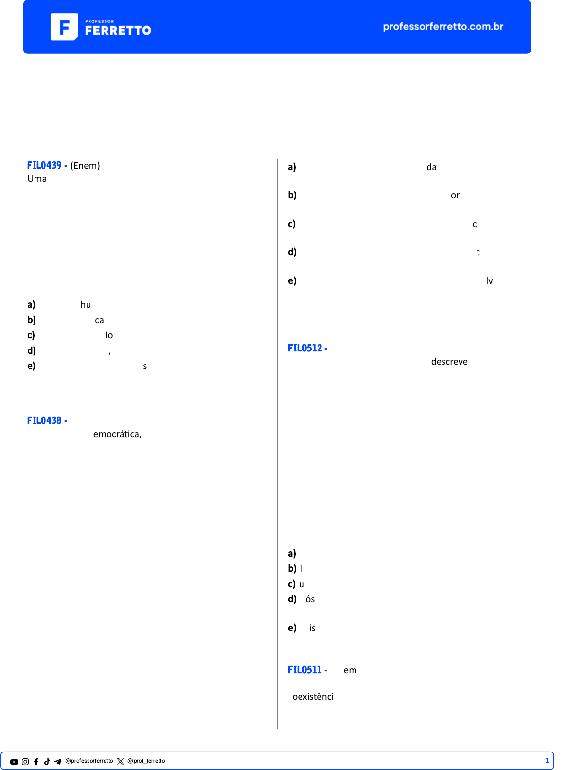 ENEM Filosofia Contemporânea FIL0439 - (Enem) Uma norma só deve pretender validez quando todos os que possam ser concernidos por ela cheguem (ou possam chegar), enquanto par�cipantes de um discurso prá�co, a um acordo quanto à validade dessa norma. HABERMAS, J. Consciência moral e agir comunica�vo. Rio de Janeiro: Tempo Brasileiro, 1989. Segundo Habermas, a validez de uma norma deve ser estabelecida pelo(a) a) liberdade humana, que consagra a vontade. b) razão comunica�va, que requer um consenso. c) conhecimento filosófico, que expressa a verdade. d) técnica cien�fica, que aumenta o poder do homem. e) poder polí�co, que se concentra no sistema par�dário. FIL0438 - (Enem) Na sociedade democrá�ca, as opiniões de cada um não são fortalezas ou castelos para que neles nos encerremos como forma de autoafirmação pessoal. Não só temos de ser capazes de exercer a razão em nossas argumentações, como também devemos desenvolver a capacidade de ser convencidos pelas melhores razões. A par�r dessa perspec�va, a verdade buscada é sempre um resultado, não ponto de par�da: e essa busca inclui a conversação entre iguais, a polêmica, o debate, a controvérsia. A ideia de democracia presente no texto, baseada na concepção de Habermas acerca do discurso, defende que a verdade é um(a) a) alvo obje�vo alcançável por cada pessoa, como agente racional autônomo. b) critério acima dos homens, de acordo com o qual podemos julgar quais opiniões são as melhores. c) construção da a�vidade racional de comunicação entre os indivíduos, cujo resultado é um consenso. d) produto da razão, que todo indivíduo traz latente educa�vo. e) resultado que se encontra mais desenvolvido nos espíritos elevados, a quem cabe a tarefa de convencer os outros. FIL0512 - (Enem) Em A morte de Ivan IIitch, Tolstoi descreve com detalhes repulsivos o terror de encarar a morte iminente. Ilitch adoece depois de um pequeno acidente e logo compreende que se encaminha para o fim de modo impossível de parar. “Nas profundezas de seu coração, ele sabia estar morrendo, mas em vez de se acostumar com a ideia, simplesmente não o fazia e não conseguia compreendê-la”. KAZEZ, J. O peso das coisas: filosofia para o bem-viver. Rio de Janeiro: Tinta Negra, 2004. O texto descreve a experiência do personagem de Tolstoi diante de um aspecto incontornável de nossas vidas. Esse aspecto foi um tema central na tradição filosófica a) marxista, no contexto do materialismo histórico. b) logicista, no propósito de entendimento dos fatos. c) u�litarista, no sen�do da racionalidade das ações. d) pós-modernista, na discussão da fluidez das relações. e) existencialista, na questão do reconhecimento de si. FIL0511 - (Enem) Em sen�do geral e fundamental, Direito é a técnica da coexistência humana, isto é, a técnica voltada a tornar possível a coexistência dos homens. Como técnica, o 1@professorferretto @prof_ferretto Direito se concre�za em um conjunto de regras (que, nesse caso, são leis ou normais); e tais regras têm por objeto o comportamento intersubje�vo, isto é, o comportamento recíproco dos homens entre si. ABBAGNANO, N. Dicionário de Filosofia. São Paulo: Mar�ns Fontes, 2007. O sen�do geral e fundamental do Direito, conforme foi destacado, refere-se à a) aplicação de códigos legais. b) regulação do convívio social. c) legi�mação de decisões polí�cas. d) mediação de conflitos econômicos. e) representação da autoridade cons�tuída. FIL0464 - (Enem) O momento histórico das disciplinas é o momento em que nasce uma arte do corpo humano, que visa não unicamente o aumento das suas habilidades, nem tampouco aprofundar sua sujeição, mas a formação de uma relação que no mesmo mecanismo o torna tanto mais obediente quanto é mais ú�l, e inversamente. Forma-se então uma polí�ca das coerções, que são um trabalho sobre o corpo, uma manipulação calculada de seus elementos, de seus gestos, de seus comportamentos. FOUCAULT, M. Vigiar e punir: história da violência nas prisões. Petrópolis: Vozes, 1987. Na perspec�va de Michel Foucault, o processo mencionado resulta em a) declínio cultural. b) segregação racial. c) redução da hierarquia. d) totalitarismo dos governos. e) modelagem dos indivíduos. FIL0410 - (Enem) TEXTO I Aquele que não é capaz de pertencer a uma comunidade ou que dela não tem necessidade, porque se basta a si mesmo, não é em nada parte da cidade, embora seja quer um animal, quer um deus. ARISTÓTELES.A polí�ca. São Paulo: Mar�ns Fontes, 2002. TEXTO II Nenhuma vida humana, nem mesmo a vida de um eremita em meio à natureza selvagem, é possível sem um mundo que, direta ou indiretamente, testemunhe a presença de outros seres humanos. ARENDT, H. A condição humana. Rio de Janeiro: Forense, 1995. Associados a contextos históricos dis�ntos, os fragmentos convergem para uma par�cularidade do ser humano, caracterizada por uma condição naturalmente propensa à a) a�vidade contempla�va. b) produção econômica. c) ar�culação cole�va. d) criação ar�s�ca. e) crença religiosa. FIL0409 - (Enem) Hoje, a indústria cultural assumiu a herança civilizatória da democracia de pioneiros e empresários, que tampouco desenvolvera uma fineza de sen�do para os desvios espirituais. Todos são livres para dançar e para se diver�r, do mesmo modo que, desde a neutralização histórica da religião, são livres para entrar em qualquer uma das inúmeras seitas. Mas a liberdade de escolha da ideologia, que reflete sempre a coerção econômica, revela-se em todos os setores como a liberdade de escolher o que é sempre a mesma coisa. ADORNO, T; HORKHEIMER, M. Dialé�ca do esclarecimento: fragmentos filosóficos. Rio de Janeiro: Zahar, 1985. A liberdade de escolha na civilização ocidental, de acordo com a análise do texto, é um(a) a) legado social. b) patrimônio polí�co. 