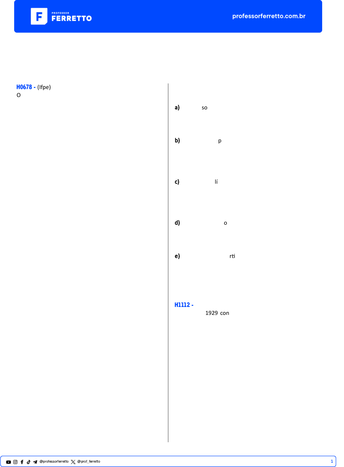 Idade Contemporânea Crise de 1929, Nazi-fascismo e Revolução Russa H0678 - (Ifpe) O que a chamada imprensa liberal fez antes da Guerra foi cavar um túmulo para a nação alemã e para o Reich. Não precisamos dizer nada sobre os men�rosos jornais marxistas. Para eles, o men�r é tão necessário como, para os gatos, o miar. Seu único obje�vo é quebrar as forças de resistência da nação, preparando-a para a escravidão do capitalismo internacional e dos seus senhores, os judeus. Que fez o Governo para resis�r a esse envenenamento em massa do povo alemão? Nada, absolutamente nada! Alguns fracos decretos, algumas multas por ofensas tão graves que não podiam ser desprezadas, e nada mais! Esperava-se conquistar as simpa�as desses pes�lentos através de lisonjas, do reconhecimento do “valor” da imprensa, de sua “significação”, da sua “missão educadora” e outras imbecilidades. Os judeus, porém, recebiam essas demonstrações com um sorriso de raposa e retribuíam com um astucioso agradecimento. A razão para essa ignominiosa renúncia do Governo não estava no desconhecimento do perigo, mas em uma covardia que gritava aos céus e na indecisão que, em consequência disso, caracterizava todas as resoluções tomadas. Ninguém �nha a coragem de “empregar meios radicais”, ao contrário disso, todos porfiavam em prescrever receitas homeopá�cas e, em vez de dar-se um golpe certeiro na víbora, aumentava-se a sua capacidade de envenenar. O resultado é que não só tudo ficou pior do que dantes como a ins�tuição que se deveria combater tomou cada dia maior vulto. HITLER, Adolf. Minha Luta, pp. 107-108. Disponível em: h�ps://docs.google.com/viewer? a=v&pid= sites&srcid=dGFyZGluLm5ldHxmaXNpY2F8Z3g6MWE1MTdkOTNlZjcxMTVkMw. Acesso em: 04 out. 2018. O Par�do Nacional Socialista dos Trabalhadores Alemães, mais conhecido como Par�do Nacional-Socialista ou Nazista, cresceu nos anos 1920 e assumiu o poder na Alemanha na década seguinte. Surgia com o obje�vo máximo de “resgatar a dignidade do povo alemão”, como disse o historiador Ronaldo Vainfas em sua obra “História: o mundo por um fio – do século XX ao XXI”. A par�r do texto e de seus conhecimentos sobre princípios e prá�cas nazistas, é CORRETO afirmar que a) o discurso hitlerista, construído no período de crise da democracia liberal, foi marcado pelo extremismo de direita, pelo racismo e pela eugenia, e lançou as bases da violência futura contra judeus e demais minorias. b) os judeus, por sua própria corrupção moral, envenenavam o povo alemão com ideias que não pertenciam à cultura verdadeiramente alemã, o que despertou o clima de perseguição polí�ca que culminou com o Holocausto. c) o principal líder do Par�do Nazista, Adolf Hitler, desejava uma imprensa imparcial e justa, livre de men�ras e de falso intelectualismo, o que explica a escolha do Ministro da Propaganda Joseph Goebbels. d) o an�ssemis�smo foi provocado pela própria imprensa judaica e marxista, que men�a para o povo alemão, já cansado da crise econômica e das humilhantes imposições do Tratado de Versalhes. e) os membros do Par�do Nazista, pelo menos no início, conscientes que eram do valor da imprensa liberal e das liberdades de expressão nos anos 1920, tentaram negociar com a imprensa judaica. H1112 - (Ifce) “A crise de 1929 consis�u, acima de tudo, numa queda generalizada da produção em quase todo o mundo industrializado (com exceção da URSS e do Japão). Convém primeiro entendê-la a par�r desse aspecto, u�lizando para isso os grandes indicadores da a�vidade econômica, que são índices de produção e de trocas comerciais, bem como as taxas de desemprego”. (2010, p.09). GAZIER, B. A crise de 1929.) A grande crise do capitalismo nas décadas de 20 e 30 repercu�u diretamente no Brasil impactando na exportação do principal produto de exportação da época que era 1@professorferretto @prof_ferretto a) café. b) trigo. c) soja. d) algodão. e) petróleo. H0681 - (C�mg) Leia a descrição deste personagem: “Hans. Alemão. Amigo ín�mo de Curto Chivito. Conhece- o faz tempo. Fala pouco. Come pouco. Mas bebe um bocado. Anda sempre com uma garrafinha de Steinhäger no bolso do blazer, perto do coração. Dada a atual situação de seu país, decidiu ir embora. Aceitou o convite de Curto Chivito para viver no Uruguai e juntos tocarem o museu. No futuro, talvez se casem.” STTIGER, Veronica. Opisanie Świata. São Paulo, Sesi, 2018, p. 73. A situação aludida no texto refere-se à conjuntura polí�ca da Alemanha a par�r de 1933. Hans buscava escapar da a) polí�ca cultural do ministério de Himmler que definia manifestações ar�s�cas do Roman�smo como arte degenerada. b) ascensão do par�do nazista e suas leis discriminatórias que legalizava a violência contra judeus, comunistas e homossexuais. c) campanha moralista promovida pelo ministério de Goebbels que tornava o alcoolismo um crime contra a pátria. d) doutrina racista defendida pelo regime alemão que dificultava a permanência de imigrantes la�nos no país. H1103 - (Integrado) Leia os textos apresentados. Texto 1 Até 1932, 5 mil bancos americanos haviam falido, a produção industrial caíra 46%, o Produto interno Bruto (PIB) diminuíra um terço e os preços, a metade. [...] Indústrias e comerciantes reduziram preços, produção e, mais importante, emprego. Texto 2 Programas de planejamento regional, obras públicas e subsídios à construção civil tentaram animar a economia enquanto diversos esquemas de previdência e empregos públicos foram implementados para mi�gar o desemprego. KARNAL, Leandro. História dos Estados Unidos: das origens ao século XXI. São Paulo: Contexto, 2016. Assinale a alterna�va que iden�fica, RESPECTIVAMENTE, a crise e o plano econômico apresentados nos fragmentos. a) Crise do Encilhamento e o Funding Loan. b) A Grande Depressão e o 